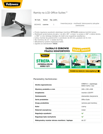 Ramię na LCD Office Suites™ Nr kat. Kolor Op. jedn. 8034401 czarne ● ● ● ● ● ● 1 Inwentaryzacja - możliwość dokonywania zakupów zawieszona Prosta regulacja wysokości płaskiego monitora TFT/LCD zwiększa komfort pracy Możliwość przechylania do góry i na dół o 90°, w lewo i w prawo o 180° a także obrotu o 360° w celu łatwego dostępu do kabli oraz wygodnej współpracy Łatwy montaż do powierzchni o szerokości do 64 mm, grubości do 51 mm Na monitory do 21'' o wadze do 9 kg Wbudowany system organizacji kabla Zgodne ze standardem VESA Parametry techniczne: Strefa ergonomiczna STREFA 3 - zapobiegaj bólom karku i szyi Wymiary produktu w mm 240 x 150 x 626 Urządzenie: monitor LCD/TFT Zastosowanie stanowisko stacjonarne Serie produktów Office Suite Grupy produktów ramiona pod monitory Kolor czarny Materiał zewnętrzny metal Regulacja wysokości Regulacja kąta nachylenia Maksymalny rozmiar ekranu monitora / laptopa do 21"