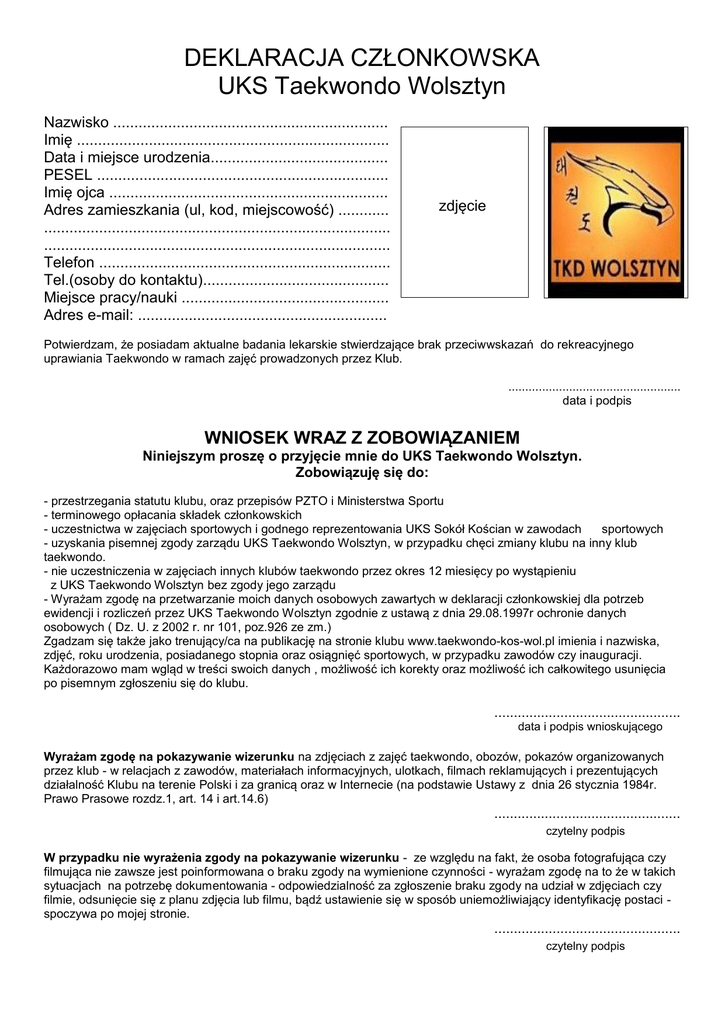 DEKLARACJA CZŁONKOWSKA UKS Taekwondo Wolsztyn Nazwisko ................................................................. Imię .......................................................................... Data i miejsce urodzenia.......................................... PESEL ..................................................................... Imię ojca .................................................................. Adres zamieszkania (ul, kod, miejscowość) ............ .................................................................................. .................................................................................. Telefon ..................................................................... Tel.(osoby do kontaktu)............................................ Miejsce pracy/nauki ................................................. Adres e-mail: ........................................................... zdjęcie Potwierdzam, że posiadam aktualne badania lekarskie stwierdzające brak przeciwwskazań do rekreacyjnego uprawiania Taekwondo w ramach zajęć prowadzonych przez Klub. ................................................... data i podpis WNIOSEK WRAZ Z ZOBOWIĄZANIEM Niniejszym proszę o przyjęcie mnie do UKS Taekwondo Wolsztyn. Zobowiązuję się do: - przestrzegania statutu klubu, oraz przepisów PZTO i Ministerstwa Sportu - terminowego opłacania składek członkowskich - uczestnictwa w zajęciach sportowych i godnego reprezentowania UKS Sokół Kościan w zawodach sportowych - uzyskania pisemnej zgody zarządu UKS Taekwondo Wolsztyn, w przypadku chęci zmiany klubu na inny klub taekwondo. - nie uczestniczenia w zajęciach innych klubów taekwondo przez okres 12 miesięcy po wystąpieniu z UKS Taekwondo Wolsztyn bez zgody jego zarządu - Wyrażam zgodę na przetwarzanie moich danych osobowych zawartych w deklaracji członkowskiej dla potrzeb ewidencji i rozliczeń przez UKS Taekwondo Wolsztyn zgodnie z ustawą z dnia 29.08.1997r ochronie danych osobowych ( Dz. U. z 2002 r. nr 101, poz.926 ze zm.) Zgadzam się także jako trenujący/ca na publikację na stronie klubu www.taekwondo-kos-wol.pl imienia i nazwiska, zdjęć, roku urodzenia, posiadanego stopnia oraz osiągnięć sportowych, w przypadku zawodów czy inauguracji. Każdorazowo mam wgląd w treści swoich danych , możliwość ich korekty oraz możliwość ich całkowitego usunięcia po pisemnym zgłoszeniu się do klubu. ................................................ data i podpis wnioskującego Wyrażam zgodę na pokazywanie wizerunku na zdjęciach z zajęć taekwondo, obozów, pokazów organizowanych przez klub - w relacjach z zawodów, materiałach informacyjnych, ulotkach, filmach reklamujących i prezentujących działalność Klubu na terenie Polski i za granicą oraz w Internecie (na podstawie Ustawy z dnia 26 stycznia 1984r. Prawo Prasowe rozdz.1, art. 14 i art.14.6) ................................................ czytelny podpis W przypadku nie wyrażenia zgody na pokazywanie wizerunku - ze względu na fakt, że osoba fotografująca czy filmująca nie zawsze jest poinformowana o braku zgody na wymienione czynności - wyrażam zgodę na to że w takich sytuacjach na potrzebę dokumentowania - odpowiedzialność za zgłoszenie braku zgody na udział w zdjęciach czy filmie, odsunięcie się z planu zdjęcia lub filmu, bądź ustawienie się w sposób uniemożliwiający identyfikację postaci spoczywa po mojej stronie. ................................................ czytelny podpis
