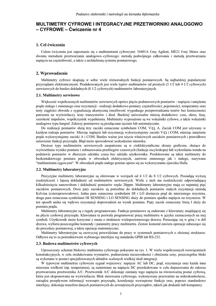 Podstawy elektroniki i metrologii na kierunku Informatyka MULTIMETRY CYFROWE I INTEGRACYJNE PRZETWORNIKI ANALOGOWO – CYFROWE – Ćwiczenie nr 4 1. Cel ćwiczenia Celem ćwiczenia jest zapoznanie się z multimetrami cyfrowymi: 34401A f-my Agilent, ME21 f-my Metex oraz dwoma metodami przetwarzania analogowo–cyfrowego: metodą podwójnego całkowania i metodą przetwarzania napięcia na częstotliwość, a także z architekturą systemu pomiarowego. 2. Wprowadzenie Multimetry cyfrowe skupiają w sobie wiele różnorodnych funkcji pomiarowych. Są najbardziej popularnymi przyrządami elektronicznymi. Produkowanych jest wiele typów multimetrów od prostych (3 1/2 lub 4 1/2 cyfrowych) serwisowych do bardzo dokładnych (8 1/2 cyfrowych) multimetrów laboratoryjnych. 2.1. Multimetry serwisowe Większość współczesnych multimetrów serwisowych oprócz pięciu podstawowych pomiarów - napięcia i natężenia prądu stałego i zmiennego oraz rezystancji - realizuje dodatkowo pomiary częstotliwości, pojemności, temperatury oraz testy ciągłości obwodu z sygnalizacją akustyczną (możliwość wygodnego przeprowadzania testów bez konieczności patrzenia na wyświetlacz), testy tranzystorów i diod. Bardziej uniwersalne mierzą dodatkowo: czas, okres, fazę, szerokość impulsów, współczynnik wypełnienia. Multimetry wyposażone są we wskaźniki cyfrowe, a także wskaźniki analogowe typu bargraf. Zakresy pomiarowe są przełączane ręcznie lub automatycznie. Do realizacji pomiarów służą trzy zaciski oznaczone symbolami COM, V/Ω, A. Zacisk COM jest używany w każdym rodzaju pomiarów. Mierząc napięcie lub rezystancję wykorzystujemy zaciski V/Ω i COM, mierząc natężenie prądu wykorzystujemy zaciski A i COM. Bardzo ważne jest użycie właściwych zacisków pomiarowych i prawidłowe ustawienie funkcji przyrządu. Błąd może spowodować uszkodzenie miernika. Droższe typy multimetrów serwisowych zaopatrzone są w ciekłokrystaliczne ekrany graficzne, służące do wyświetlania wyniku pomiaru i zobrazowania przebiegów czasowych (funkcja oscyloskopu) lub wykreślania trendu na podstawie pomiarów w dłuższym odcinku czasu bez udziału użytkownika. Produkowane są także multimetry do bezkontaktowego pomiaru prądu w obwodach elektrycznych, zarówno zmiennego jak i stałego, nazywane "multimetrami cęgowymi". W obwodach prądu stałego pomiar opiera się na wykorzystaniu zjawiska Halla. 2.2. Multimetry laboratoryjne Precyzyjne multimetry laboratoryjne są oferowane w wersjach od 4 1/2 do 8 1/2 cyfrowych. Posiadają wyższą rozdzielczość i lepszą dokładność od multimetrów serwisowych. Wiele z nich ma rozdzielczość odpowiadającą kilkudziesięciu nanowoltom i dokładność pomiarów rzędu 20ppm. Multimetry laboratoryjne mają co najmniej pięć zacisków pomiarowych. Dwie pary zacisków są potrzebne do dokładnych pomiarów małych rezystancji metodą Kelvina (czteroprzewodowo). Jedna para oznaczona symbolami HI i LO dostarcza prąd do mierzonego rezystora, druga para oznaczona symbolami HI SENSING i LO SENSING służy do pomiaru spadku napięcia na rezystorze. W ten sposób unika się wpływu rezystancji doprowadzeń na wynik pomiaru. Piąty zacisk oznaczony literą I służy do pomiaru prądu. Multimetry laboratoryjne są z reguły programowane. Funkcje pomiarowe są zadawane z klawiatury znajdującej się na płycie czołowej przyrządu. Klawiatura ta pozwala programować pracę multimetru w języku zaznaczonych na niej symboli. Użytkownik może korzystać z menu o strukturze wielopoziomowego drzewa. Poruszając się w górę i w dół drzewa, wybiera poszczególne komendy i parametry pracy multimetru. Zestaw komend zawiera operacje odnoszące się do procedury pomiarowej, a także operacje matematyczne. Multimetry laboratoryjne są zazwyczaj przewidziane do pracy w systemach pomiarowych o złożonej strukturze. Odbywa się to za pośrednictwem wybranego interfejsu wg standardu GPIB lub RS-232. 2.3. Budowa multimetrów cyfrowych Uproszczony schemat blokowy multimetru cyfrowego pokazano na rys. 1. W wielu współczesnych rozwiązaniach konstrukcyjnych, w celu zredukowania wymiarów, podniesienia niezawodności i obniżenia ceny, poszczególne bloki są wykonane w postaci specjalizowanych układów scalonych wielkiej skali integracji. W typowym multimetrze cyfrowym sygnał wejściowy: napięcie AC lub DC, prąd, rezystancja oraz każda inna mierzona wielkość (np. temperatura), są zamieniane na napięcie DC przeskalowane w celu dopasowania do zakresu przetwarzania przetwornika A/C. Przetwornik A/C dokonuje zamiany tego napięcia na równoważną postać cyfrową, która jest eksponowana na wyświetlaczu. Blok sterowania cyfrowego, wykonywany przeważnie na mikrokontrolerze, zarządza przepływem informacji wewnątrz przyrządu, koordynuje wewnętrzne funkcje oraz, poprzez standardowe interfejsy, dokonuje transferu danych pomiarowych do zewnętrznych przyrządów, takich jak drukarki lub komputery. 1 Podstawy elektroniki i metrologii na kierunku Informatyka Kondycjoner sygnału wejściowego We Przetwornik A/C Układ ekspozycji wyniku IEC-625 RS-232 Układ sterowania Rys. 1. Schemat blokowy multimetru Przetwornik skali napięcia zmiennego AC Hi I DC Ω Przetwornik I/U A Przetwornik AC/DC AC DC Przetwornik skali napięcia stałego do przetwornika A/C Ω Przetwornik R/U COM Rys. 2. Bloki funkcjonalne kondycjonera sygnału wejściowego Kondycjoner sygnału wejściowego może być dalej podzielony na bloki funkcjonalne, jak pokazuje rys. 2. Na schemacie tym przełączniki wyboru funkcji, przetworniki skali, przetwornik R/U, rezystor wzorcowy do pomiaru prądu i przetwornik AC/DC są odrębnymi blokami. Jest to typowe, ale nie jedyne, rozwiązanie. Pomiar prądu realizowany jest w multimetrach metodą pomiaru spadku napięcia na wewnętrznym wzorcowym rezystorze. Rezystor wzorcowy jest dobierany do zakresu pomiarowego, na przykład: 0,1 Ω dla zakresów 3 A i 
