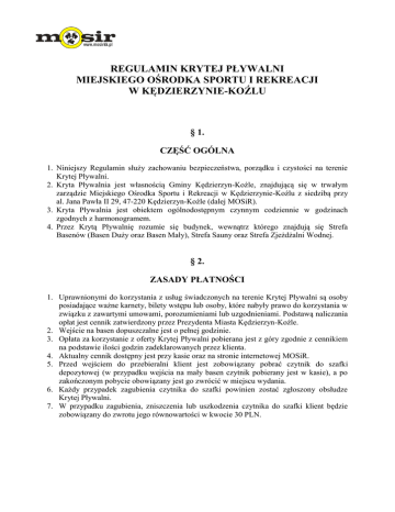 REGULAMIN KRYTEJ PŁYWALNI MIEJSKIEGO OŚRODKA SPORTU I REKREACJI W KĘDZIERZYNIE-KOŹLU § 1. CZĘŚĆ OGÓLNA 1. Niniejszy Regulamin służy zachowaniu bezpieczeństwa, porządku i czystości na terenie Krytej Pływalni. 2. Kryta Pływalnia jest własnością Gminy Kędzierzyn-Koźle, znajdującą się w trwałym zarządzie Miejskiego Ośrodka Sportu i Rekreacji w Kędzierzynie-Koźlu z siedzibą przy al. Jana Pawła II 29, 47-220 Kędzierzyn-Koźle (dalej MOSiR). 3. Kryta Pływalnia jest obiektem ogólnodostępnym czynnym codziennie w godzinach zgodnych z harmonogramem. 4. Przez Krytą Pływalnię rozumie się budynek, wewnątrz którego znajdują się Strefa Basenów (Basen Duży oraz Basen Mały), Strefa Sauny oraz Strefa Zjeżdżalni Wodnej. § 2. ZASADY PŁATNOŚCI 1. Uprawnionymi do korzystania z usług świadczonych na terenie Krytej Pływalni są osoby posiadające ważne karnety, bilety wstępu lub osoby, które nabyły prawo do korzystania w związku z zawartymi umowami, porozumieniami lub uzgodnieniami. Podstawą naliczania opłat jest cennik zatwierdzony przez Prezydenta Miasta Kędzierzyn-Koźle. 2. Wejście na basen dopuszczalne jest o pełnej godzinie. 3. Opłata za korzystanie z oferty Krytej Pływalni pobierana jest z góry zgodnie z cennikiem na podstawie ilości godzin zadeklarowanych przez klienta. 4. Aktualny cennik dostępny jest przy kasie oraz na stronie internetowej MOSiR. 5. Przed wejściem do przebieralni klient jest zobowiązany pobrać czytnik do szafki depozytowej (w przypadku wejścia na mały basen czytnik pobierany jest w kasie), a po zakończonym pobycie obowiązany jest go zwrócić w miejscu wydania. 6. Każdy przypadek zagubienia czytnika do szafki powinien zostać zgłoszony obsłudze Krytej Pływalni. 7. W przypadku zagubienia, zniszczenia lub uszkodzenia czytnika do szafki klient będzie zobowiązany do zwrotu jego równowartości w kwocie 30 PLN. § 3. ODPOWIEDZIALNOŚĆ I OBOWIĄZKI KLIENTA KRYTEJ PŁYWALNI 1. Kryta Pływalnia, a także poszczególne Strefy posiadają własne regulaminy i zasady korzystania udostępnione w widocznym miejscu przy wejściu na Krytą Pływalnie lub do poszczególnych Stref. Wszelkie regulaminy, instrukcje i zasady korzystania są także dostępne na stronie internetowej MOSiR (www.mosirkk.pl) 2. Przed wejściem na teren Krytej Pływalni lub skorzystaniem z jej urządzeń klient jest zobowiązany do zapoznania się z ich regulaminami oraz wewnętrznymi instrukcjami, a z chwilą wejścia na teren Krytej Pływalni lub zakupu biletu uprawniającego do skorzystania z poszczególnych Stref potwierdza zapoznanie się z nimi oraz zobowiązuje się przestrzegać ich postanowień. 3. Klienci zobowiązani są również do przestrzegania zakazów i nakazów w formie tablic informacyjnych oraz znaków umieszczonych na terenie Krytej Pływalni, a także poleceń jej obsługi. 4. Dzieci przed ukończeniem 10 roku życia mogą przebywać na terenie obiektu Krytej Pływalni oraz korzystać z jej urządzeń wyłącznie pod opieką osób pełnoletnich. 5. Nieprzestrzeganie postanowień regulaminów, wewnętrznych instrukcji, zakazów i nakazów oraz zasad bezpieczeństwa może prowadzić do wypadków. 6. Przed skorzystaniem z usług Krytej Pływalni klient ma obowiązek pozostawić odzież oraz pozostałe mienie w skutecznie i poprawnie zamkniętej szafce. W pozostałym zakresie MOSiR nie odpowiada za rzeczy pozostawione przez klienta w innych miejscach publicznie dostępnych, niezabezpieczonych przed dostępem osób trzecich. 7. Osoby ze skłonnościami do skurczu mięśni, omdleń, ataków epilepsji, zaburzeń równowagi, schorzeń układu krążenia są zobowiązane poinformować obsługę o dolegliwościach przed skorzystaniem z urządzeń, którejkolwiek ze Stref oraz pozostawać pod nadzorem opiekuna. Korzystanie z urządzeń Krytej Pływalni przez wskazane osoby odbywa się na ich odpowiedzialność. 8. Na terenie Krytej Pływalni zabrania się podejmowania czynności zagrażających utrzymaniu bezpieczeństwa, spokoju i porządku w szczególności: a) wstępu osób znajdujących się w stanie po spożyciu alkoholu, środków odurzających lub innych podobnie działających substancji, a także wnoszenia ich na teren Krytej Pływalni; b) spożywania alkoholu; c) wnoszenia żywności, napojów lub innych towarów w opakowaniach szklanych; d) palenia tytoniu, w tym e-papierosów, za wyjątkiem miejsc do tego przeznaczonych; e) używania sprzętu ratowniczego i wyposażenia Krytej Pływalni do innych celów niż jest przeznaczony lub używanie sprzętu ratowniczego i wyposażenia Krytej Pływalni w stanie uszkodzonym, nieczynnym lub niesprawnym technicznie; f) niszczenia oraz usuwania oznakowania, tablic oraz informacji; g) wszczynania fałszywych alarmów; h) hałaśliwego zachowania; i) biegania, popychania; j) wnoszenia sprzętu muzycznego i grającego bez zgody administratora obiektu; k) przebywania w miejscach wyłączonych z ogólnego dostępu; l) wnoszenia poza strefę szatni jakichkolwiek przedmiotów niebezpiecznych, w szczególności opakowań szklanych, pojemników ciśnieniowych (dezodorantów, lakierów do włosów), noży i innych ostrych przedmiotów; m) wprowadzania zwierząt; n) podejmowania zachowań mogących wywołać u innych zażenowanie, a w szczególności obcowanie płciowe i inne czyny, które mogą zostać potraktowane jako zachowanie nieobyczajne w rozumieniu Kodeksu Wykroczeń; o) załatwiania potrzeb fizjologicznych poza toaletami; p) prowadzenia, bez pisemnego zezwolenia MOSiR, jakiejkolwiek działalności, a w szczególności działalności handlowej, w tym prowadzenia zajęć, treningów i lekcji lub nauk, marketingowej i usługowej, w tym rozprowadzania ulotek, sprzedaży towarów, oferowania i wykonywania usług; r) filmowania lub fotografowania na terenie Strefy Sauny oraz przebieralni, w pozostałej części Krytej Pływalni fotografowanie oraz filmowanie do celów innych niż prywatne wymaga