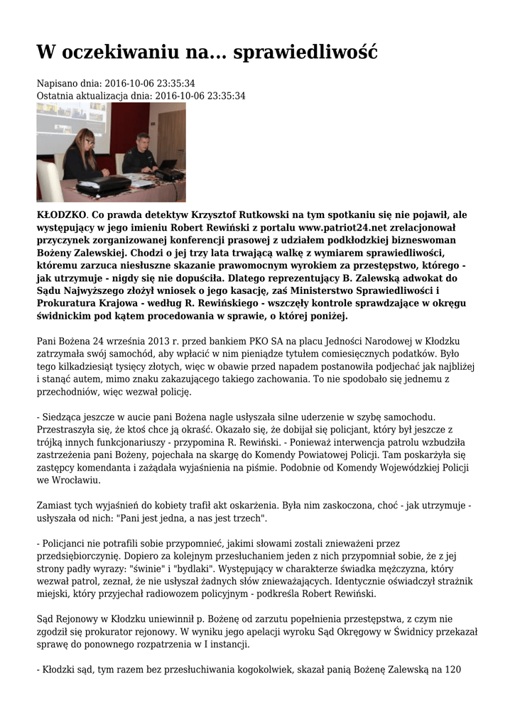W oczekiwaniu na... sprawiedliwość Napisano dnia: 2016-10-06 23:35:34 Ostatnia aktualizacja dnia: 2016-10-06 23:35:34 KŁODZKO. Co prawda detektyw Krzysztof Rutkowski na tym spotkaniu się nie pojawił, ale występujący w jego imieniu Robert Rewiński z portalu www.patriot24.net zrelacjonował przyczynek zorganizowanej konferencji prasowej z udziałem podkłodzkiej bizneswoman Bożeny Zalewskiej. Chodzi o jej trzy lata trwającą walkę z wymiarem sprawiedliwości, któremu zarzuca niesłuszne skazanie prawomocnym wyrokiem za przestępstwo, którego jak utrzymuje - nigdy się nie dopuściła. Dlatego reprezentujący B. Zalewską adwokat do Sądu Najwyższego złożył wniosek o jego kasację, zaś Ministerstwo Sprawiedliwości i Prokuratura Krajowa - według R. Rewińskiego - wszczęły kontrole sprawdzające w okręgu świdnickim pod kątem procedowania w sprawie, o której poniżej. Pani Bożena 24 września 2013 r. przed bankiem PKO SA na placu Jedności Narodowej w Kłodzku zatrzymała swój samochód, aby wpłacić w nim pieniądze tytułem comiesięcznych podatków. Było tego kilkadziesiąt tysięcy złotych, więc w obawie przed napadem postanowiła podjechać jak najbliżej i stanąć autem, mimo znaku zakazującego takiego zachowania. To nie spodobało się jednemu z przechodniów, więc wezwał policję. - Siedząca jeszcze w aucie pani Bożena nagle usłyszała silne uderzenie w szybę samochodu. Przestraszyła się, że ktoś chce ją okraść. Okazało się, że dobijał się policjant, który był jeszcze z trójką innych funkcjonariuszy - przypomina R. Rewiński. - Ponieważ interwencja patrolu wzbudziła zastrzeżenia pani Bożeny, pojechała na skargę do Komendy Powiatowej Policji. Tam poskarżyła się zastępcy komendanta i zażądała wyjaśnienia na piśmie. Podobnie od Komendy Wojewódzkiej Policji we Wrocławiu. Zamiast tych wyjaśnień do kobiety trafił akt oskarżenia. Była nim zaskoczona, choć - jak utrzymuje usłyszała od nich: "Pani jest jedna, a nas jest trzech". - Policjanci nie potrafili sobie przypomnieć, jakimi słowami zostali znieważeni przez przedsiębiorczynię. Dopiero za kolejnym przesłuchaniem jeden z nich przypomniał sobie, że z jej strony padły wyrazy: "świnie" i "bydlaki". Występujący w charakterze świadka mężczyzna, który wezwał patrol, zeznał, że nie usłyszał żadnych słów znieważających. Identycznie oświadczył strażnik miejski, który przyjechał radiowozem policyjnym - podkreśla Robert Rewiński. Sąd Rejonowy w Kłodzku uniewinnił p. Bożenę od zarzutu popełnienia przestępstwa, z czym nie zgodził się prokurator rejonowy. W wyniku jego apelacji wyroku Sąd Okręgowy w Świdnicy przekazał sprawę do ponownego rozpatrzenia w I instancji. - Kłodzki sąd, tym razem bez przesłuchiwania kogokolwiek, skazał panią Bożenę Zalewską na 120 godzin prac społecznych wykonywanych przez pół roku. Sprawa znów trafiła do sądu okręgowego, jednak długo nie była podjęta. Chyba dlatego, że w międzyczasie do Ministra Sprawiedliwości trafiła skarga na procedowanie przez tutejszy wymiar sprawiedliwości - zauważa dziennikarz portalu www.patriot24.net. Po kilku miesiącach Sąd Okręgowy w Świdnicy utrzymał w mocy wyrok skazujący oskarżoną kobietę, której adwokat wniósł wniosek o jego kasację do Sądu Najwyższego. Mecenas złożył też zażalenie na charakter zastosowanej kary wskazując, że ona może przełożyć się na pogorszenie kondycji finansowej firmy B. Zalewskiej a nawet jej likwidację. - Występowałam do Sądu Rejonowego w Kłodzku, aby zamieniono mi karę na kwotę, którą mogłabym uregulować, ale pani sędzia na to się nie zgodziła - mówi skazana bizneswoman, która jeszcze w tym miesiącu ma stawić się u kuratora, aby zacząć wykonywanie wyroku. Na listopad br. sąd okręgowy wyznaczył termin rozpatrzenia zażalenia na ten rodzaj kary. Przedstawiciel detektywa Rutkowskiego przypomniał, że to nie pierwsze złe doświadczenie B. Zalewskiej z Temidą w tej sprawie. Postawiono jej bowiem zarzut złamania przepisów drogowych w feralnym dniu - chodzi o zatrzymanie pojazdu w miejscu objętym zakazem. Sąd Rejonowy w Kłodzku wydał wyrok skazujący, jednak Sąd Okręgowy w Świdnicy - posiłkując się opinią biegłego z zakresu ruchu drogowego - uniewinnił oskarżoną od tego zarzutu. - Pani Bożena nie ustrzegła się utraty prawa jazdy, doliczono jej punkty karne. Musiała interweniować w Komendzie Wojewódzkiej Policji oraz w sądzie okręgowym, bo sąd rejonowy wydał nieprzystającą do rozstrzygnięcia decyzję - konkluduje R. Rewiński i dodaje, że w związku ze zdarzeniem z 24 września 2013 r. następuje splot dziwnych przypadków w działalności wymiaru sprawiedliwości w okręgu świdnickim, jeśli chodzi o przytoczoną sprawę. Dlatego obarczona bezsilnością B. Zalewska o pomoc zwróciła się do detektywa K. Rutkowskiego, a ten jej nie odmówił. I gdzie tylko może nagłaśnia ten przypadek wskazując, że nadal w konfrontacji z wymiarem sprawiedliwości wiele osób ciągle czeka na tę sprawiedliwość. (abc)