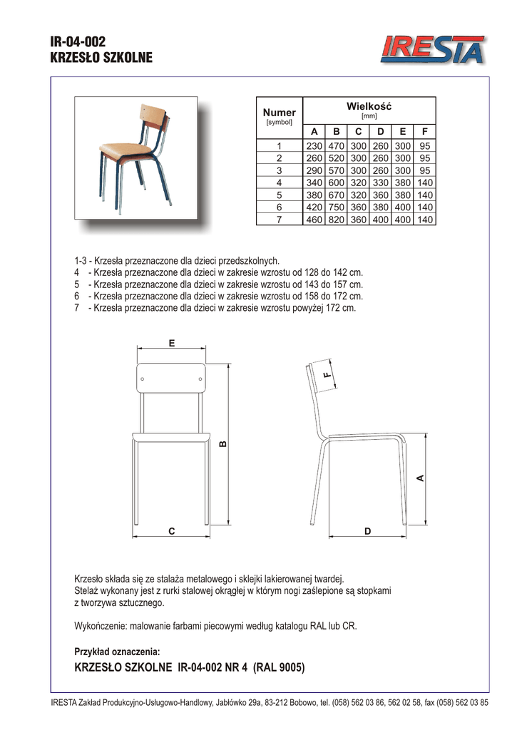 IR-04-002 KRZES£O SZKOLNE Wielkoœæ Numer [mm] [symbol] 1 2 3 4 5 6 7 A 230 260 290 340 380 420 460 B 470 520 570 600 670 750 820 C 300 300 300 320 320 360 360 D 260 260 260 330 360 380 400 E 300 300 300 380 380 400 400 F 95 95 95 140 140 140 140 1-3 - Krzes³a przeznaczone dla dzieci przedszkolnych. 4 - Krzes³a przeznaczone dla dzieci w zakresie wzrostu od 128 do 142 cm. 5 - Krzes³a przeznaczone dla dzieci w zakresie wzrostu od 143 do 157 cm. 6 - Krzes³a przeznaczone dla dzieci w zakresie wzrostu od 158 do 172 cm. 7 - Krzes³a przeznaczone dla dzieci w zakresie wzrostu powy¿ej 172 cm. A B F E C D Krzes³o sk³ada siê ze stala¿a metalowego i sklejki lakierowanej twardej. Stela¿ wykonany jest z rurki stalowej okr¹g³ej w którym nogi zaœlepione s¹ stopkami z tworzywa sztucznego. Wykoñczenie: malowanie farbami piecowymi wed³ug katalogu RAL lub CR. Przyk³ad oznaczenia: KRZES£O SZKOLNE IR-04-002 NR 4 (RAL 9005) IRESTA Zak³ad Produkcyjno-Us³ugowo-Handlowy, Jab³ówko 29a, 83-212 Bobowo, tel. (058) 562 03 86, 562 02 58, fax (058) 562 03 85
