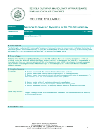 Course title National Innovation Systems in the World Economy Course number 232461 - 0622 Lecturer Weresa Marzenna A., PhD 3 ECTS points A. Course objective Familiarizing the students with the concept of an economy's innovativeness, its measurement methods and diversity of innovation systems in the world economy. Shaping the student's ability to evaluate the functioning of innovation systems and making conclusions on desired objectives and instruments of innovation policy. B. Course syllabus National Innovation System (NIS) and its key elements. NIS models in the world economy: comparison of US, EU, Canada, Japan and Australia. National Innovation System in Poland: its advantages and drawbacks. Globalization of innovation activities and internationalization of NIS. Advantages and costs of NIS internalization. Innovativeness as a driver for economic competitiveness. Different concepts of innovation policy: the comparison of experiences from different countries. C. Educational outcome Knowledge Skills 1. Student understands the concept of national innovation systems. 2. Student understands country specific characteristics of innovation system. 3. Student knows the measurement methods and measures used in order to assess country's innovativeness level and evaluate national innovation systems. 1. Student is able to identify and interpret innovativeness factors. 2. Student is able to evaluate and compare national innovation systems. 3. Student possesses the ability of analyzing different elements of innovation systems. Social competencies Student understands the relationship between the level of the innovativeness of the economy and its competitiveness. D. Semester time table Szkoáa Gáywna Handlowa w Warszawie Al. NiepodlegáoĞci 162, 02-554 Warszawa centrala: +48 22 564 60 00, faks kancelarii: +48 22 849 53 12, informacja: +48 22 564 64 64 e-mail: [email protected], http://www.sgh.waw.pl/ 1 c.d.National Innovation Systems in the World Economy 1 The concept of innovativeness of the economy and measurement methods. 2 Creation and diffusion of innovation in an open economy. 3 The concept of national innovation system and its main elements. 4 Methods of evaluation and criteria for comparing innovation systems. 5 Models of national innovation systems in contemporary world economy. 6 The characteristic of market model of national innovation system: examples of USA, the United Kingdom, Canada and Australia. 7 Innovativeness of EU countries: comparison of Scandinavian countries, the United Kingdom, Germany and France. 8 National innovation systems in Japan and selected Asian countries. 9 National innovation system in Poland: strengths and weaknesses. 10 Opening of national innovation systems in globalization perspective; taxonomy of innovation systems. 11 Innovativeness as a driver of the competitiveness of the economy - selected countries analysis. 12 Different concepts of innovation policy: comparison of different countries experiences. 13 Innovation policy of the European Union - conclusions for Poland. 14 Innovation policy in Poland in the context of integration process - "Innovative Economy Operational Programme, 2007-13": assumptions and expected results. 15 Possibilities and restrictions of innovation policy in an open economy. E. Basic literature M.A.Weresa, W.Leal Filho (ed.), Economic and Technological Dimensions of National Innovation Systems, Peter Lang, Frankfurt, Bern, Bruxelle, New York, Oxford, Wien 2005; M.A.Weresa (ed.), Poland Competitiveness Report 2006. The role of Innovation, Warsaw School of Economics, Warsaw 2006, part III; B.Lundvall, National Systems of Innovation, London, Pinter Publishers 1992. F. Supplementary literature M.Balzat, Benchmarking in the Context of National Innovation Systems: Purpose and Pitfalls, Volkswirtschaftliche Diskussionreihe, Beitrag Nr. 238, May, University of Augsburg 2003; Ch.Edquist, (ed.) Systems of Innovation: Growth, Competitiveness and Employment. E.Elgar, Cheltenham & Northampton, 2000; Y.Park, A taxonomy of national systems of innovation: R&D structure of OECD economies, "Science and Public Policy", nr 4, 1999 p. 241-246; R.Nelson, N.Rosenberg, National Innovation System Oxford, Oxford University Press 1993; S.W. Popper. C.S.Wagner, New Foundations for Growth: The U.S. Innovation System Today and Tomorrow, Science and Technology Policy Institute, Arlington, January 2002; N.Kumar, K.J.Joseph, National Innovation Systems and India's IT Capability, RIS Discussion Papers no 72/2004; G.Roos, L.Fernstrom, O.Gupta , National Innovation Systems: Finland, Sweden and Australia Compared, Intellectual Capital Services Ltd, London 2005. G. Author's most important publications concerning the offered course M.A. Weresa, Systemy innowacyjne we wspyáczesnej gospodarce Ğwiatowej, Wydawnictwo Naukowe PWN Warszawa 2012. M.A. Weresa, W.Leal Filho (red.), Fostering Innovation and Knowledge Transfer in European Regions, Peter Lang, Frankfurt, Bern, Bruxelle, New York, Oxford, Wien 2008. M.A. Weresa, W.Leal Filho (red.), Economic and Technological Dimensions of National Innovation Systems, Peter Lang, Frankfurt, Bern, Bruxelle, New York, Oxford, Wien 2005. H. Numbers of required prerequisites not required Szkoáa Gáywna Handlowa w Warszawie Al. NiepodlegáoĞci 162, 02-554 Warszawa centrala: +48 22 564 60 00, faks kancelarii: +48 22 849 53 12, informacja: +48 22 564 64 64 e-mail: [email protected], http://www.sgh.waw.pl/ 2 c.d.National Innovation Systems in the World Economy I. Course size and mode Full-time Saturday-Sunday Afternoon Total: 30 14 30 Lecture 30 14 30 J. Final mark composition traditional examination 75% report 25% K. Foreign language requirments English L. Selection criteria M. Methods applied case studies reports discussions participation of practitioners Szkoáa Gáywna Handlowa w Warszawie Al. NiepodlegáoĞci 162, 02-554 Warszawa centrala: +48 22 564 60 00, faks kancelarii: +48 22 849 53 12, informacja: +48 22 564 64 64 e-mail: [email p