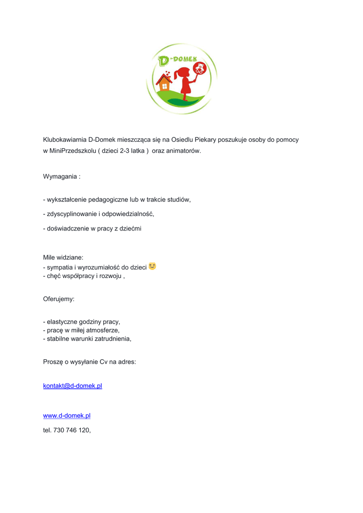 Klubokawiarnia D-Domek Domek mieszcząca mieszcz się na Osiedlu Piekary poszukuje osoby do pomocy w MiniPrzedszkolu ( dzieci 2-3 3 latka ) oraz animatorów. Wymagania : - wykształcenie pedagogiczne lub w trakcie studiów, - zdyscyplinowanie i odpowiedzialność, odpowiedzialno - doświadczenie wiadczenie w pracy z dzieć dziećmi Mile widziane: - sympatia i wyrozumiałość ść do dzieci - chęć współpracy i rozwoju , Oferujemy: - elastyczne godziny pracy, - pracę w miłej atmosferze, - stabilne warunki zatrudnienia, Proszę o wysyłanie Cv na adres: [email protected] www.d-domek.pl tel. 730 746 120, :-)
