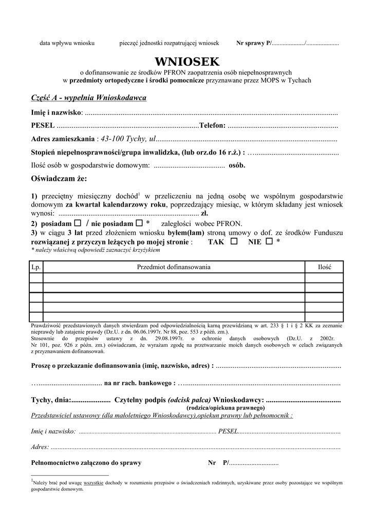 data wpływu wniosku pieczęć jednostki rozpatrującej wniosek Nr sprawy P/...................../..................... WNIOSEK o dofinansowanie ze środków PFRON zaopatrzenia osób niepełnosprawnych w przedmioty ortopedyczne i środki pomocnicze przyznawane przez MOPS w Tychach Część A - wypełnia Wnioskodawca Imię i nazwisko: ....................................................................................................................................... PESEL ............................................................................Telefon: ........................................................... Adres zamieszkania : 43-100 Tychy, ul................................................................................................. Stopień niepełnosprawności/grupa inwalidzka, (lub orz.do 16 r.ż.) : …............................................. Ilość osób w gospodarstwie domowym: ...................................... osób. Oświadczam że: 1) przeciętny miesięczny dochód1 w przeliczeniu na jedną osobę we wspólnym gospodarstwie domowym za kwartał kalendarzowy roku, poprzedzający miesiąc, w którym składany jest wniosek wynosi: ........................................................................... zł. 2) posiadam / nie posiadam * zaległości wobec PFRON. 3) w ciągu 3 lat przed złożeniem wniosku byłem(łam) stroną umowy o dof. ze środków Funduszu rozwiązanej z przyczyn leżących po mojej stronie : TAK NIE * * należy właściwą odpowiedź zaznaczyć krzyżykiem Lp. Przedmiot dofinansowania Ilość Prawdziwość przedstawionych danych stwierdzam pod odpowiedzialnością karną przewidzianą w art. 233 § 1 i § 2 KK za zeznanie nieprawdy lub zatajenie prawdy (Dz.U. z dn. 06.06.1997r. Nr 88, poz. 553 z późń. zm.). Stosownie do przepisów ustawy z dn. 29.08.1997r. o ochronie danych osobowych (Dz.U. z 2002r. Nr 101, poz. 926 z późn. zm.) oświadczam, że wyrażam zgodę na przetwarzanie moich danych osobowych w celach związanych z przyznawaniem dofinansowań. Proszę o przekazanie dofinansowania (imię, nazwisko, adres) : ................................................................... ….................................. na nr rach. bankowego : …................................................................................... Tychy, dnia:..................... Czytelny podpis (odcisk palca) Wnioskodawcy: ........................................ (rodzica/opiekuna prawnego) Przedstawiciel ustawowy (dla małoletniego Wnioskodawcy),opiekun prawny lub pełnomocnik : Imię i nazwisko: ........................................................................................ PESEL............................................................ Adres: ......................................................................................................................................................................... Pełnomocnictwo załączono do sprawy 1 Nr P/............................. Należy brać pod uwagę wszystkie dochody w rozumieniu przepisów o świadczeniach rodzinnych, uzyskiwane przez osoby pozostające we wspólnym gospodarstwie domowym. Wymagane załączniki do wniosku : 1) Faktury wystawione na osobę niepełnosprawną, dziecko niepełnosprawne, jego rodzica/prawnego opiekuna, określającą kwotę opłaconą w ramach ubezpieczenia zdrowotnego oraz kwotę udziału własnego osoby niepełnosprawnej (w przypadku faktur z odroczonym terminem płatności termin ten powinien być nie krótszy niż 30 dni). 2) Potwierdzona za zgodność, przez świadczeniodawcę realizującego zlecenie kopia zrealizowanego zlecenia na zaopatrzenie w przedmioty ortopedyczne i środki pomocnicze (druk NFZ). 3) Kopia ważnego orzeczenia lub kopię wypisu z treści orzeczenia o którym mowa w art. 1, art. 5 pkt 1a lub 62 ustawy z dnia 27 sierpnia 1997 r. o rehabilitacji zawodowej i społecznej oraz zatrudnianiu osób niepełnosprawnych (Dz. U. 2011 Nr 127, poz. 721 z późn. zm.) - oryginał do wglądu. 4) Zaświadczenia o dochodach za kwartał kalendarzowy poprzedzający miesiąc złożenia wniosku – do wglądu. Część B - wypełnia Miejski Ośrodek Pomocy Społecznej w Tychach Rodzaj środka Limit NFZ Dof. NFZ Wartość nabycia Udział własny Dofinansowany udział własny wnioskodawcy do limitu NFZ ponad limit NFZ razem Razem : Uwagi: ............................................................................................................................................................... ............................................................................................................................................................................... ............................................................................................................................................................................... .................................... ...................................... .......................................... data pieczęć MOPS pieczęć i podpis
