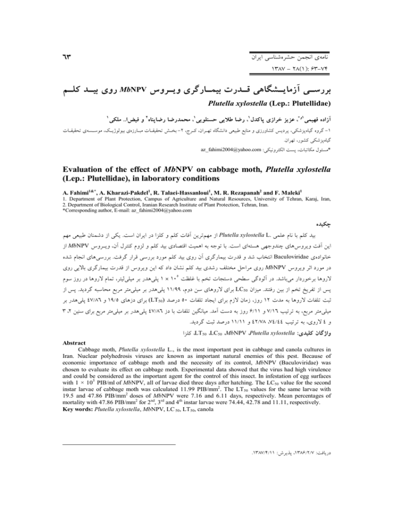 ÓÐ ƱřźƿřƾſŚƴƃƵźƄůƲưŬƳřƽ ƶƯŚƳ æèíìçíæëèìé ƮººƬƧŶººǀŝƽƹŹMbNPVŽƹźººƿƹƽźĭŹŚººưǀŝšŹŶººƣƾƷŚĮƄººƿŚƯŻōƾººſŹźŝ Plutella xylostella (Lep.: Plutellidae) Î ç ƾĪƬƯřƊǀƟƹ ƵŚƴěŚƋŹŚƋŹŶưŰƯæƾƿƺƬƴƀůƾƿLjƏŚƋŹæƩŶĩŚěƽŻřźųżƿżƗ*ƹÎƾưǀƸƟƵŵřŻō šŚºƤǀƤŰţƽƶƀºſƺƯĨºƿĥƺƫƺǀŝƽƵŻŹŚºŞƯšŚºƤǀƤŰţƂºŴŝ çũźºĩƱřźºƸţƵŚĮƄƳřŵƾƘǀŞƏƖŝŚƴƯƹƽŻŹƹŚƄĩžƿŵźěƾĪƃżěƵŚǀĭƵƹźĭ æ ƱřźƸţŹƺƄƧƾƨƃżěƵŚǀĭ [email protected]ƾƨǀƳƹźŤƨƫřŢƀ욌ŞţŚƨƯƩƺŘƀƯ* Evaluation of the effect of MbNPV on cabbage moth, Plutella xylostella (Lep.: Plutellidae), in laboratory conditions A. Fahimi1&*, A. Kharazi-Pakdel1, R. Talaei-Hassanloui1, M. R. Rezapanah2 and F. Maleki1 1. Department of Plant Protection, Campus of Agriculture and Natural Resources, University of Tehran, Karaj, Iran, 2. Department of Biological Control, Iranian Research Institute of Plant Protection, Tehran, Iran. *Corresponding author, E-mail: [email protected] ƵŶǀĪģ ƮƸƯƾƘǀŞƏƱŚƴưƃŵŻřƾĪƿŢſřƱřźƿřŹŵřżƬĩƹƮƬĩšŚƟōƲƿźţƮƸƯŻř Plutella xylostella L. ƾưƬƗƭŚƳŚŝƮƬĩŶǀŝ ŻřMbNPVŽƹźºƿƹƱōƩźŤƴƧƭƹżƫƹƮƬƧŶǀŝƽŵŚƈŤƣřŢǀưƷřƶŝƶūƺţ ŚŝŢſřƽřƶŤƀƷƾƸūƹ ŶƴģƽŚƷ ŽƹźƿƹŢƟōƲƿř ƵŶƃƭŚŬƳřƽŚƷƾſŹźŝ ŢƟźĭŹřźƣƾſŹźŝŵŹƺƯƮƬƧŶǀŝƽƹŹƱōƽźĭŹŚưǀŝšŹŶƣƹŶƃśŚŴŤƳř BaculoviridaeƽƵŵřƺƳŚų ƽƹŹƾƿLJŚŝƽźĭŹŚưǀŝšŹŶƣŻřŽƹźƿƹƲƿřƶĩŵřŵƱŚƄƳƮƬĩŶǀŝƽŶƃŹƞƬŤŴƯƪůřźƯƽƹŹMbNPVŽƹźƿƹźŧřŵŹƺƯŹŵ ƭƺſŻƹŹŹŵŚƷƹŹLJƭŚưţźŤǀƫƾ ƬǀƯźŝŹŶƷƾƬě ÎÎÍÒŢƔƬƛŚŝƮŴţšŚŬŤſŵƾŰƐſƾĭŵƺƫōŹŵŶƃŚŝƾƯŹřŵŹƺųźŝŚƷƹŹLJ ŻřžěŶƿŵźĭƶŞſŚŰƯƖŝźƯźŤƯƾƬǀƯźŝŹŶƷ ÎÎÖÖƭƹŵƲſƽŚƷƹŹLJƽřźŝLC50ƱřżǀƯŶƴŤƟŹƲǀŝŻřƮŴţŲƿźƠţŻřžě ƾƬě źŝŹŶƷƾƬě ÑÔÕÓƹÎÖÒƽŚƷŻŵƽřźŝ(LT50)ŶƇŹŵÒÍšŚƠƬţŵŚŬƿřƽřźŝƭŻLJƱŚƯŻŻƹŹ ÎÏ šŶƯƶŝŚƷƹŹLJšŚƠƬţŢŞŧ ÐÏƲǀƴſƽřźŝƖŝźƯźŤƯƾƬǀƯźŝŹŶƷ ÑÔÕÓŻŵŚŝšŚƠƬţƲǀĮƳŚǀƯŶƯōŢſŵƶŝŻƹŹëÎÎƹÔÎÓŜǀţźţƶŝƖŝźƯźŤƯƾ ƾƬě ƬǀƯ ŶƿŵźĭŢŞŧŶƇŹŵÎÎÎÎƹÑÏÔÕÔÑÑÑŜǀţźţƶŝƽƹŹLJÑƹ řżƬĩLT50LC50MbNPVPlutella xylostellaƽŶǀƬĩƱŚĭĥřƹ Abstract Cabbage moth, Plutella xylostella L., is the most important pest in cabbage and canola cultures in Iran. Nuclear polyhedrosis viruses are known as important natural enemies of this pest. Because of economic importance of cabbage moth and the necessity of its control, MbNPV (Baculoviridae) was chosen to evaluate its effect on cabbage moth. Experimental data showed that the virus had high virulence and could be considered as the important agent for the control of this insect. In infestation of egg surfaces with 1 × 105 PIB/ml of MbNPV, all of larvae died three days after hatching. The LC50 value for the second instar larvae of cabbage moth was calculated 11.99 PIB/mm2. The LT50 values for the same larvae with 19.5 and 47.86 PIB/mm2 doses of MbNPV were 7.16 and 6.11 days, respectively. Mean percentages of mortality with 47.86 PIB/mm2 for 2nd, 3rd and 4th instar larvae were 74.44, 42.78 and 11.11, respectively. Key words: Plutella xylostella, MbNPV, LC 50, LT50, canola æèíìéææ ƁźƿŸěæèíëçìŢƟŚƿŹŵ ŽƹźƿƹƽźĭŹŚưǀŝšŹŶƣƾƷŚĮƄƿŚƯŻōƾſŹźŝƱřŹŚƨưƷƹƾưǀƸƟ ÓÑ ƶƯŶƤƯ ƱŚºƸūźºſřźſŹŵƱŚºǀŗŚĜǀƬģŶƿŶƸţƲƿźŤĭŹżŝPlutella xylostella L. ƾưƬƗƭŚƳŚŝƮƬĩŶǀŝ ƦºƿŻřƂǀºŝƾţŹŚƀºųƶƫŚºſ źƷƹŵƺƃƾƯ ƩƺƈŰƯŶƇŹŵîåƶŝƶƯŶƇŜūƺƯƵŚĭƶƧŢſř ƵĦƿƹƶŝ ƾƘǀŞƏƱŚƴưƃŵƱřŶƤƟ(Verkerk & Wright, 1996)ŶƴƧƾƯ ƪǀưŰţřŹŚƨƿźƯōŹLJŵƱƺǀƬǀŝ űźºƳƹƾƳLJƺƏƪƇřƺƟƶŝƵźƄůšźūŚƸƯŢǀƬŝŚƣƾƯƺŝ źǀƛƢƏŚƴƯŻřƽŹŚǀƀŝŹŵŚƷŶǀŗƺŤƿŻřŹŚě ŢººſřƱŚººƸūƢƏŚººƴƯŻřƽŹŚǀƀººŝŹŵŢººƟōƲººƿřƱŚººǀƜƏƽƵŶººưƗƪººƬƗŻřƱōƽŹƹŹŚººŝƽLJŚººŝ ƱŚºǀŗŚĜǀƬģƽŚºƷŢƄºƧƽřźºŝƾƗƺƴƈƯƽŚƷƂƧ ƵźƄůƵŵźŤƀĭƝźƈƯƵƹLjƗ ƶŝ(Lim, 1992) ŢººſřƵŶººƿŵźĭƵźƄººůƲººƿřƽŚººƷŢººǀƘưūŹŵŢººƯƹŚƤƯŻřƾƿLJŚººŝƽŚººƷƵŵŹƶººŝźººŬƴƯ ƲƿřŶƿŶƃŢƯƹŚƤƯŚŝŚƷŶǀŗƹźţźǀěæîíåƽƶƷŵŹŵƩŚŨƯƱřƺƴƗƶŝ .(Krishnakumar et al., 1986) ƽƶºƷŵźųřƹřŹŵƮƷBacillus turingiensisƹacylurease ŵźŝŹŚƧƲǀƴĤưƷŶƳŶƿŵźĭƹŹƶŝƹŹŢƟō (Cartwright et al., 1987; Lqbal et al., 1996)ŶƃƶūřƺƯŢƀƨƃŚŝæîíå ƶºƧŶºƳŹřŵřŹŢºǀƟźƓƲºƿřƾºƘǀŞƏƱŚƴưƃŵŶƴƳŚưƷŚƷŽƹźƿƹƶƬưūŻřƾŝƹźƨǀƯƪƯřƺƗ ŚºƸƳōƱřƺţƾƯšŚƟōƩźŤƴƧƱřźƿŶƯƵŚĭŶƿŵŻřźţƮƸƯƲƿřŻřŚƯřŶƴƴƧƒƠůƎǀŰƯŹŵřŹƱŚƃŵƺų (Hunter-Fujita et al., 1998)ŵřŵŹřźºƣƵŵŚƠŤºſřŵŹƺƯƾƿŚǀưǀƃƽŚƷƂƧ ŢƟōƶŝŚƄƯƾƃƹŹƶŝřŹ ƱřżºǀƯƶºŝƹŶƳřƵŶƃƶŤųŚƴƃšřźƄůŢǀƘưūƩźŤƴƧŹŵźŧŒƯƪƯřƺƗƱřƺƴƗƶŝŚƷŽƹźƿƹƺƫƺƧŚŝ ƾƳŚºŝżǀƯƽƶºƴƯřŵŚƸƳō(Burges, 1981)ŶƴƴĩƾƯƪưƗƾƇŚƈŤųřƽŹƺƳŚū ƽƵŵŹƲƿřƽřźŝƽŵŚƿŻ ƱřƹřźºƟšLjĪƄºƯŵƺºūƹŚºŝŚºƷŽƹźºƿƹƲºƿřƵƺŞƳřŶǀƫƺţŶƳŹřŵƱŚĭźƸƯƾŝƲǀŝŹŵƽŵƹŶŰƯ ŻřƵŵŚƠŤºſřƲºƿřźºŝƵƹLjƗŶƳŹřŵŹƺųźŝƾƿLJŚŝƽŹřŶƿŚěŻřƵĦƿƹƎƿřźƃŢŰţƹƵŵƺŝźƿŸěƱŚƨƯř (Tanada & Kaya, 1992)ŵŹřŶƳƩŚŞƳŵƶŝřŹŢƀƿ