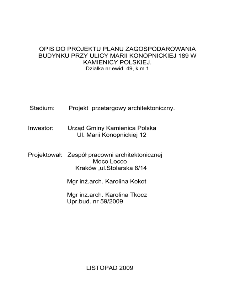 OPIS DO PROJEKTU PLANU ZAGOSPODAROWANIA BUDYNKU PRZY ULICY MARII KONOPNICKIEJ 189 W KAMIENICY POLSKIEJ. Działka nr ewid. 49, k.m.1 Stadium: Projekt przetargowy architektoniczny. Inwestor: Urząd Gminy Kamienica Polska Ul. Marii Konopnickiej 12 Projektował: Zespół pracowni architektonicznej Moco Locco Kraków ,ul.Stolarska 6/14 Mgr inż.arch. Karolina Kokot Mgr inż.arch. Karolina Tkocz Upr.bud. nr 59/2009 LISTOPAD 2009 ZAWARTOŚĆ OPRACOWANIA I. Część opisowa. II. Krty katalogowe. III. Część graficzna: A01 plan zagospodarowania terenu skala 1:200 A02 plan zagospodarowania wejscia do budynku slaka 1:100 I. Część opisowa. Opis do projektu elewacji. Pkt.1. Specyfikacja nawierzchni. A - chodniki: Zagospodarowanie terenu przed wejściem do budynku – chodniki wykonać w następujący sposób ułożenia kostki brukowej: 2x kostka brukowa szer.9cm, grubość 6cm typu: Drewbet granit pułkany ‘żółty’ 3x kostka naturalna granitowa szer.8cm, grubość 6cm kolor czarny (grafit) 1x kostka brukowa szer.9cm, grubość 6cm typu: Drewbet granit płukany ‘żółty’ pas chodnika kastka brukowa szer.9cm, grubość 6cm typu: Drewbet granit płukany ‘biały’ (jasnoszary) B – wyeksponowanie studni oraz istniejących drzew: Studnie oraz istniejące drzewa wyeksponować otaczając je kostką brukowową i naturalną promieniście od osi: 3x kostka naturalna granitowa szer.8cm, grubości 6cm kolor czarny (grafit) 2x kostka brukowa szer.9cm, grubość 6cm typu: Drewbet granit pułkany ‘żółty’ 3x kostka naturalna granitowa szer.8cm, grubości 6cm kolor czarny (grafit) C – otoczenie terenu wejścia do budynku: Granicę pomiędzy trawnikiem przed wejściem do budynku a parkingiem wykonać w następujący sposób ułożenia kostki brukowej: 2x kostka brukowa szer.12cm, grubość 8cm typu: Drewbet sonata pełny kolor ‘szary’ parking kostka brukowa szer.12cm, grubość 8cm typu: Drewbet sonata pełny kolor ‘grafit’ D – opaska wokół istniejącego budynku muzeum: Istniejący budynek otoczyć opaska z 3x kostką brukową szer.9cm, grubość 6cm typu: Drewbet granit płukany ‘grafit’ Dojazdy i parkingi: Komunikację kołową i parkingi wyłożyć kostką brukową szer.12cm, grubość 8cm typu: Drewbet sonata pełny kolor ‘grafit’. Wytyczenie miejść postojowych wyłożyć 1x kostka brukowa szer.12cm, grubość 8cm typu: Drewbet sonata kolor ‘szary’. Dojazd do budybku gospodarczego wyłożyć ażurowymi płytami betonowymi. Pkt.2. Ławki: Zamontować ławki typu: mmcite4 Vera LV250; siedzisko i oparcie o długości 150cm, z prętów stalowych, kolor srebrny. Pkt.3. Kosze na śmieci: Zamontować kosze na śmieci typu: mmcite4 Diagonal DG315; kołowy przekrój poziomy, strona zewnętrzna z blachy ażurowej, z daszkiem, objętość 45l, kolor srebrny. Pkt.4. Stojak na rowery: Zamontować stojak na rowery typu: mmcite4 Velo VL145; 2x stojak jednostronny, sześć miejsc, z uchwytem do zamykania rowerów, kolor srebrny. Pkt.5. Oświetlenie: Zewnętrzne lampy stojące typu: Spotline Otos 230455; kolor antracyt, przekrój kolowy o średnicy 17cm, wysokość 110cm. Zewnętrzne lampy wbudowane: • Wyeksponowanie studni- lampy wbudowane typu: Spotline Nautic Round; przekrój kołowy o średnicy 11cm. • Wyeksponowanie istniejących drzew- lamy wbudowane typu: Spotline Dasar ES111 Round; przekrój kołowy o średnicy 22cm. Pkt.6. Projektowana roślinność: Przed wejściem do budynku sadzić symetrycznie dwa krzewy typu: żywotnik zachodni odm. ‘Globosa’. Wzdłuż ścieżek sadzić rośliny okrywowe typu: jałowiec płożący. Uwagi końcowe: 1. Ze względu na modernizacyjny charakter robót budowlanych wymiary i odległości sprawdzić w terenie. 2. Warstwy podłoża pod kostkę brukową wykonać zgodnie z technologią kładzenia. 3. Projektowane rośliny sadzić zgodnie z wytycznymi rzeczoznawcy. 4. Uwagi i opisy zamieszczone w części rysunkowej stanowią integralną część projektu. 5. Roboty budowlane należy prowadzić zgodnie z zasadami sztuki budowlanej. 6. Wszystkie rozwiązania techniczne związane z określoną technologią należy wykonać dokładnie wg wytycznych i zaleceń producenta. 7. Całość opracowania jest chroniona prawem autorskim. II. Krty katalogowe. III.Część graficzna.