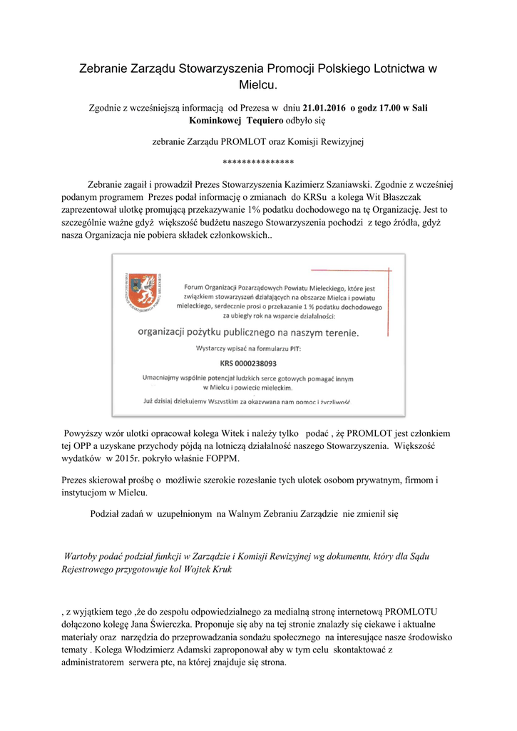 Zebranie Zarządu Stowarzyszenia Promocji Polskiego Lotnictwa w Mielcu. Zgodnie z wcześniejszą informacją od Prezesa w dniu 21.01.2016 o godz 17.00 w Sali Kominkowej Tequiero odbyło się zebranie Zarządu PROMLOT oraz Komisji Rewizyjnej *************** Zebranie zagaił i prowadził Prezes Stowarzyszenia Kazimierz Szaniawski. Zgodnie z wcześniej podanym programem Prezes podał informację o zmianach do KRSu a kolega Wit Błaszczak zaprezentował ulotkę promującą przekazywanie 1% podatku dochodowego na tę Organizację. Jest to szczególnie ważne gdyż większość budżetu naszego Stowarzyszenia pochodzi z tego źródła, gdyż nasza Organizacja nie pobiera składek członkowskich.. Powyższy wzór ulotki opracował kolega Witek i należy tylko podać , żę PROMLOT jest członkiem tej OPP a uzyskane przychody pójdą na lotniczą działalność naszego Stowarzyszenia. Większość wydatków w 2015r. pokryło właśnie FOPPM. Prezes skierował prośbę o możliwie szerokie rozesłanie tych ulotek osobom prywatnym, firmom i instytucjom w Mielcu. Podział zadań w uzupełnionym na Walnym Zebraniu Zarządzie nie zmienił się Wartoby podać podział funkcji w Zarządzie i Komisji Rewizyjnej wg dokumentu, który dla Sądu Rejestrowego przygotowuje kol Wojtek Kruk , z wyjątkiem tego ,że do zespołu odpowiedzialnego za medialną stronę internetową PROMLOTU dołączono kolegę Jana Świerczka. Proponuje się aby na tej stronie znalazły się ciekawe i aktualne materiały oraz narzędzia do przeprowadzania sondażu społecznego na interesujące nasze środowisko tematy . Kolega Włodzimierz Adamski zaproponował aby w tym celu skontaktować z administratorem serwera ptc, na której znajduje się strona. Następnie prezes poinformował zebranych, że uzyskał zgodę od Prezydenta Miasta na dostęp do pomieszczeń przewidzianych dla Organizacji Pozarządowych z terenu naszego miasta w Hotelu SETKA przy ulicy Biernackiego.. Harmonogram i czas dostępu będzie podany później. Wszyscy zebrani z zrozumieniem przyjęli te informacje oraz podział obowiązków i przystąpiono do omówienie aktualnych planów działania w 2016, 2017 a nawet w 2018 roku.. Działania Stowarzyszenia w 2016 roku będą w głównej mierze oparte na współorganizacji VI Spotkań Pokoleń Lotniczych wspólnie z TMZM i jego Klubem Miłośników Lotnictwa oraz PZL Mielec, SIMP i innymi organizacjami i instytucjami jak Forum Organizacji Pozarządowych Powiatu Mieleckiego oraz Miejską Biblioteką Publiczną Samorządowego Centrum Kultury jako główny organizator. Te Spotkania na trwale zapisały się w kalendarzu wydarzeń kulturalnych i lotniczych naszego miasta i należy je kontynuować, bo dają okazję doceniania obecnych twórców samolotów jak i starszego pokolenia będącego już na emeryturze. Nie przewiduje się montażu kolejnych samolotów- pomników chociaż czyni się starania o ich pozyskanie. (MiGa i DROMADERA ) Jak uda się nam tanio lub bezpłatnie pozyskać te samoloty- to na pewno do tematu wrócimy bo mamy tu wsparcie Prezydenta Miasta. Pewną alternatywą tworzenia samolotów- pomników są plany powstania Multimedialnego Muzeum Lotnictwa zaproponowanego na poprzednich Spotkaniach Lotniczych, gdzie upamiętnienie tradycji i osiągnięć mieleckiego lotnictwa przybrało by inną formę. Prezes poprosił o pomoc przy poszukiwaniu sylwetek lotniczych z naszego regionu godnych wyróżnienia STATUETKĄ DEDALA oraz okolicznościowymi wyróżnieniami. m W 2017 roku plan działania jest bardziej ambitny bo przypadają wtedy dwie ciekawe rocznice: a) 70ta rocznica powstania konstrukcji samolotu An-2 w biurze Antonowa bo to jest samolot, który jest rekordzistą wielkości produkcji i eksportu w Mielcu! Używany w 60 krajach świata. b) 20 rocznica zlotu samolotów An-2 oraz lotu dookoła świata tego właśnie samolotu wyprodukowanego w Mielcu co było wyczynem który zasługuje na upamiętnienie . Ta oraz 80 rocznica powstania Wytwórni Płatowców w Mielcu wymaga jeszcze dopracowania z uwzględnieniem stanowiska nowych właścicieli PZL. Następnie głos zabrał kolega Józef Roguz przedstawiciel Forum Organizacji Pozarządowych Powiatu Mieleckiego, który szczególnie zwrócił uwagę na dwa aspekty: a) brak docenienia w naszym środowisku zasług i osiągnięć naszego prezesa kolegi Kazimierza Szaniawskiego. Obecni członkowie zarządu w stoicki sposób przyjęli tę krytykę i zapewne wezmą to pod uwagę , b) Propozycja zorganizowania w Mielcu w 50 rocznicę powstania ZUA, Ogólnopolskiego Zjazdu Agrolotników, przy czym my zapewnilibyśmy bazę noclegową , miejsce na konferencję i wypoczynek (np ośrodek Rzemień ) a całość poprowadzili by przedstawiciele z Warszawy. Przyjęto to także ze zrozumieniem ale szczupłość środków własnych bardzo ogranicza tę inicjatywę. Na zakończenie wspomniano o 100-tnej rocznicy Odzyskania Niepodległości przypadające w 2018 roku i na tę okoliczność prezes poprosił uczestników zebrania o podjęcie działań mających jak najlepsze uczczenie tej okrągłej rocznicy oraz wspomniano o ostatnim Piśmie Prezesa do Prezydenta Polski w sprawie pożyczki dla Ukrainy. Tekst pisma do Prezydenta Polski w sprawie pożyczki dla Ukrainy znalazł się w będącej w testowaniu nowej strony Promlotu pod hasłem MIELECKIE LOTNICTWO. Podjęto decyzję aby w nowoopracowywanej stronie PROMLOTU umieścić więcej ankiet i zapytań dla potwierdzenia, że zakres i przedmiot działalności jest zgodny z oczekiwaniami środowiska, ale czy to się uda okaże się po następnym spotkaniu grupy redagującej. Na tym zebranie zakończono.