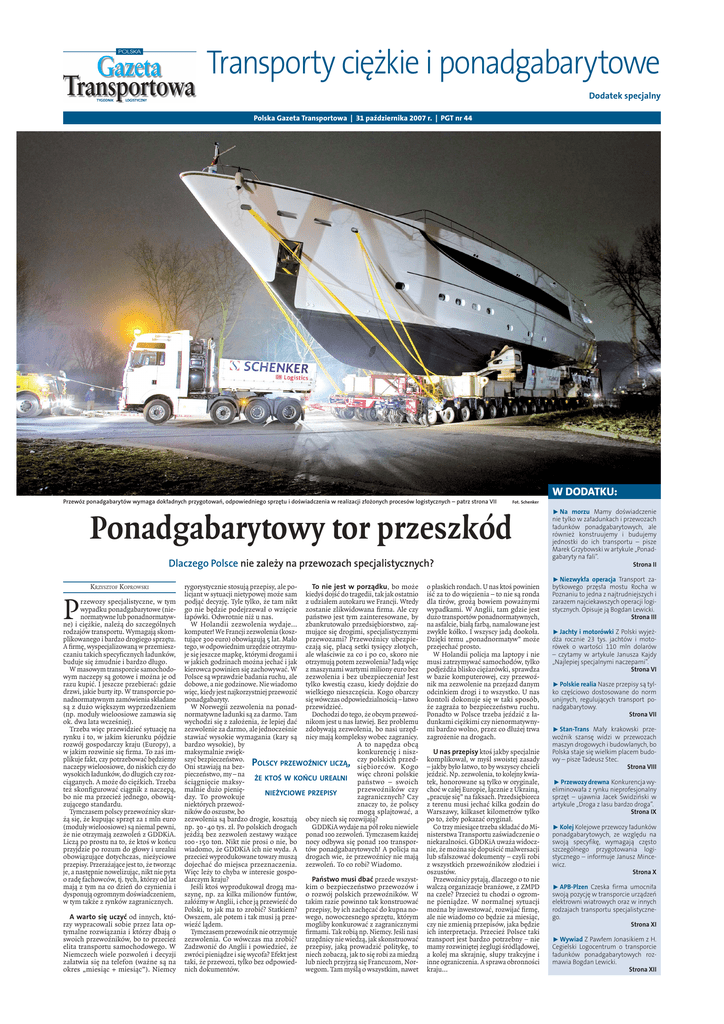 Transporty ciężkie i ponadgabarytowe Dodatek specjalny Polska Gazeta Transportowa | 31 października 2007 r. | PGT nr 44 W DODATKU: Przewóz ponadgabarytów wymaga dokładnych przygotowań, odpowiedniego sprzętu i doświadczenia w realizacji złożonych procesów logistycznych – patrz strona VII Fot. Schenker Ponadgabarytowy tor przeszkód Dlaczego Polsce nie zależy na przewozach specjalistycznych? KRZYSZTOF KOPROWSKI P rzewozy specjalistyczne, w tym wypadku ponadgabarytowe (nienormatywne lub ponadnormatywne) i ciężkie, należą do szczególnych rodzajów transportu. Wymagają skomplikowanego i bardzo drogiego sprzętu. A firmę, wyspecjalizowaną w przemieszczaniu takich specyficznych ładunków, buduje się żmudnie i bardzo długo. W masowym transporcie samochodowym naczepy są gotowe i można je od razu kupić. I jeszcze przebierać: gdzie drzwi, jakie burty itp. W transporcie ponadnormatywnym zamówienia składane są z dużo większym wyprzedzeniem (np. moduły wieloosiowe zamawia się ok. dwa lata wcześniej). Trzeba więc przewidzieć sytuację na rynku i to, w jakim kierunku pójdzie rozwój gospodarczy kraju (Europy), a w jakim rozwinie się firma. To zaś implikuje fakt, czy potrzebować będziemy naczepy wieloosiowe, do niskich czy do wysokich ładunków, do długich czy rozciąganych. A może do ciężkich. Trzeba też skonfigurować ciągnik z naczepą, bo nie ma przecież jednego, obowiązującego standardu. Tymczasem polscy przewoźnicy skarżą się, że kupując sprzęt za 1 mln euro (moduły wieloosiowe) są niemal pewni, że nie otrzymają zezwoleń z GDDKiA. Liczą po prostu na to, że ktoś w końcu przyjdzie po rozum do głowy i urealni obowiązujące dotychczas, nieżyciowe przepisy. Przerażające jest to, że tworząc je, a następnie nowelizując, nikt nie pyta o radę fachowców, tj. tych, którzy od lat mają z tym na co dzień do czynienia i dysponują ogromnym doświadczeniem, w tym także z rynków zagranicznych. A warto się uczyć od innych, którzy wypracowali sobie przez lata optymalne rozwiązania i którzy dbają o swoich przewoźników, bo to przecież elita transportu samochodowego. W Niemczech wiele pozwoleń i decyzji załatwia się na telefon (ważne są na okres „miesiąc + miesiąc”). Niemcy rygorystycznie stosują przepisy, ale poTo nie jest w porządku, bo może licjant w sytuacji nietypowej może sam kiedyś dojść do tragedii, tak jak ostatnio podjąć decyzję. Tyle tylko, że tam nikt z udziałem autokaru we Francji. Wtedy go nie będzie podejrzewał o wzięcie zostanie zlikwidowana firma. Ale czy łapówki. Odwrotnie niż u nas. państwo jest tym zainteresowane, by W Holandii zezwolenia wydaje… zbankrutowało przedsiębiorstwo, zajkomputer! We Francji zezwolenia (kosz- mujące się drogimi, specjalistycznymi tujące 300 euro) obowiązują 5 lat. Mało przewozami? Przewoźnicy ubezpietego, w odpowiednim urzędzie otrzymu- czają się, płacą setki tysięcy złotych, je się jeszcze mapkę, którymi drogami i ale właściwie za co i po co, skoro nie w jakich godzinach można jechać i jak otrzymują potem zezwolenia? Jadą więc kierowca powinien się zachowywać. W z maszynami wartymi miliony euro bez Polsce są wprawdzie badania ruchu, ale zezwolenia i bez ubezpieczenia! Jest dobowe, a nie godzinowe. Nie wiadomo tylko kwestią czasu, kiedy dojdzie do więc, kiedy jest najkorzystniej przewozić wielkiego nieszczęścia. Kogo obarczy ponadgabaryty. się wówczas odpowiedzialnością – łatwo W Norwegii zezwolenia na ponad- przewidzieć. normatywne ładunki są za darmo. Tam Dochodzi do tego, że obcym przewoźwychodzi się z założenia, że lepiej dać nikom jest u nas łatwiej. Bez problemu zezwolenie za darmo, ale jednocześnie zdobywają zezwolenia, bo nasi urzędstawiać wysokie wymagania (kary są nicy mają kompleksy wobec zagranicy. bardzo wysokie), by A to napędza obcą konkurencję i niszmaksymalnie zwiększyć bezpieczeństwo. czy polskich przedP OLSCY PRZEWOŹNICY LICZĄ , Oni stawiają na bezsiębiorców. Kogo pieczeństwo, my – na więc chroni polskie ŻE KTOŚ W KOŃCU UREALNI ściągnięcie maksypaństwo – swoich przewoźników czy malnie dużo pienięNIEŻYCIOWE PRZEPISY dzy. To prowokuje zagranicznych? Czy niektórych przewoźznaczy to, że polscy ników do oszustw, bo mogą splajtować, a zezwolenia są bardzo drogie, kosztują obcy niech się rozwijają? GDDKiA wydaje na pół roku niewiele np. 30 - 40 tys. zł. Po polskich drogach jeżdżą bez zezwoleń zestawy ważące ponad 100 zezwoleń. Tymczasem każdej 100 - 150 ton. Nikt nie prosi o nie, bo nocy odbywa się ponad 100 transporwiadomo, że GDDKiA ich nie wyda. A tów ponadgabarytowych! A policja na przecież wyprodukowane towary muszą drogach wie, że przewoźnicy nie mają dojechać do miejsca przeznaczenia. zezwoleń. To co robi? Wiadomo. Więc leży to chyba w interesie gospoPaństwo musi dbać przede wszystdarczym kraju? Jeśli ktoś wyprodukował drogą ma- kim o bezpieczeństwo przewozów i szynę, np. za kilka milionów funtów, o rozwój polskich przewoźników. W załóżmy w Anglii, i chce ją przewieźć do takim razie powinno tak konstruować Polski, to jak ma to zrobić? Statkiem? przepisy, by ich zachęcać do kupna noOwszem, ale potem i tak musi ją prze- wego, nowoczesnego sprzętu, którym mogliby konkurować z zagranicznymi wieźć lądem. Tymczasem przewoźnik nie otrzymuje firmami. Tak robią np. Niemcy. Jeśli nasi zezwolenia. Co wówczas ma zrobić? urzędnicy nie wiedzą, jak skonstruować Zadzwonić do Anglii i powiedzieć, że przepisy, jaką prowadzić politykę, to zwróci pieniądze i się wycofa? Efekt jest niech zobaczą, jak to się robi za miedzą taki, że przewozi, tylko bez odpowied- lub niech przyjrzą się Francuzom, Nornich dokumentów. wegom. Tam myślą o wszystkim, nawet o płaskich rondach. U nas ktoś powinien iść za to do więzienia – to nie są ronda dla tirów, grożą bowiem poważnymi wy