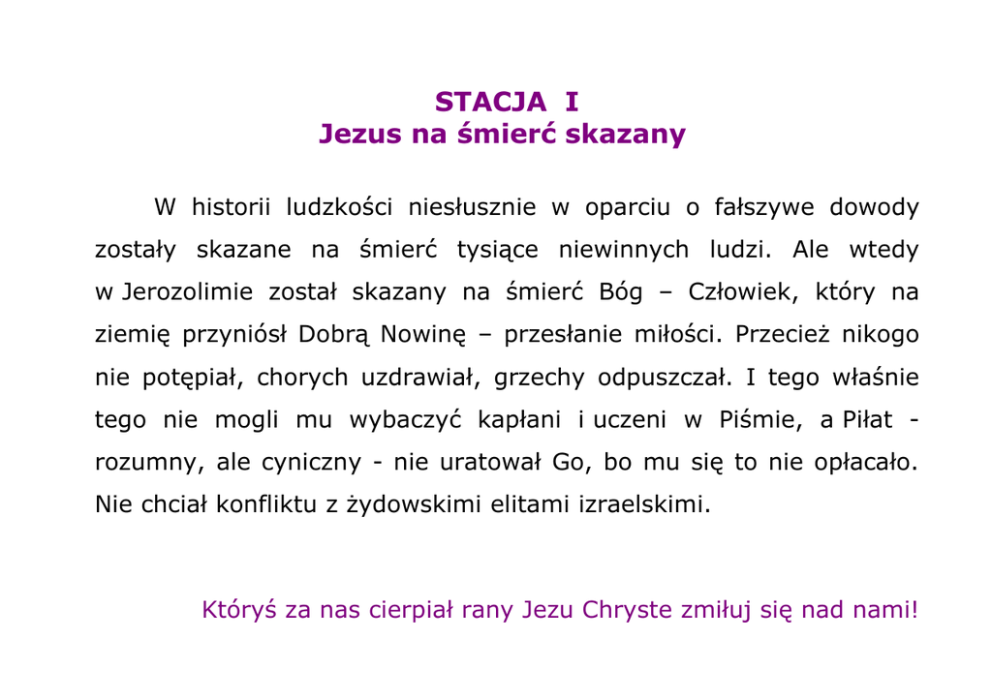 STACJA I Jezus na śmierć skazany W historii ludzkości niesłusznie w oparciu o fałszywe dowody zostały skazane na śmierć tysiące niewinnych ludzi. Ale wtedy w Jerozolimie został skazany na śmierć Bóg – Człowiek, który na ziemię przyniósł Dobrą Nowinę – przesłanie miłości. Przecież nikogo nie potępiał, chorych uzdrawiał, grzechy odpuszczał. I tego właśnie tego nie mogli mu wybaczyć kapłani i uczeni w Piśmie, a Piłat rozumny, ale cyniczny - nie uratował Go, bo mu się to nie opłacało. Nie chciał konfliktu z żydowskimi elitami izraelskimi. Któryś za nas cierpiał rany Jezu Chryste zmiłuj się nad nami! STACJA II Jezus bierze krzyż na swoje ramiona Krzyż, jak mówi św. Paweł, był dla Żydów znakiem hańby, a głupstwem dla pogan. Rzymianie po krzyż - jako źródło tortur i sposób na zadanie śmierci w męczarniach - sięgali nader często, chcąc utrzymać posłuszeństwo podległych ludów. To na krzyżu musiał umrzeć Jezus. Ale najpierw musiał zanieść sam to narzędzie hańby i tortur na wzgórze Golgoty zatłoczonymi ulicami ówczesnej Jerozolimy wśród w najlepszym razie obojętnych, jeżeli nie wrogo nastawionych ludzi. Któryś za nas cierpiał rany Jezu Chryste zmiłuj się nad nami! STACJA III Jezus po raz pierwszy upada Przed skazaniem żołnierze rzymscy - specjaliści w zadawaniu bólu i uśmiercaniu - na polecenie Piłata ubiczowali i z własnej inicjatywy ukoronowali cierniem Jezusa. To, a także inne przeżycia, udręka nocy przed męką, znacznie osłabiły siły Jezusa tak, że nie wytrzymał on trudu niesienia krzyża i upadł po raz pierwszy. Upadł, ale się podniósł - może podźwignęli go oprawcy - i poszedł dalej. Któryś za nas cierpiał rany Jezu Chryste zmiłuj się nad nami! STACJA IV Jezus spotyka Matkę swoją Bardzo bolesna i tragiczna dla obojga scena spotkania. Syn widzi swoją Matkę zbolałą. Wie, jak bardzo ona cierpi. I Matka widzi Syna skrwawionego, niewinnie skatowanego prowadzonego jak złoczyńca na śmierć krzyżową. Prawdopodobnie Matka znała sens, lub przynajmniej domyślała się sensu męki Syna. Przecież było zwiastowanie, przecież objawiła swoją wiarę w Syna wypowiadając w Kanie Galilejskiej słowami “Synu wina nie mają” prośbę o cudowne przysporzenie wina nowożeńcom. Ale czy było Jej przez to lżej? Któryś za nas cierpiał rany Jezu Chryste zmiłuj się nad nami! STACJA V Szymon Cyrenejczyk pomaga nieść krzyż Panu Jezusowi Żołnierze - zawodowcy w zadawaniu śmierci - przestraszyli się, że Jezus nie dojdzie do miejsca ukrzyżowania, że umrze po drodze. Zmusili więc Szymona z Cyreny do udzielenia pomocy w niesieniu krzyża. Tak to człowiek przypadkowy pomagał Panu w niesieniu krzyża. Czy Pan mu to wynagrodził? Tzw. apokryfy twierdzą, że synowie Szymona zostali pańskimi kapłanami. Któryś za nas cierpiał rany Jezu Chryste zmiłuj się nad nami! STACJA VI Św. Weronika ociera twarz Panu Jezusowi Dobra, współczująca niewiasta Weronika przedarła się przez tłum, ominęła żołnierzy i swoją chustą otarła zmęczoną, zakrwawioną i przepoconą twarz Pana.. Przyniosło mu to na pewno ulgę. W nagrodę otrzymała wizerunek twarzy Chrystusa pozostawiony na tej chuście. Pan nie pozostawia ludzkiej pomocy bez nagrody. Wierzymy, że dotyczy to również dobrych uczynków uczynionych na rzecz maluczkich: “Cokolwiek uczyniliście na rzecz jednego z najmniejszych, mnieście uczynili” Któryś za nas cierpiał rany Jezu Chryste zmiłuj się nad nami! STACJA VII Jezus po raz drugi upada Siły Jezusa mocno nadwątlone przebytymi już męczarniami zawiodły. Upadł po raz drugi po ciężarem krzyża. Jest to być może również znak, że i my upadać będziemy - pod ciężarem własnych krzyży, a może grzechu. Pan jednak powstał z upadku, prośmy Go o pomoc do powstania z naszych upadków. Któryś za nas cierpiał rany Jezu Chryste zmiłuj się nad nami! STACJA VIII Pan Jezus spotyka płaczące niewiasty Kobieta ze swej natury skłonna jest do współczucia cierpiącemu. Czasem jest to płytkie nastrojowe i przelotne współczucie. Jednak czasem jest to głębokie przejęcie cudzym losem. U płaczących niewiast jerozolimskich występowały pewnie te obydwie postawy. Ale Pan Jezus zamiast dać im odczuć swoją wdzięczność, choć zapewne taką odczuwał, mówi o tym co naprawdę jest ważne: “Nie płaczcie nade mną, ale nad synami waszymi”. Miał na myśli ich los ostateczny, ale może myślał także o tragicznym losie Żydów, którzy za około 40 lat byli metodycznie wyniszczani przez Rzymian. Któryś za nas cierpiał rany Jezu Chryste zmiłuj się nad nami! STACJA IX Pan Jezus po raz trzeci upada Siły Jezusa słabną, krzyż robi się coraz cięższy. Nie wystarcza już pomoc Cyrenejczyka. Pewnie upadek ten sprawiły również moje grzechy. Ale Pan podnosi się i idzie dalej, by móc na Golgocie z krzyża powiedzieć “Wykonało się”. Któryś za nas cierpiał rany Jezu Chryste zmiłuj się nad nami! STACJA X Jezus z szat obnażony Obnażenie z szat Pana miało na celu większe Jego upokorzenie i pomnożenie i tak już niewiarygodnego cierpienia. Pewnie też żołnierze chcieli coś na skazańcu skorzystać: “o suknię jego los rzucali”. Ale ze stacji tej płynie przede wszystkim przestroga przed grzechami nieskromności prowadzącymi do nadużywania widoku ludzkiego ciała. Któryś za nas cierpiał rany Jezu Chryste zmiłuj się nad nami! STACJA XI Pan Jezus do krzyża przybity To już koniec drogi. Wprawni oprawcy - żołnierze rzymscy przybili Pana do krzyża i zawiesili między niebem a ziemią. Paradoksalnie można to określić słowami pieśni wielkopostnej “Bóg króluje z drzewa”. Takie było przeznaczenie Pana i On je wypełnił. Ale towarzyszą mu szyderstwa: “Zaufał Panu niechże go teraz Bóg wybawi“, “Jeżeli jesteś Synem Bożym zstąp z Krzyża”. Ojcze odpuść im, ale i nam, gdy nie wiemy 