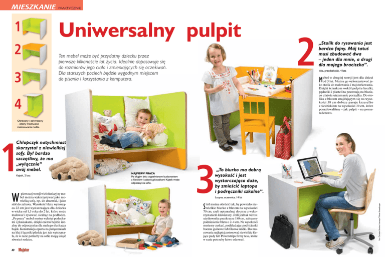 mieszkaNIE 1 2 3 praktycznIe Uniwersalny pulpit Ten mebel może być przydatny dziecku przez pierwsze kilkanaście lat życia. Idealnie dopasowuje się do rozmiarów jego ciała i zmieniających się oczekiwań. Dla starszych pociech będzie wygodnym miejscem do pisania i korzystania z komputera. 4 2 „Stolik do rysowania jest bardzo fajny. Mój tatuś musi zbudować dwa – jeden dla mnie, a drugi dla mojego braciszka”. Inka, przedszkolak, 4 lata M ebel w drugiej wersji jest dla dzieci od 3 lat. Można go wykorzystywać jako stolik do malowania i majsterkowania. Dzięki ściankom wokół pulpitu kredki, pędzelki i plastelina pozostają na blacie, co ułatwia utrzymanie porządku. Do stolika z blatem znajdującym się na wysokości 58 cm dobrze pasuje krzesełko z siedziskiem na wysokości 30 cm, które pomalowaliśmy – jak pulpit – na pomarańczowo. Obrócony i odwrócony – cztery możliwości zastosowania mebla. Kajtek, 2 lata W pierwszej wersji wielofunkcyjny mebel można wykorzystywać jako niewielką sofę, np. do drzemki, i jako stół do zabawy. Wysokość blatu wynosząca 22 cm jest wystarczająca dla dziecka w wieku od 1,5 roku do 2 lat, które może malować i rysować, siedząc na podłodze. „Po pracy” mebel można wyłożyć poduchami i pluszakami, dzięki czemu będzie idealny do odpoczynku dla małego słuchacza bajek. Konstrukcja oparta na połączeniach na klej i łączniki płaskie jest tak wytrzymała, że w razie potrzeby na sofie mogą usiąść również rodzice. 10 Najpierw praca Po długim dniu wypełnionym budowaniem z klocków i zabawą pluszakami Kajtek może odpocząć na sofie. 3 „To biurko ma dobrą wysokość i jest wystarczająco duże, by zmieścić laptopa i podręczniki szkolne”. Lucyna, uczennica, 14 lat S tół można obrócić tak, by powstało niewielkie biurko z blatem na wysokości 70 cm, czyli optymalnej do prac z wykorzystaniem klawiatury. Jeśli jednak wzrost użytkownika przekracza 180 cm, zalecamy podniesienie blatu o 2–4 cm. Na wysokości możemy zyskać, podkładając pod ścianki boczne gumowe lub filcowe nóżki. Do mocowania najlepiej zastosować niewielkie klejące pady lub Powerstrips firmy tesa, które w razie potrzeby łatwo oderwać. Fot. Christian Bordes; ilustracje Tillman Straszburger 1 Chłopczyk natychmiast skorzystał z niewielkiej sofy. Był bardzo szczęśliwy, że ma „wyłącznie” swój mebel. 11 mieszkaNIE praktycznIe Na łączniki płaskie Na okrągłe kołki Na wkręty Malowanie Co to jest? ...na wszelki wypadek 4 Wooden Patches „Mebel nadaje się do wykorzystania nawet jako mównica lub stół podczas przyjęć na stojąco”. 1 1 1 1 2 2 2 2 3 3 3 3 Franciszek, współpracownik „Majstra” W tej wersji mebel ustawiamy na boku – biurko staje się mównicą lub stolikiem do wykorzystania w trakcie party na stojąco. W tym przypadku pamiętajmy o podklejeniu gumowych podkładek na powierzchniach dotykających podłogi, by nie porysować pomalowanego drewna. Na wykonanie naszego mebla potrzebujemy ok. 8 godzin. Wprawdzie ma on prostą konstrukcję, ale uzyskanie idealnie pomalowanej powierzchni z co najmniej dwukrotnym szlifowaniem pośrednim warstw wymaga czasu. Budowa z płyt Stół wykonujemy z brzozowego multipleksu grubości 21 mm. Cały mebel kosztuje ponad 300 zł plus klej, kołki i odrobina farby. 4 Rady Wyrysowanie zaokrągleń w narożnikach za pomocą cyrkla jest dość trudne. Szybciej i łatwiej można to zrobić, posługując się jak szablonem puszką po farbie lub talerzem. 12 SERWIS Zdejmowane pady samoprzylepne z gumy lub pianki zapobiegają ślizganiu się mebla na pomalowanych krawędziach po gładkiej podłodze. 1. Ukośne krawędzie przycinamy na pile stołowej, której tarczę ustawiamy pod kątem 45°. 2. Do połączeń elementów z płyty najlepiej nadają się łączniki płaskie. Specjalną frezarką wycinamy otwory potrzebne do ich założenia. 3. Do wpustów nakładamy klej i wsuwamy łączniki (ewentualnie delikatnie wbijamy je młotkiem z tworzywa sztucznego). 4. Pojedyncze elementy łączymy ze sobą, a cały mebel owijamy samoprzylepną taśmą do pakowania. Gdy klej wyschnie, zdejmujemy taśmę. 4 1. Jeśli nie mamy piły stołowej, elementy możemy połączyć za pomocą okrągłych kołków drewnianych. W tym celu wiercimy otwory wiertłem z ogranicznikiem głębokości wiercenia. 2. Stosując markery do kołków, zaznaczamy miejsca wiercenia otworów w sąsiednich elementach i również je nawiercamy. 3. Do otworów nakładamy niewielką ilość kleju i wkładamy żebrowane kołki. 4. Posługując się ściskami śrubowymi i podkładkami z drewna (rozkład sił), mocno dociskamy wszystkie sklejone elementy. 4 1. Kolejny prostszy sposób łączenia przy użyciu wkrętów. Wiercimy w płytach otwory na wkręty o rozmiarach 3,5 x 45 mm w odstępach co 15 cm. 2. Aby łby wkrętów były zlicowane z powierzchnią płyt, wiercone otwory poszerzamy u wylotu pogłębiaczem. 3. Styki elementów pokrywamy klejem, a następnie łączymy płyty na wkręty. 4. Otwory po wkrętach wypełniamy masą szpachlową. 4 1. Drewniane płyty szpachlujemy (patrz także ramka serwisu po prawej), a potem szlifujemy, by uzyskać idealnie gładką powierzchnię. 2. Miejsca połączeń, na które później nakładamy klej, przed gruntowaniem dokładnie oklejamy taśmami. 3. Taśmy samoprzylepne zdejmujemy, gdy grunt jest jeszcze wilgotny. Gdy wyschnie, jeszcze raz go szlifujemy. 4. Ponownie nakładamy taśmy klejące i nanosimy wierzchnią warstwę farby. To płaskie, wycięte łatki, za pomocą których wypełnia się miejsca po sękach w brzozowym multipleksie. Ponieważ cienki fornir brzozowy pozyskuje się w wyniku procesu strugania, niewielkie sęki pojawiają się cyklicznie w drewnianej powierzchni i częściowo ulegają wyłamaniu. Aby uzyskać jednolitą powierzchnię, sęki wycina się i zastępuje Wooden Patches. Przed pomalowaniem należy je dodatkowo zaszpachlować. Kołki