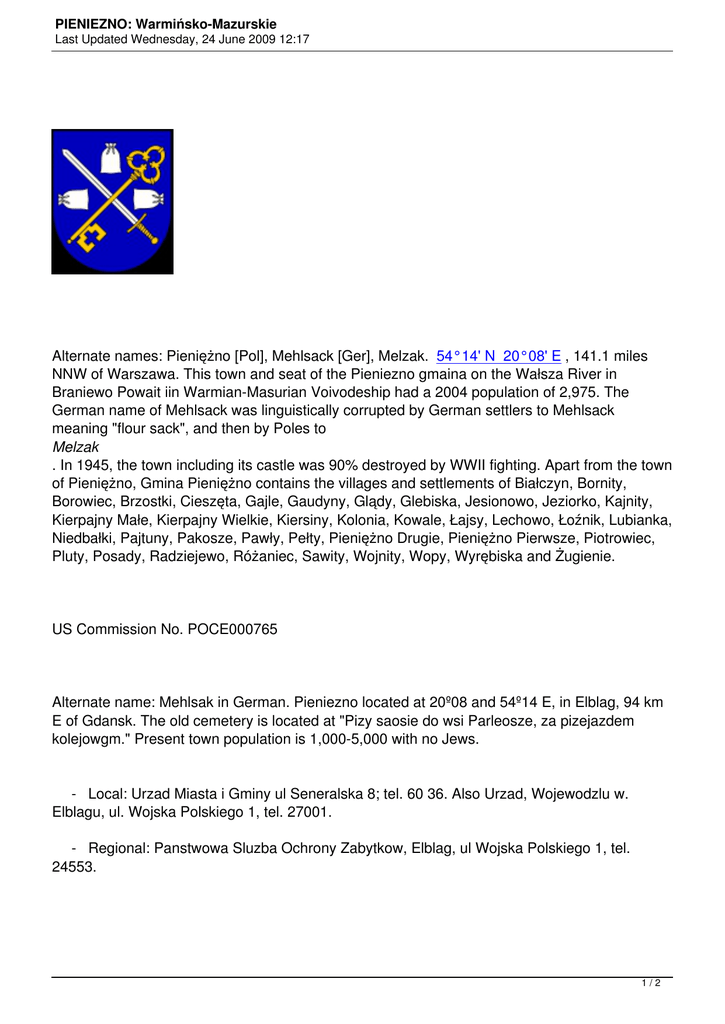 PIENIEZNO: Warmińsko-Mazurskie Last Updated Wednesday, 24 June 2009 12:17 Alternate names: Pieniężno [Pol], Mehlsack [Ger], Melzak. 54°14' N 20°08' E , 141.1 miles NNW of Warszawa. This town and seat of the Pieniezno gmaina on the Wałsza River in Braniewo Powait iin Warmian-Masurian Voivodeship had a 2004 population of 2,975. The German name of Mehlsack was linguistically corrupted by German settlers to Mehlsack meaning "flour sack", and then by Poles to Melzak . In 1945, the town including its castle was 90% destroyed by WWII fighting. Apart from the town of Pieniężno, Gmina Pieniężno contains the villages and settlements of Białczyn, Bornity, Borowiec, Brzostki, Cieszęta, Gajle, Gaudyny, Glądy, Glebiska, Jesionowo, Jeziorko, Kajnity, Kierpajny Małe, Kierpajny Wielkie, Kiersiny, Kolonia, Kowale, Łajsy, Lechowo, Łoźnik, Lubianka, Niedbałki, Pajtuny, Pakosze, Pawły, Pełty, Pieniężno Drugie, Pieniężno Pierwsze, Piotrowiec, Pluty, Posady, Radziejewo, Różaniec, Sawity, Wojnity, Wopy, Wyrębiska and Żugienie. US Commission No. POCE000765 Alternate name: Mehlsak in German. Pieniezno located at 20º08 and 54º14 E, in Elblag, 94 km E of Gdansk. The old cemetery is located at "Pizy saosie do wsi Parleosze, za pizejazdem kolejowgm." Present town population is 1,000-5,000 with no Jews. - Local: Urzad Miasta i Gminy ul Seneralska 8; tel. 60 36. Also Urzad, Wojewodzlu w. Elblagu, ul. Wojska Polskiego 1, tel. 27001. - Regional: Panstwowa Sluzba Ochrony Zabytkow, Elblag, ul Wojska Polskiego 1, tel. 24553. 1/2 PIENIEZNO: Warmińsko-Mazurskie Last Updated Wednesday, 24 June 2009 12:17 The earliest known Jewish community was after 1772. In 1937, 5 Jewish families lived here. The unlandmarked Orthodox and Progressive/Reform cemetery probably was established mid-19th century. There was a "Judenedikt in 1812. The isolated suburban flat land and hillside has no sign or marker. Reached by turning directly off a public road, access is open to all with a broken fence without gate. The approximate size before WWII and then was.20 ha. (Now, does not exist.) No stones are visible. There are no known mass graves or structures. The municipality owns the property used for recreation. Adjacent property is recreational. The cemetery is liquidated; there is now a stadium. It was vandalized prior and during World War II, but not in the last ten years. No maintenance. Wiktor Knercer; 10-685 Olsztyn, ul Baicza 33/16, tel. 33-86-07, completed survey 9/1992 after a visit in June 1992. He used a 1920 map and Deutsches Staedebuch, by Erich Renser 1939. and A. Sommerfeld-Juden im Armland. 2/2