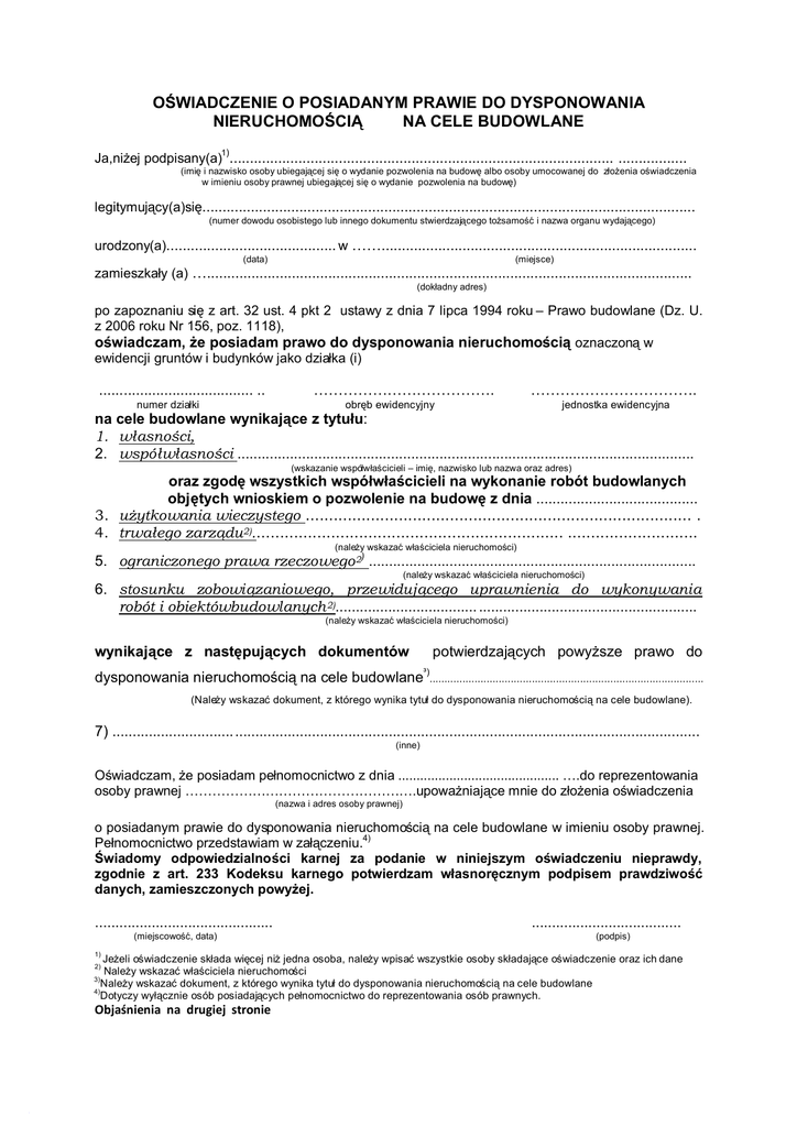 OŚWIADCZENIE O POSIADANYM PRAWIE DO DYSPONOWANIA NIERUCHOMOŚCIĄ NA CELE BUDOWLANE Ja,niżej podpisany(a)1)............................................................................................... ................. (imię i nazwisko osoby ubiegającej się o wydanie pozwolenia na budowę albo osoby umocowanej do złożenia oświadczenia w imieniu osoby prawnej ubiegającej się o wydanie pozwolenia na budowę) legitymujący(a)się.......................................................................................................................... (numer dowodu osobistego lub innego dokumentu stwierdzającego tożsamość i nazwa organu wydającego) urodzony(a).......................................... w …….............................................................................. (data) (miejsce) zamieszkały (a) …........................................................................................................................ (dokładny adres) po zapoznaniu się z art. 32 ust. 4 pkt 2 ustawy z dnia 7 lipca 1994 roku – Prawo budowlane (Dz. U. z 2006 roku Nr 156, poz. 1118), oświadczam, że posiadam prawo do dysponowania nieruchomością oznaczoną w ewidencji gruntów i budynków jako działka (i) ...................................... .. numer działki ………………………………. obręb ewidencyjny ……………………………. jednostka ewidencyjna na cele budowlane wynikające z tytułu: 1. własności, 2. współwłasności ................................................................................................................. (wskazanie współwłaścicieli – imię, nazwisko lub nazwa oraz adres) oraz zgodę wszystkich współwłaścicieli na wykonanie robót budowlanych objętych wnioskiem o pozwolenie na budowę z dnia ........................................ 3. użytkowania wieczystego ................................................................................... . 4. trwałego zarządu2)................................................................... ............................ (należy wskazać właściciela nieruchomości) 5. ograniczonego prawa rzeczowego 2) ................................................................................. (należy wskazać właściciela nieruchomości) 6. stosunku zobowiązaniowego, przewidującego uprawnienia do wykonywania robót i obiektówbudowlanych 2)................................... ...................................................... (należy wskazać właściciela nieruchomości) wynikające z następujących dokumentów potwierdzających powyższe prawo do dysponowania nieruchomością na cele budowlane³)........................................................................................... (Należy wskazać dokument, z którego wynika tytuł do dysponowania nieruchomością na cele budowlane). 7) ................................................................................................................................................. (inne) Oświadczam, że posiadam pełnomocnictwo z dnia ............................................ ….do reprezentowania osoby prawnej …………………………………………….upoważniające mnie do złożenia oświadczenia (nazwa i adres osoby prawnej) o posiadanym prawie do dysponowania nieruchomością na cele budowlane w imieniu osoby prawnej. Pełnomocnictwo przedstawiam w załączeniu.4) Świadomy odpowiedzialności karnej za podanie w niniejszym oświadczeniu nieprawdy, zgodnie z art. 233 Kodeksu karnego potwierdzam własnoręcznym podpisem prawdziwość danych, zamieszczonych powyżej. ............................................ (miejscowość, data) 1) ..................................... (podpis) Jeżeli oświadczenie składa więcej niż jedna osoba, należy wpisać wszystkie osoby składające oświadczenie oraz ich dane Należy wskazać właściciela nieruchomości 3) Należy wskazać dokument, z którego wynika tytuł do dysponowania nieruchomością na cele budowlane 4) Dotyczy wyłącznie osób posiadających pełnomocnictwo do reprezentowania osób prawnych. 2) Objaśnienia na drugiej stronie OBJAŚNIENIA *) jeżeli roboty budowlane nie mają związku z nieruchomością gruntową, a dotyczą wyłącznie nieruchomości lokalowej, składając niniejsze oświadczenie, które odnosić się będzie do własności samodzielnego lokalu mieszkalnego, a także lokalu o innym przeznaczeniu, stanowiącego odrębną nieruchomość, należy wskazać akt ustanawiający odrębną własność lokalu oraz określić udział w nieruchomości wspólnej jako prawie związanym z własnością lokalu, zgodnie z ustawą z dnia 24 czerwca 1994 roku o własności lokali (Dz. U. z 2000 roku Nr 80, póz. 903 z późniejszymi zmianami). Jednocześnie należy zaznaczyć lokal na rzucie odpowiedniej kondygnacji budynku wraz z pomieszczeniami do niego przynależnymi, a w przypadku położenia pomieszczeń przynależnych poza budynkiem mieszkalnym, także na wyrysie z operatu ewidencyjnego. Przez prawo do dysponowania nieruchomością na cele budowlane należy rozumieć tytuł prawny wynikający z prawa własności, użytkowania wieczystego, zarządu, ograniczonego prawa rzeczowego albo stosunku zobowiązaniowego, przewidującego uprawnienia do wykonywania robót budowlanych, zgodnie z art. 3 pkt 11 ustawy z dnia 7 lipca 1994 roku Prawo budowlane (Dz. U. z 2006 roku Nr 156, póz. 1118 z późniejszymi zmianami). Formy i odmiany własności, wynikające z regulacji ustawy z dnia 23 kwietnia 1964 roku Kodeks cywilny (Dz. U. z 1964 roku Nr 16, póz. 93 z późniejszymi zmianami): 1. Współwłasność - to współwłasność łączna wynikającą ze współwłasności majątkowej między małżonkami, albo współwłasność w częściach ułamkowych powstała np. ze spadkobrania, gdy spadek przechodzi na kilku spadkobierców. 2. Użytkowanie wieczyste jest uregulowane w tytule II Kodeksu cywilnego oraz w ustawie z dnia 21 s