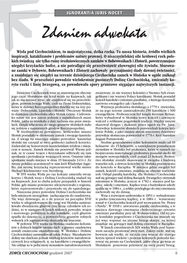 Wis∏a pod Ciechocinkiem, to majestatyczna, dzika rzeka. To nasza historia, êród∏o wielkich inspiracji, kataklizmów i problemów natury prawnej. O niszczycielskiej sile królowej rzek polskich Êwiadczà nie tylko ruiny Êredniowiecznych zamków w Bobrownikach i Z∏otorii, powstrzymujace niegdyÊ krzy˝ackie hufce, a nie potrafiàce si´ przeciwstawiç z∏owrogiej sile ˝ywio∏u. Murowane zamki w Dybowie, Bobrownikach i Z∏otorii zachowa∏y przynajmniej Êlady dawnej ÊwietnoÊci, a znajdujàcy si´ niegdyÊ na terenie dzisiejszego Ciechocinka zamek w S∏oƒsku w ogóle zniknà∏ bez Êladu. W przesz∏oÊci powodzie wielokrotnie pustoszy∏y Dolin´ Ciechociƒskà, zmienia∏y koryto rzeki i lini´ brzegowà, co powodowa∏o spory gruntowe si´gajàce najwy˝szych instancji. Dzisiejszy Ciechocinek wraz ze stanowiàcym obecnie jego cz´Êç S∏oƒskiem nie le˝a∏ wcale na Kujawach, tak jak to ma miejsce teraz, ale znajdowa∏ si´ na przeciwleg∏ym, prawym brzegu Wis∏y, czyli na Ziemi Dobrzyƒskiej, która w dawnej Rzeczypospolitej dzieli∏a si´ na trzy powiaty: Dobrzyƒski, Lipieƒski i S∏oƒski. Ówczesny S∏oƒsk to dzisiejsza ciechociƒska ulica S∏oƒsk Górny. Uzdrowisko nasze nie jest zatem jednym z najm∏odszych miast Polski, jakby to wynika∏o z daty nadania mu praw miejskich. Dzi´ki w∏àczeniu do niego gruntów s∏oƒskich sta∏o si´ jednym z najstarszych grodów Rzeczypospolitej. W Êredniowieczu powiatowe, królewskie miasto S∏oƒsk posiada∏o w drewniany zamek i swojego kasztelana. Z uwagi na niszczàce miasto powodzie kasztelan s∏oƒski nie czerpa∏ ze swej godnoÊci ˝adnych korzyÊci. Zadawala∏ si´ honorowym kasztelaƒskim tytu∏em i miejscem w senacie. Zamek s∏oƒski nie przetrwa∏. Wiemy jednak, ˝e w czasie wojen z Krzy˝akami odbywa∏y si´ tam spotkania i pertraktacje wojujàcych stron. Ostatnie takie spotkanie mia∏o miejsce w dniu 19 listopada 1414 r. Ze strony polskiej uczestniczy∏ w nim król W∏adys∏àw Jagie∏∏o, zaÊ stron´ krzy˝ackà reprezentowa∏ wielki mistrz Michael Küchmeister von Sternberg. W XVI wieku Wis∏a po raz kolejny zmieni∏a swoje koryto i S∏oƒsk wraz z Dolinà Ciechociƒskà znalaz∏ si´ na Kujawach. Jest to chyba jedyny przypadek w historii Polski, gdy miasto powiatowe zdezerterowa∏o z regionu, który reprezentowa∏o i przenios∏o si´ do sàsiedniego. Niszczona przez powodzie Dolina Ciechociƒska nie by∏a miejscem szczególnie zach´cajàcym do osadnictwa. Nic wi´c dziwnego, ˝e o ile jeszcze na poczàtku XVII wieku w zdegradowanym do rangi wsi S∏oƒsku zamieszkiwa∏o dwudziestu gburów (nie liczàc cz∏onków ich rodzin), to w nast´pnych latach wskutek powodzi, wojen i morowego powietrza liczba rolników, czyli gburów spad∏a do dziesi´ciu, a powierzchnia gruntów rolnych wskutek ich zapiaszczenia skurczy∏a si´ znacznie. W po∏owie XVII wieku na S∏oƒsku osadzono kolonistów z dolnych krajów niemieckich, a granice osadnictwa zosta∏y ostatecznie ukszta∏towane. W S∏oƒsku i Dolinie Ciechociƒskiej zamieszkiwali tak˝e Polacy. Mieszkaƒców doliny nie dzielono jednak wed∏uig kryteriów narodowoÊciowych lecz religijnych, tj. na katolików i ewangelików. Nie oddaje to w pe∏ni istoty stosunków narodowoÊciowych ZDRÓJ CIECHOCI¡SKI grudzieƒ 2007 zwa˝ywszy, ˝e nie wszyscy koloniÊci z Niemiec byli ewangelikami i nie wszyscy Polacy katolikami. S∏oƒsk posiada∏ koÊció∏ katolicki i cmentarz parafialny, z którego korzystali zarówno ewangelicy jak i katolicy. Wizytacja probostwa s∏oƒskiego z 1779 r. stwierdza, ˝e na jego terenie zamieszkiwa∏o 250 katolików i 300 ewangelików. Proboszczem by∏ ksiàdz Krystian Bytnar, który wybudowa∏ w S∏oƒsku nowy koÊció∏ i zawzi´cie walczy∏ z reliktami pogaƒskich tradycji. Mi´dzy innymi skasowa∏ dyngus i skakanie przez ogieƒ na Âw. Jana. Przywileje kolnistów s∏oƒskich potwierdzali kolejni królowie Polski, a jako ostatni aktem wieczystej dzier˝awy przywileje s∏oƒszczan potwierdzi∏ w 1776 r. Król Stanis∏aw August Poniatowski, Ârednie gospodarstwo rolne kolonistów mia∏o od 10 hektarów do 15 hektarów, a najwi´kszym posiadaczem ziemskim w S∏oƒsku by∏ proboszcz, który w ramach zabezpieczenia materialnego probostwa posiada∏ oko∏o 40 morgów nowopolskich, czyli ponad 22 hektary. Probostwo s∏oƒskie zosta∏o skasowane w zwiàzku z budowà warzelni soli, a dzwon koÊcielny ze S∏oƒska przeniesiono do koÊcio∏a w Racià˝ku. W miejscu gdzie niegdyÊ by∏ zamek, koÊció∏ i cmentarz, znajdujà si´ obecnie warzelnie soli. Odtàd parafià katolickà dla S∏oƒska i Ciechocinka sta∏ si´ górujàcy nad dolinà Racià˝ek. Ewangelicy otrzymali natomiast w S∏oƒsku, jeszcze w 1782 r. miejsce pod kaplic´, szko∏´ i cmentarz. Kaplica wraz z budynkiem szko∏y spali∏a si´ w 1984 r., a relikty przyleg∏ego do niej cmentarza zachowa∏y si´ do dzisiaj. Wraz z rozwojem uzdrowiska w 1851 r. wybudowano w parku tymczasowà kaplic´, a w 1884 r. wzniesiony zosta∏ w Ciechocinku koÊció∏ pod wezwaniem Âw. Piotra i Paw∏a”. W 1918 r. utworzono parafi´ ciechociƒskà, a w miejscu dawnego cmentarza cholerycznego otwarto cmentarz parafialny przy ul. Wo∏uszewskiej. Od tej pory kondukty pogrzebowe z Ciechocinka nie musia∏y si´ ju˝ wi´c wspinaç na strome brzegi skarpy, na której znajduje si´ górujàcy nad dolinà cmentarz w Racià˝ku. W latach czterdziestych XIX wieku Wis∏a pod Siarzewem zacz´∏a prostowaç swój nurt. Zakr´t rzeki sta∏ si´ bowiem tak wielki, ˝e zacz´∏a ona wracaç do starego koryta sprzed wieków i podczas kolejnych powodzi kierowaç si´ prosto na Ciechocinek, jakby chcàc go wraz ze S∏oƒskiem ponownie przenieÊç na swój prawy brzeg, 8 do dawnej Ziemi Dobrzyƒskiej. W czasie powodzi g∏ówny nurt rzeki przechodzi∏ wi´c przez Ciechocinek niszczàc uzdrowisko, a ponadto Wis∏a oderwa∏a od S∏oƒsk