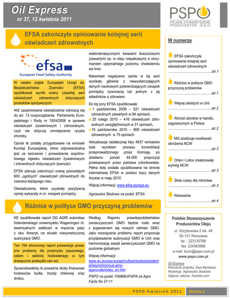 Oil Express nr 37, 12 kwietnia 2011 EFSA zakończyła opiniowanie kolejnej serii oświadczeń zdrowotnych wielonienasyconymi kwasami tłuszczowymi (zawartymi np. w oleju rzepakowym) a utrzymaniem optymalnego poziomu cholesterolu we krwi. Natomiast negatywne opinie w tej serii wynikały głównie z niewystarczających danych naukowych potwierdzających związek pomiędzy Ŝywnością lub jednym z jej składników a zdrowiem. W ostatni piątek Europejski Urząd ds. Bezpieczeństwa śywności (EFSA) opublikował wyniki oceny czwartej serii oświadczeń zdrowotnych dotyczących produktów spoŜywczych. Do tej pory EFSA opublikowała: 1 października 2009 – 521 oświadczeń 442 zaopiniowane oświadczenia odnoszą się zdrowotnych zawartych w 94 opiniach, do art. 13 rozporządzenia Parlamentu Euro25 lutego 2010 – 416 oświadczeń zdropejskiego i Rady nr 1924/2006 w sprawie wotnych uwzględnionych w 31 opiniach, oświadczeń Ŝywieniowych i zdrowotnych, 19 października 2010 – 808 oświadczeń czyli nie dotyczą zmniejszenia ryzyka zdrowotnych w 75 opiniach choroby. Opinie te zostały przygotowane na wniosek Komisji Europejskiej, która odpowiedzialna jest za tworzenie i prowadzenie wspólnotowego rejestru oświadczeń Ŝywieniowych i zdrowotnych dotyczących Ŝywności. EFSA planuje zakończyć ocenę pozostałych 600 „ogólnych” oświadczeń zdrowotnych do czerwca bieŜącego roku. Aktualizacja ostatecznej listy 4637 wniosków była wynikiem procesu konsolidacji przeprowadzonego przez Komisję, po zbadaniu ponad 44.000 propozycji przekazanych przez państwa członkowskie. Pełna lista została opublikowana na stronie internetowej EFSA w postaci bazy danych Access w maju 2010. Więcej informacji: www.efsa.europa.eu Oświadczenia, które uzyskały pozytywną opinię wykazały m.in. związek pomiędzy Agnieszka Słodowa na podst. EFSA W numerze EFSA zakończyła opiniowanie kolejnej serii oświadczeń zdrowotnych ………………………………..str.1 RóŜnice w polityce GMO przyczyną problemów …………………...……...…...str.1 Więcej oleistych w Unii …………………...……...…...str.2 Wzrost obrotów w handlu zagranicznym w Polsce …………………...……...…...str.2 MG analizuje moŜliwość obniŜenia NCW ………………………......…...str.3 Orlen i Lotos zrealizowały wymóg NCW …………..……………….......str.3 Złote czasy dla rolnictwa …………..……………….......str.3 Notowania ………………...………...…...str.4 RóŜnice w polityce GMO przyczyną problemów KE opublikowała raport DG AGRI autorstwa holenderskiego uniwersytetu Wageningen nt. ewentualnych zakłóceń w imporcie pasz z obu Ameryk na skutek niesymetrycznej autoryzacji GMO. Według Raportu prawdopodobieństwo zanieczyszczeń GMO będzie rosło wraz z pojawianiem się nowych odmian GMO. Jako rozwiązanie problemu raport proponuje przyśpieszenie autoryzacji GMO w Unii oraz harmonizację zasad zanieczyszczeń GMO na Ten 154 stronicowy raport przewiduje powapoziomie globalnym. Ŝne problemy dla przemysłu paszowego, zatem i sektora hodowlanego w tym Więcej informacji: drastyczne podwyŜki cen soi. www.ec.europa.eu/agriculture/analysis/extern al/asynchronous-gmoSpowodowałoby to powaŜne straty finansowe approvals/index_en.htm hodowców bydła, trzody chlewnej oraz PSPO na podst. FAMMU/FAPA za Agra drobiu. Facts No 27-11 Polskie Stowarzyszenie Producentów Oleju ul. Grzybowska 2 lok. 49 00-131 Warszawa tel. : 223130788 fax: 224363966 e-mail: [email protected] www.pspo.com.pl Oil Express Kierownik projektu: Ewa Myśliwiec Redakcja: Agnieszka Słodowa Zdjęcia: własne, freefoto.com PSPO Kwiecień 2011 Strona 1 Oil Express Więcej oleistych w Unii Francuska organizacja COCERAL podała do wiadomości prognozy zbiorów roślin oleistych w Unii, które prawdopodobnie będą w br. na poziomie około 28,1 mln ton wobec 27,9 mln ton w 2010 roku (+0,8%). COCERAL prognozuje wzrost produkcji słonecznika o 4,2% do 6,9 mln ton na skutek wzrostu powierzchni uprawy z około 3,6 mln ha do 3,9 mln ha przy załoŜeniu spadku plonów z 1,84 do 1,78 t/ha. Zbiory soi pozostaną tradycyjnie na niewielkim poziomie około 1,1 mln ton wobec 0,9 mln ton przed rokiem (+18%). PSPO na podst. COCERAL, FAMMU/FAPA Całkowity areał oleistych w UE27 wyniesie 11,05 mln ha wobec 10,79 mln ha, ale średnie plony powinny się nieznacznie zmniejszyć z 2,59 t/ha do 2,55 t/ha. Według COCERAL unijna produkcja nasion rzepaku w sezonie 2011/12 prognozowana jest na 20,19 mln ton, czyli nieznacznie tylko mniej niŜ w poprzednim sezonie – 20,40 mln ton. Większe zbiory odnotują takie kraje jak: Francja, Wielka Brytania, Polska Hiszpania. Spadek produkcji spodziewany jest w Niemczech, Rumunii i Czechach. Źródło: COCERAL Wzrost obrotów w handlu zagranicznym w Polsce W 2010 r. w polskim handlu nasionami W 2010 roku w polskim handlu nasionami oleistych i produktami ich przerobu oleistymi i produktami ich przetwórstwa odnotowano wzrost obrotów. tradycyjnie dominował import. W 2010 roku wartość importu osiągnęła Wartość eksportu tej grupy produktów 1229,5mln €, tj. o 15% więcej w stosunku zwiększyła się w stosunku do do roku 2009. W strukturze towarowej poprzedniego roku o 16,9% do 494 mln tradycyjnie największy udział miały €, natomiast importu wzrosła o 15% do makuchy oleistych i śruta sojowa. 1229,5 mln €. Wartość zakupów śruty sojowej w 2010 W efekcie saldo wymiany handlowej roku zwiększyła się w stosunku do pogorszyło się. Ujemny bilans w handlu poprzedniego roku o 11% do około oleistymi zwiększył się do minus 735,5 596,2 mln €, przy 9% wzroście ich mln € wobec minus 646,9 mln € rok wolumenu do ok. 1,93 mln ton. wcześniej. W 2010 roku zaobserwowano istotny Tradycyjnie wartość importu przewyŜsza- wzrost wartości eksportu grupy oleistych ła wartość eksportu w trzech rozpatrywa- do 494 mln €, tj. o 17% w stosunku do nych grup