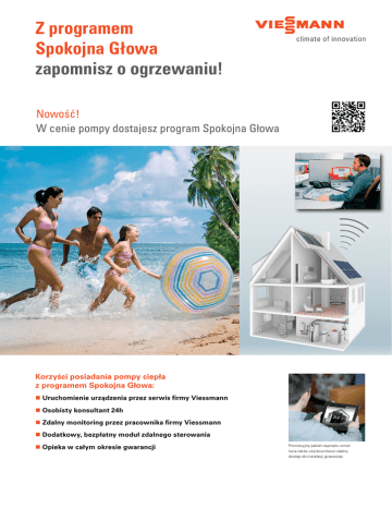 Z programem Spokojna Głowa zapomnisz o ogrzewaniu! Nowość! W cenie pompy dostajesz program Spokojna Głowa Korzyści posiadania pompy ciepła z programem Spokojna Głowa: U ruchomienie urządzenia przez serwis firmy Viessmann O sobisty konsultant 24h Z dalny monitoring przez pracownika firmy Viessmann D odatkowy, bezpłatny moduł zdalnego sterowania O pieka w całym okresie gwarancji Promocyjny pakiet osprzętu umożliwia także użytkownikowi zdalny dostęp do instalacji grzewczej. Zapomnij o ogrzewaniu! Z programem Spokojna Głowa zyskujesz ochronę przez 24 godziny na dobę niezależnie od miejsca Twojego pobytu Akcja promocyjna trwa od 01.06 do 30.09.2016 r. Urządzenia objęte programem Spokojna Głowa to wszystkie pompy ciepła z oferty firmy Viessmann (powietrzne i gruntowe) Zalety przystąpienia do Programu Spokojna Głowa: Uruchomienie urządzenia – gratis! 2 lata gwarancji na nadzór i ochronę pracy urządzenia przez służby techniczne, 24 godziny na dobę niezależnie od miejsca Twojego pobytu otrzymanie urządzenia do zdalnego monitorowania (Vitocom 100 LAN ) o wartości 1200 PLN za 1 PLN, które zamontujemy w Twojej pompie ciepła, możliwość podglądu bądź dokonywania zmian parametrów pracy urządzenia – a wszystko to w Twoim telefonie dzięki bardzo intuicyjnej i prostej aplikacji Vitotrol App. 1 2 3 4 5 6 7 Schemat instalacji modułu 1 Vitotrol App 5 Internet i serwer Vitodata Vitocom 100 LAN 2 iPod Touch 6 Router DSL 3 smartfon (iOS lub Android) 7 Vitocom 100 (typ LAN1) 4 tablet (iOS lub Android 8 pompa ciepła Dajemy Ci komfort i poczucie bezpieczeństwa! W razie jakichkolwiek pytań pozostajemy do Twojej dyspozycji – tel.: 801 0 801 24 Wymagania dotyczące wyposażenia kotłowni: miejsce do montażu produktu Vitocom 100 LAN doprowadzenie przewodu LAN do miejsca montażu urządzenia, w miejscu montażu powinna być możliwość udostępnienia łącza internetowego montaż pompy ciepła zgodnie z wytycznymi firmy Viessmann Już dziś skorzystaj z programu Spokojna Głowa: w ypełnij formularz kontaktowy skontaktuje się z Tobą doradca firmy Viessmann przygotuje kompleksową ofertę dopasowaną do Twoich potrzeb montażu i uruchomienia urządzenia dokonają najlepsi Partnerzy firmy Viessmann Dzięki modułowi komunikacyjnemu Vitocom 100 LAN1 wyposażamy Państwa kotłownię w możliwość zdalnego sterowania parametrami systemu grzewczego oraz mozliwość nadzoru i ochronę pracy urządzenia przez służby techniczne firmy Viessmann. Dowiedz się więcej na specjalnej stronie internetowej: www.viessmann.pl/spokojnaglowa lub pod numerem infolinii: tel. 801 0 801 24 Moduł komunikacyjny Vitocom 100 (typ LAN1) PL 06/2016 Zmiany zastrzeżone Viessmann sp. z o.o. 53-015 Wrocław, ul. Karkonoska 65 tel. 71/ 36 07 100, Infolinia: 801 0801 24 www.viessmann.pl 8