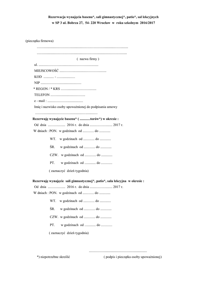 Rezerwacja wynajęcia basenu*, sali gimnastycznej*, patio*, sal lekcyjnych w SP 3 ul. Bobrza 27, 54- 220 Wrocław w roku szkolnym 2016/2017 (pieczątka firmowa) ......................................................................................................... ........................................................................................................ ( nazwa firmy ) ul. ..................................................................... MIEJSCOWOŚĆ ...................................................... KOD ............ - ..................... NIP ............................................... * REGON / * KRS ......................................... TELEFON ........................................ e - mail : ......................................... Imię i nazwisko osoby upoważnionej do podpisania umowy ........................................................................ Rezerwuję wynajęcie basenu* ( ............torów*) w okresie : Od dnia .................... 2016 r. do dnia .......................... 2017 r. W dniach : PON. w godzinach od ............. do ............. WT. w godzinach od ............. do ............. ŚR. w godzinach od ............. do ............. CZW. w godzinach od ............. do ............. PT. w godzinach od ............. do ............. ( zaznaczyć dzień tygodnia) Rezerwuję wynajęcie sali gimnastycznej*, patio*, sala lekcyjna w okresie : Od dnia .................... 2016 r. do dnia .......................... 2017 r. W dniach : PON. w godzinach od ............. do ............. WT. w godzinach od ............. do ............. ŚR. w godzinach od ............. do ............. CZW. w godzinach od ............. do ............. PT. w godzinach od ............. do ............. ( zaznaczyć dzień tygodnia) ................................................................... *) niepotrzebne skreślić ( podpis i pieczątka osoby upoważnionej)