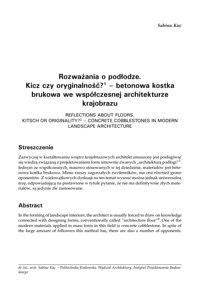 Sabina Kuc Rozważania o podłodze. Kicz czy oryginalność?1 – betonowa kostka brukowa we współczesnej architekturze krajobrazu REFLECTIONS ABOUT FLOORS. KITSCH OR ORIGINALITY?2 – CONCRETE COBBLESTONES IN MODERN LANDSCAPE ARCHITECTURE Streszczenie Zazwyczaj w kształtowaniu wnętrz krajobrazowych architekt zmuszony jest posługiwać się wiedzą związaną z projektowaniem form umownie zwanych „architekturą podłogi”3. Jednym ze współczesnych, masowo stosowanych w tej dziedzinie, materiałów jest betonowa kostka brukowa. Mimo rzeszy zagorzałych zwolenników, ma ona również grono oponentów. Z wielowątkowych dyskusji na ten temat wysnuć można jednak uniwersalną tezę, odpowiadającą na postawione w tytule pytanie, że nie ma definitywnie złych materiałów, są jedynie źle zastosowane. Abstract In the forming of landscape interiors, the architect is usually forced to draw on knowledge connected with designing forms, conventionally called “architecture floor”4. One of the modern materials applied in mass form in this field is concrete cobblestone. In spite of the large amount of followers this method has, there are also a number of opponents. dr inż. arch. Sabina Kuc – Politechnika Krakowska, Wydział Architektury, Instytut Projektowania Budowlanego However, from the many discussions on this subject, one can conclude that there are no completely inappropriate materials, but that they are inappropriately used. Por. własny materiał źródłowy autora dla niniejszego artykułu: Sabina Kuc, Betonowa kostka brukowa- kicz czy oryginalność, Budownictwo, Technologie, Architektura, numer specjalny 2005, s. 18-22. 2 Author’s own source material for this article: Sabina Kuc, Concrete cobblestone – kitsch or originality, Building Technologies Architecture, special edition, 2005, s. 18-22. 3 Konrad Kucza-Kuczyński, O podłodze, Rozmyślania przy desce architekta, Architekt, 9-10/2000, s. 10. 4 Konrad Kucza-Kuczyński, About floors, Thoughts at the architect’s desk, Architect, 9-10/2000, s. 10. 1