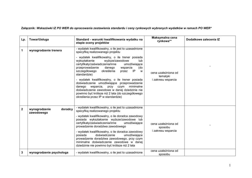 Załącznik: Wskazówki IZ PO WER do opracowania zestawienia standardu i ceny rynkowych wybranych wydatków w ramach PO WER* Lp. Towar/Usługa 1 wynagrodzenie trenera Standard - warunki kwalifikowania wydatku na etapie oceny projektów - wydatek kwalifikowalny, o ile trener posiada doświadczenie umożliwiające przeprowadzenie danego wsparcia, przy czym minimalne doświadczenie zawodowe w danej dziedzinie nie powinno być krótsze niż 2 lata (do szczegółowego określenia przez IP w standardzie) wynagrodzenie zawodowego doradcy - wydatek kwalifikowalny, o ile doradca zawodowy posiada doświadczenie umożliwiające prowadzenie doradztwa zawodowego, przy czym minimalne doświadczenie zawodowe w danej dziedzinie nie powinno być krótsze niż 2 lata wynagrodzenie psychologa cena uzależniona od tematyki i zakresu wsparcia - wydatek kwalifikowalny, o ile jest to uzasadnione specyfiką realizowanego projektu - wydatek kwalifikowalny, o ile doradca zawodowy posiada wykształcenie wyższe/zawodowe lub certyfikaty/zaświadczenia/inne umożliwiające prowadzenie doradztwa zawodowego 3 Dodatkowe zalecenia IZ - wydatek kwalifikowalny, o ile jest to uzasadnione specyfiką realizowanego projektu - wydatek kwalifikowalny, o ile trener posiada wykształcenie wyższe/zawodowe lub certyfikaty/zaświadczenia/inne umożliwiające przeprowadzenie danego wsparcia (do szczegółowego określenia przez IP w standardzie) 2 Maksymalna cena rynkowa** - wydatek kwalifikowalny, o ile jest to uzasadnione cena uzależniona od sposobu i zakresu wsparcia - cena uzależniona od sposobu 1 specyfiką realizowanego projektu i zakresu wsparcia - wydatek kwalifikowalny, o ile psycholog posiada wykształcenie wyższe/zawodowe lub certyfikaty/zaświadczenia/inne umożliwiające przeprowadzenie danego wsparcia (do szczegółowego określenia przez IP w standardzie) - - wydatek kwalifikowalny, o ile psycholog posiada doświadczenie umożliwiające przeprowadzenie usługi psychologicznej, przy czym minimalne doświadczenie zawodowe w danej dziedzinie nie powinno być krótsze niż 2 lata (do szczegółowego określenia przez IP w standardzie) 4 opieka nad osobą zależną - wydatek kwalifikowalny, o ile jest to uzasadnione specyfiką realizowanego projektu oraz potrzebami grupy docelowej - wydatek kwalifikowalny, na warunkach adekwatnych do określonych w ustawie z dnia 20 kwietnia 2004 r. o promocji zatrudnienia i instytucjach rynku pracy (Dz. U. 2004 nr 99 poz. 1001 z późń. zm.), tj. opieka następuje na okres wsparcia uczestnika w ramach projektu, jednak nie dłużej niż przez 6 m-cy i dotyczy dziecka lub dzieci do lat 7 lub osoby / osób zależnych (osób wymagających ze względu na stan zdrowia lub wiek stałej opieki, połączonych więzami rodzinnymi lub powinowactwem z uczestnikiem wsparcia lub pozostających z nim we wspólnym gospodarstwie domowym) - wydatek może zaliczkowemu 5 wynajem sal szkoleniowych podlegać cena nie może być wyższa niż połowa zasiłku, o którym mowa w art. 72 ust. 1 pkt 1 i 2 ustawy z dnia 20 kwietnia 2004 r. o promocji zatrudnienia i instytucjach rynku pracy (Dz. U. 2004 nr 99 poz. 1001 z późn. zm.) - finansowaniu - wydatek kwalifikowalny, o ile jest to uzasadnione - cena dotyczy też wynajmu sali na 2 specyfiką realizowanego projektu - obejmuje koszt wynajmu sali wyposażonej, zgodnie z potrzebami projektu, m.in. w stoły, krzesła, rzutnik multimedialny z ekranem, komputer, tablice flipchart lub tablice suchościeralne, bezprzewodowy dostęp do Internetu oraz koszty utrzymania sali, w tym energii elektrycznej 55 PLN/ za godzinę zegarową szkolenia cena obejmuje wynajem krótkoterminowy (w przypadku wynajmu sal szkoleniowych na okres dłuższy niż 80 godzin zegarowych cena powinna być niższa) - wydatek kwalifikowalny, o ile sala oraz budynek, w którym się ona znajduje, zapewnia dostęp dla osób z niepełnosprawnością ruchową (tj. dostosowanie architektoniczne), przy czym obowiązek ten nie dotyczy udostępniania sal szkoleniowych jako wkład własny w projekcie 6 wynajem sali na spotkania indywidualne - cena nie dotyczy wynajmu sal wyposażonych w sprzęt specjalistyczny umożliwiający udział w szkoleniach osób z innymi rodzajami niepełnosprawności niż niepełnosprawność ruchowa (np. sala z pętlą indukcyjną) - wydatek kwalifikowalny, o ile jest to uzasadnione specyfiką realizowanego projektu oraz potrzebami grupy docelowej - obejmuje koszt wynajmu sali wyposażonej, zgodnie z potrzebami projektu, m.in. w stoły, krzesła, tablice flipchart lub tablice suchościeralne, bezprzewodowy dostęp do Internetu oraz koszty utrzymania sali, w tym energii elektrycznej - wydatek kwalifikowalny, o ile sala oraz budynek, w którym się ona znajduje, zapewnia dostęp dla osób z niepełnosprawnością ruchową (tj. dostosowanie architektoniczne), przy czym obowiązek ten nie dotyczy udostępniania sal na spotkania indywidualne jako wkład własny w projekcie różnego typu grupowe spotkania merytoryczne, o ile ich realizacja jest niezbędna i wynika z celu realizacji projektu, zaś cena powinna być niższa, jeśli koszt nie obejmuje wyposażenia określonego jak dla wynajmu sali szkoleniowej cena obejmuje wynajem krótkoterminowy (w przypadku wynajmu sal na okres dłuższy niż 80 godzin zegarowych cena powinna być niższa) 30 PLN/ za godzinę zegarową spotkania - cena nie dotyczy wynajmu sal wyposażonych w sprzęt specjalistyczny umożliwiający udział we wsparciu osób z innymi rodzajami niepełnosprawności niż niepełnosprawność ruchowa (np. sala z pętlą indukcyjną) 3 7 wynajem sali komputerowej - cena dotyczy wynajmu sali na szkolenia specjalistyczne wymagające określonego typu sprzętu, min. 12 stanowisk komputerowych (cena powinna być niższa, jeśli koszt obejmuje mniejszą liczbę stanowisk komputerowych) - wydatek kwalifikowalny, o ile jest to uzasadnione specyfiką realizowanego projektu - obejmuje koszt wynajmu sali wyposażonej, zgodnie z potrz