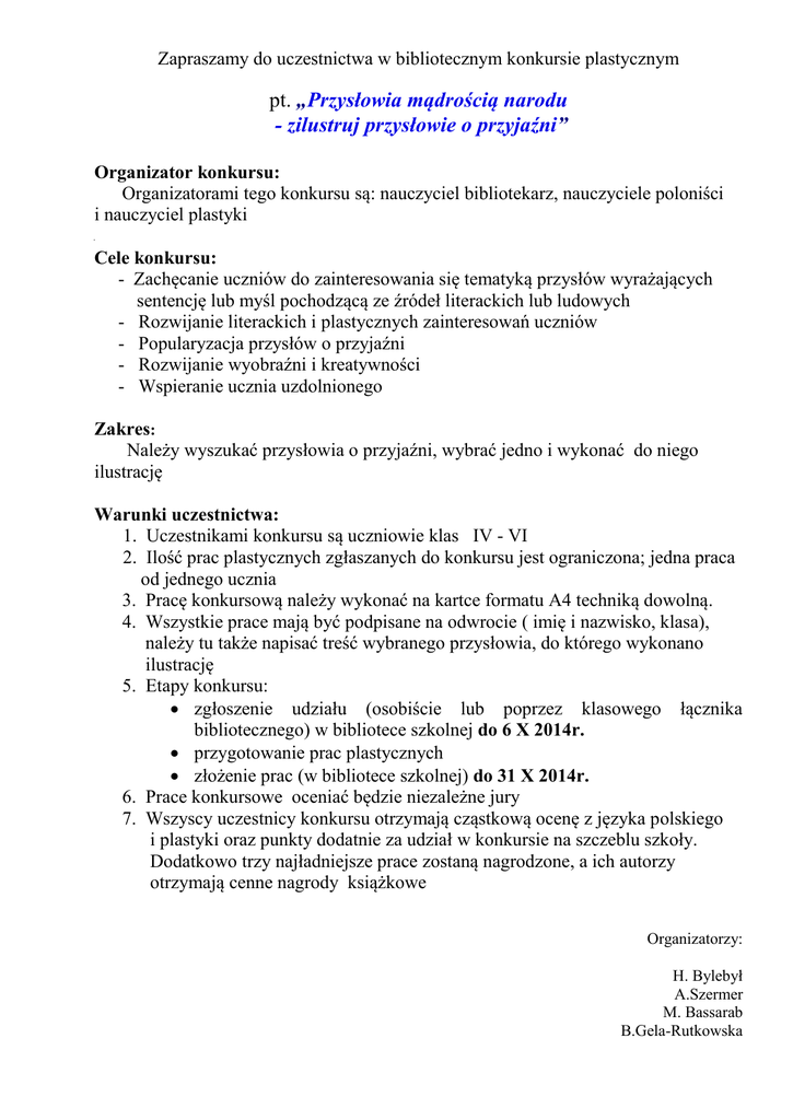 Zapraszamy do uczestnictwa w bibliotecznym konkursie plastycznym pt. „Przysłowia mądrością narodu - zilustruj przysłowie o przyjaźni” Organizator konkursu: Organizatorami tego konkursu są: nauczyciel bibliotekarz, nauczyciele poloniści i nauczyciel plastyki Cele konkursu: - Zachęcanie uczniów do zainteresowania się tematyką przysłów wyrażających sentencję lub myśl pochodzącą ze źródeł literackich lub ludowych - Rozwijanie literackich i plastycznych zainteresowań uczniów - Popularyzacja przysłów o przyjaźni - Rozwijanie wyobraźni i kreatywności - Wspieranie ucznia uzdolnionego Zakres: Należy wyszukać przysłowia o przyjaźni, wybrać jedno i wykonać do niego ilustrację Warunki uczestnictwa: 1. Uczestnikami konkursu są uczniowie klas IV - VI 2. Ilość prac plastycznych zgłaszanych do konkursu jest ograniczona; jedna praca od jednego ucznia 3. Pracę konkursową należy wykonać na kartce formatu A4 techniką dowolną. 4. Wszystkie prace mają być podpisane na odwrocie ( imię i nazwisko, klasa), należy tu także napisać treść wybranego przysłowia, do którego wykonano ilustrację 5. Etapy konkursu: zgłoszenie udziału (osobiście lub poprzez klasowego łącznika bibliotecznego) w bibliotece szkolnej do 6 X 2014r. przygotowanie prac plastycznych złożenie prac (w bibliotece szkolnej) do 31 X 2014r. 6. Prace konkursowe oceniać będzie niezależne jury 7. Wszyscy uczestnicy konkursu otrzymają cząstkową ocenę z języka polskiego i plastyki oraz punkty dodatnie za udział w konkursie na szczeblu szkoły. Dodatkowo trzy najładniejsze prace zostaną nagrodzone, a ich autorzy otrzymają cenne nagrody książkowe Organizatorzy: H. Bylebył A.Szermer M. Bassarab B.Gela-Rutkowska