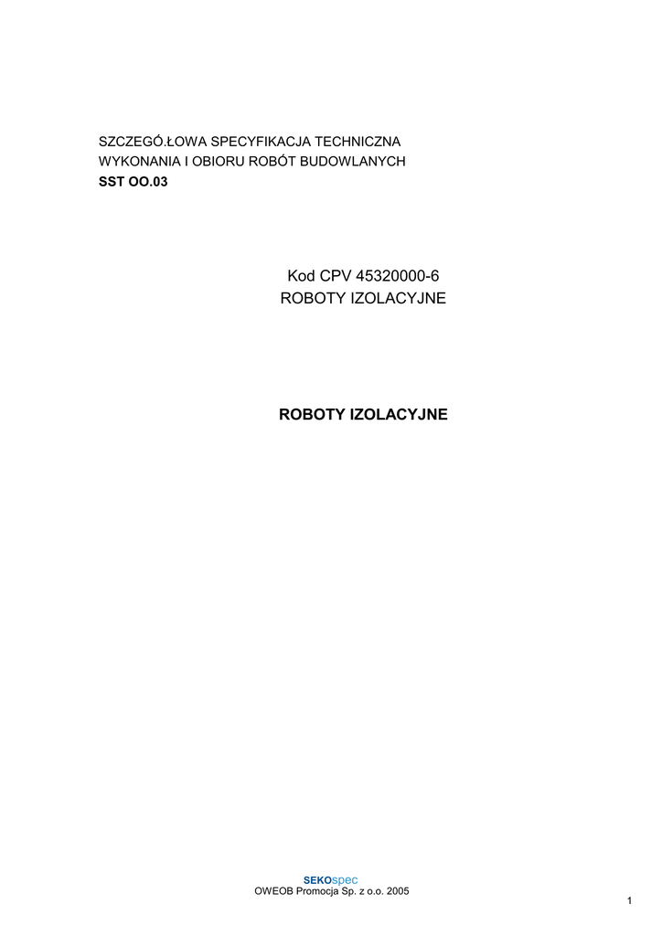 SZCZEGÓ.ŁOWA SPECYFIKACJA TECHNICZNA WYKONANIA I OBIORU ROBÓT BUDOWLANYCH SST OO.03 Kod CPV 45320000-6 ROBOTY IZOLACYJNE ROBOTY IZOLACYJNE SEKOspec OWEOB Promocja Sp. z o.o. 2005 1 SPIS TREŚCI 1. WSTĘP ............................................................................................... 3 1.1. Przedmiot ST ................................................................................... 3 1.2. Zakres stosowania ST ...................................................................... 3 1.3. Zakres robót objętych ST ................................................................. 3 1.4. Podstawowe określenia .................................................................... 3 1.5. Ogólne wymagania dotyczące robót ................................................. 3 2. MATERIAŁY ......................................................................................... 4 3. SPRZĘT ............................................................................................. 6 4. TRANSPORT ...................................................................................... 7 5. WYKONANIE ROBÓT ....................................................................... 7 6. KONTROLA JAKOŚCI ROBÓT .......................................................... 7 7. OBMIAR ROBÓT ................................................................................ 7 8. ODBIÓR ROBÓT ................................................................................. 7 9. PODSTAWA PŁATNOŚCI .................................................................. 7 10. PRZEPISY ZWIĄZANE ..................................................................... 7 NajwaŜniejsze oznaczenia i skróty: ST – Specyfikacja Techniczna SST – Szczegółowa Specyfikacja Techniczna ITB – Instytut Techniki Budowlanej SEKOspec OWEOB Promocja Sp. z o.o. 2005 2 CZĘŚĆ OGÓLNA 1.1. Przedmiot SST i nazwa zamówienia . 1. Przedmiotem niniejszej szczegółowej specyfikacji technicznej (SST) są wymagania dotyczące wykonania i odbioru robót realizowanych wg. projektu nr: 11 A / 09 PRZEBUDOWA I ROZBUDOWA BUDYNKU w Niezdarze ul.plac Floriana 10. 1.2. Zakres stosowania SST Specyfikacja techniczna (ST) łącznie z szczegółowymi specyfikacjami technicznymi (SST) stosowana jest jako dokument przetargowy i kontraktowy przy zlecaniu i realizacji robót wymienionych w pkt. 1.1 1.4. Określenia podstawowe Określenia podane w niniejszej SST są zgodne z obowiązującymi odpowiednimi normami oraz określeniami podanymi w ST Kod CPV 45000000-7 „Wymagania ogólne” PodłoŜe – powierzchnia nowej lub istniejącej ściany lub stropu. MoŜe być w stanie surowym, pokryta tynkiem mineralnym, organicznym i powłokami farb. Środek gruntujący – materiał nanoszony na podłoŜe lub › warstwę zbrojoną, celem regulacji (wyrównania, redukcji) nasiąkliwości lub zwiększenia przyczepności. Izolacja cieplna lub akustyczna– materiał o niskiej wartości współczynnika przewodzenia ciepła lub dŜwięku , jako składnik BSO mocowany w formie płyt na ścianach (przegrodach) zewnętrznych lub wewnetrznych i nadający im wymagane parametry termoizolacyjne i dŜwiękochłonne. Zaprawa (masa) klejąca – materiał systemu do przyklejania materiału izolacyjnego do podłoŜa. Łączniki mechaniczne – określone łączniki do mocowania systemów izolacji cieplnej do podłoŜa, na przykład kołki rozporowe i profile. Warstwa zbrojona – określona warstwa systemu stosowana bezpośrednio na powierzchni materiału do izolacji cieplnej. Zawiera zbrojenie. Warstwa zbrojona ma największy wpływ na właściwości mechaniczne systemu. Siatki z włókna szklanego – określone tkaniny systemu składające się z przędzy z ciągłych włókien szklanych w obu kierunkach wątku i osnowy, z wykończeniem odpornym na działanie alkaliów. Zbrojenie – określone materiały systemu osadzane w warstwie zbrojonej w celu zwiększenia jej wytrzymałości mechanicznej. Zbrojeniem są zazwyczaj siatki z włókien szklanych lub siatki metalowe. Warstwa wykończeniowa – określony materiał mineralny, organiczny i/lub nieorganiczny systemu, tworzący jego wierzchnią warstwę. Warstwa wykończeniowa w połączeniu z warstwą zbrojoną stanowi zabezpieczenie przed oddziaływaniem warunków ; nadaje równieŜ systemowi fakturę i barwę. 1.5. Ogólne wymagania dotyczące robót Wykonawca robót jest odpowiedzialny za jakość ich wykonania oraz za zgodność SEKOspec OWEOB Promocja Sp. z o.o. 2005 3 z dokumentacją projektową, ST SST i poleceniami Inspektora nadzoru. Ogólne wymagania dotyczące robót podano w ST Kod CPV 45000000-7 „Wymagania ogólne” 2. MATERIAŁY 2.1. Ogólne wymagania dotyczące materiałów, ich pozyskiwania i składowania podano w ST Kod CPV 45000000-7 „Wymagania ogólne” Ponadto materiały stosowane do wykonywania pokryć dachowych powinny mieć: – Aprobaty Techniczne lub być produkowane zgodnie z obowiązującymi normami, – Certyfikat lub Deklarację Zgodności z Aprobatą Techniczną lub z PN, – Certyfikat na znak bezpieczeństwa, – Certyfikat zgodności ze zharmonizowaną normą europejską wprowadzoną do zbioru norm polskich, – na opakowaniach powinien znajdować się termin przydatności do stosowania. Sposób transportu i składowania powinien być zgodny z warunkami i wymaganiami podanymi przez producenta.Wykonawca obowiązany jest posiadać na budowie pełną dokumentację dotyczącą składowanych na budowie materiałów przeznaczonych do wykonania izolacyjnych. Wszystkie dokumenty wymagane Prawem Budowlanym j.w muszą być dostarczone na budowę w chwili dostawy materiału i przekazane inspektorowi nadzoru. 2.2. Rodzaje materiałów. Do izolacji przeciwwilgociowych: Wszelkie materiały do wykonania pokryć IZOLACYJNYCH powinny odpowiadać wymaganiom zawartym w normach polskich lub aprobatach technicznych ITB dopuszczających dany materiał do powszechnego stosowania w budo