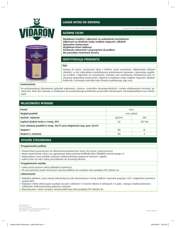 LAKIER NITRO DO DREWNA Karta techniczna. Data publikacji 10.05.2010 r. GŁÓWNE CECHY Wyjątkowa trwałość i odporność na uszkodzenia mechaniczne Odporność na działanie wody, środków myjących i alkoholi Optymalna elastyczność Wyjątkowo łatwa aplikacja Doskonała rozlewność i przyczepność do podłoża Nie powoduje ciemnienia drewna IDENTYFIKACJA PRODUKTU Opis Gotowy do użycia, nowoczesny lakier o krótkim czasie wysychania. Odpowiednio dobrane składniki, w tym nitroceluloza modyfikowana poliestrowymi spoiwami, zapewniają wyjątkową trwałość i odporność na zarysowania, ścieranie oraz uszkodzenia mechaniczne przy zachowaniu optymalnej elastyczności. Odporny na działanie wody, środków myjących i alkoholi. Podkreśla i zachowuje naturalny kolor drewna wydobywając jego urok. Zastosowanie Do profesjonalnego lakierowania galanterii wykonanej z drewna, materiałów drewnopochodnych i metalu użytkowanych wewnątrz pomieszczeń. Może być używany w instalacjach do przemysłowego powlekania powierzchni drewnianych, drewnopochodnych oraz metalowych. WŁAŚCIWOŚCI WYROBU ciecz Postać mat, połysk Wygląd powłoki [g/cm3] 1,00 [s] 120-160 Stopień 1 [h] 25 Stopień 3, najwyżej [h] 4 Gęstość, najwyżej Lepkość (kubek Forda ø 4 mm), 20ºC Czas schnięcia powłoki w temp. 20±2°C przy wilgotności wzg. pow. 55±5% SPOSÓB STOSOWANIA Przygotowanie podłoża – Powierzchnie przeznaczone do lakierowania powinny być suche, bez kurzu i zanieczyszczeń. – Nowe powierzchnie zaleca się zagruntować jedną warstwą Podkładu Nitro VIDARON rozcieńczonego 1:1. – Dobrej jakości stare powłoki zmatowić drobnoziarnistym papierem ściernym i odpylić. – Lakiery inne niż nitro należy przeszlifować do surowego drewna. Przygotowanie wyrobu – Lakier przed użyciem należy dokładnie wymieszać. – W razie potrzeby wyrób rozcieńczyć rozcieńczalnikiem do wyrobów nitro produkcji FFiL Śnieżka SA. Lakierowanie – Nakładać pędzlem, przez natrysk pneumatyczny lub zanurzeniowo w temp. podłoża i otoczenia powyżej +12ºC i wilgotności powietrza poniżej 80%. – Najlepsze efekty dekoracyjne uzyskuje się przez nałożenie 2-3 warstw lakieru w odstępach 3-6 godz., stosując międzywarstwowe szlifowanie drobnoziarnistym papierem ściernym. – Rozcieńczanie i mycie narzędzi: rozcieńczalnik typu nitro produkcji FFiL Śnieżka SA. FFiL Śnieżka SA 39-102 Lubzina 34a Dział Handlowy: 39-207 Brzeźnica, Brzeźnica 18 tel. 14 681 11 11, fax 14 682 22 22 Vidaron Karta Techniczna - Lakier Nitro.indd 2 www.vidaron.pl 2010-09-27 13:31:30 PARAMETRY LAKIEROWANIA DLA POSZCZEGÓLNYCH METOD Parametry lakierowania Metody aplikacji Lepkość Dodatek rozcieńczalnika Średnica dyszy pistoletu Ciśnienie natrysku [s] [%] [mm] [MPa] Pędzel, wałek postać handlowa 5 - - 2-3 Natrysk pneumatyczny 20-25 do 20 1,2-1,5 0,35-0,4 2-3 Zalecana ilość warstw KOLORYSTYKA Bezbarwny. OPAKOWANIA Puszki metalowe: 200 ml, 1 L, 10 L. ZUŻYCIE I WYDAJNOŚĆ Do 11 m2/L przy jednokrotnym malowaniu. OKRES PRZYDATNOŚCI DO UŻYCIA 18 miesięcy od daty produkcji. PRZECHOWYWANIE I TRANSPORT Temperatura przechowywania: od +5ºC do +25ºC w szczelnie zamkniętych opakowaniach. ZDROWIE I BEZPIECZEŃSTWO Produkt wysoce łatwo palny. Produkt szkodliwy; zawiera ksylen, toluen, octan etylu. Działa szkodliwie przez drogi oddechowe i w kontakcie ze skórą. Działa drażniąco na oczy i skórę. Chronić przed dziećmi. Nie przechowywać w pobliżu źródeł zapłonu – nie palić tytoniu. Zanieczyszczone oczy przemyć natychmiast dużą ilością wody i zasięgnąć porady lekarza. Nie wprowadzać do kanalizacji. W razie połknięcia niezwłocznie zasięgnij porady lekarza, pokaż opakowanie lub etykietę. Stosować wyłącznie w dobrze wentylowanych pomieszczeniach. Stosować się do zaleceń podanych na opakowaniu. Szczegółowe informacje zawarte są w karcie charakterystyki preparatu. ATESTY I NORMY PN-C 81801:1997. FFiL Śnieżka SA jest gwarantem właściwej jakości produktu, pozostaje jednak bez wpływu na sposób i warunki jego stosowania. Informacje zawarte w karcie mają na celu zapewnienie optymalnego wykorzystania produktu, jednak nie są podstawą do odpowiedzialności prawnej producenta, gdyż warunki wykonawstwa pozostają poza jego kontrolą. Wszelka ingerencja w skład produktu jest niedopuszczalna i może w znaczny sposób obniżyć jakość produktu. W przypadku połączenia z wyrobami innych firm Producent nie ponosi żadnej odpowiedzialności za powstałe wady i szkody. Przedstawione powyżej informacje podane zostały w dobrej wierze, wg aktualnego stanu wiedzy i doświadczenia praktycznego. FFiL Śnieżka SA zastrzega sobie prawo do zmiany treści w kolejnych edycjach karty technicznej bez wcześniejszego informowania o tym fakcie odbiorców. Producent zastrzega sobie również pełne prawo do modyfikacji swoich produktów w ramach ich rozwoju technologicznego. FFiL Śnieżka SA 39-102 Lubzina 34a Dział Handlowy: 39-207 Brzeźnica, Brzeźnica 18 tel. 14 681 11 11, fax 14 682 22 22 Vidaron Karta Techniczna - Lakier Nitro.indd 3 www.vidaron.pl 2010-09-27 13:31:30