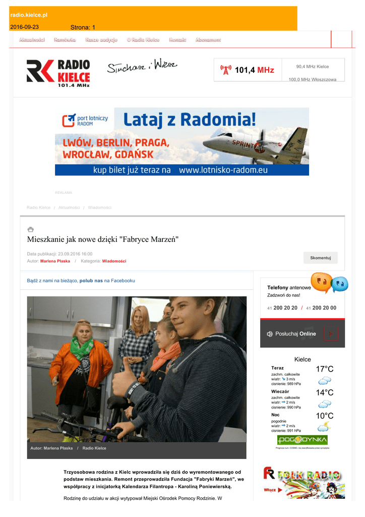 radio.kielce.pl 2016-09-23 Aktualności Strona: 1 Ramówka Nasze audycje O Radiu Kielce Kontakt Abonament 90,4 MHz Kielce 101,4 MHz 100,0 MHz Włoszczowa REKLAMA Radio Kielce / Aktualności / Wiadomości Mieszkanie jak nowe dzięki "Fabryce Marzeń" Data publikacji: 23.09.2016 16:00 Skomentuj Autor: Marlena Płaska / Kategoria: Wiadomości Bądź z nami na bieżąco, polub nas na Facebooku Telefony antenowe Zadzwoń do nas! 41 200 20 20 / 200 20 00 41 Posłuchaj Online Kielce Teraz zachm. całkowite wiatr: 3 m/s cisnienie: 989 hPa Wieczór zachm. całkowite wiatr: 2 m/s cisnienie: 990 hPa Noc pogodnie wiatr: 2 m/s cisnienie: 991 hPa Autor: Marlena Płaska / Radio Kielce Trzyosobowa rodzina z Kielc wprowadziła się dziś do wyremontowanego od podstaw mieszkania. Remont przeprowadziła Fundacja "Fabryki Marzeń", we współpracy z inicjatorką Kalendarza Filantropa - Karoliną Poniewierską. Rodzinę do udziału w akcji wytypował Miejski Ośrodek Pomocy Rodzinie. W 17°C 14°C 10°C Prognoza num. COSMO, nie zweryfikowana przez synoptyka radio.kielce.pl 2016-09-23 Strona: 2 mieszkaniu o powierzchni 24 metrów kwadratowych wymieniono podłogi, część instalacji i wszystkie meble. W prace zaangażowali się wolontariusze. Pomoc zaoferowała też jedna z sąsiadek i rodzice szkolnych koleżanek i kolegów dzieci. Po wejściu do mieszkania, 15-letni Wiktor i 13-letnia Oliwia byli pod dużym wrażeniem zmian. Wiktor podkreślał, że wszystko diametralnie się zmieniło na piękne i nowe. Dodał, że teraz oboje z siostrą mają dużo lepsze warunki do nauki i ma nadzieję, że to przełoży się na jego oceny. Prezes Fundacji "Fabryki Marzeń" Andrzej Załucki przyznaje, że niewielkie mieszkanie wymagało generalnego remontu i przemodelowania ciasnej przestrzeni przez architekta. Zaaranżowano osobną przestrzeń mieszkalną dla mamy i dzieci. Oliwia i Wiktor mają swoje biurka i łóżka. W mieszkaniu wymieniono wszystkie meble. Fundacja kupiła też np. pościel, naczynia i zasłony. Prace kosztowały ponad 25 tysięcy złotych. Pieniądze pochodziły z aukcji Kalendarza Filantropa, podczas której wylicytowano 12 grafik autorstwa Marka Wawro. REKLAMA Pani Iwona Blicharska dziękowała wszystkim, którzy zaangażowali się w remont jej mieszkania i ze wzruszeniem podkreślała, że wstydzi się tego, że nie była w stanie zrobić tego samodzielnie. Dodaje, że jej córka choruje, a ona sama, po wypadku ma orzeczenie o niepełnosprawności, ale mimo to pracuje na pół etatu jako sprzątaczka. Marzy o tym, by otrzymać stałą umowę. Fundacja "Fabryki Marzeń” wyremontowała dotąd mieszkania 40 rodzinom z 6 województw. Po raz pierwszy pomocą objęta została rodzina z Kielc. W województwie świętokrzyskim pomoc fundacji otrzymały dotąd rodziny z Suchedniowa i Rudek k. Projekt praca Szydłowa. Tutaj praca czeka na Ciebie. Sprawdź najnowsze oferty pracy Czytaj więcej Galeria Tagi do tego wpisu Fundacja "Fabryka Marzeń" Skomentuj ten wpis Zobacz wszystkie galerie Radio Kielce 101,4 MHz Wersja mobilna RSS – wiadomości ogólne FM 90,4 MHz | DAB+ kanał 5D RSS - wiadomości sportowe radio.kielce.pl 2016-09-23 Strona: 3 ul. Radiowa 4, 25-317 Kielce tel. 41 368 12 00 fax 41 344 65 44 [email protected] Wszelkie prawa zastrzeżone. Polskie Radio Kielce SA 1952 - 2013 / Realizacja: ZetoKielce