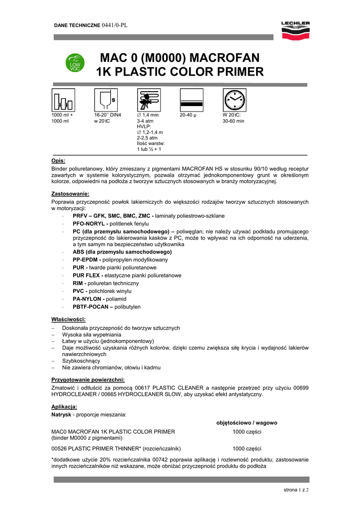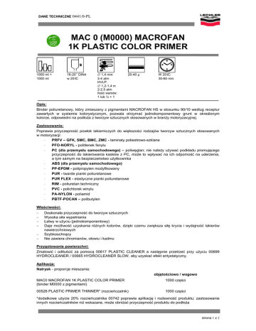 DANE TECHNICZNE 0441/0-PL MAC 0 (M0000) MACROFAN 1K PLASTIC COLOR PRIMER 1000 ml + 1000 ml 16-20’’ DIN4 w 20°C ∅ 1,4 mm 3-4 atm HVLP: ∅ 1,2-1,4 m 2-2,5 atm Ilość warstw: 1 lub ½ + 1 20-40 µ W 20°C: 30-60 min Opis: Binder poliuretanowy, który zmieszany z pigmentami MACROFAN HS w stosunku 90/10 według receptur zawartych w systemie kolorystycznym, pozwala otrzymać jednokomponentowy grunt w określonym kolorze, odpowiedni na podłoża z tworzyw sztucznych stosowanych w branży motoryzacyjnej. Zastosowanie: Poprawia przyczepność powłok lakierniczych do większości rodzajów tworzyw sztucznych stosowanych w motoryzacji: ⋅ PRFV – GFK, SMC, BMC, ZMC - laminaty poliestrowo-szklane ⋅ PFO-NORYL - politlenek fenylu ⋅ PC (dla przemysłu samochodowego) – poliwęglan; nie należy używać podkładu promującego przyczepność do lakierowania kasków z PC, może to wpływać na ich odporność na uderzenia, a tym samym na bezpieczeństwo użytkownika ⋅ ABS (dla przemysłu samochodowego) ⋅ PP-EPDM - polipropylen modyfikowany ⋅ PUR - twarde pianki poliuretanowe ⋅ PUR FLEX - elastyczne pianki poliuretanowe ⋅ RIM - poliuretan techniczny ⋅ PVC - polichlorek winylu ⋅ PA-NYLON - poliamid ⋅ PBTF-POCAN – polibutylen Właściwości: − − − − − − Doskonała przyczepność do tworzyw sztucznych Wysoka siła wypełniania Łatwy w użyciu (jednokomponentowy) Daje możliwość uzyskania różnych kolorów, dzięki czemu zwiększa siłę krycia i wydajność lakierów nawierzchniowych Szybkoschnący Nie zawiera chromianów, ołowiu i kadmu Przygotowanie powierzchni: Zmatowić i odtłuścić za pomocą 00617 PLASTIC CLEANER a następnie przetrzeć przy użyciu 00699 HYDROCLEANER / 00665 HYDROCLEANER SLOW, aby uzyskać efekt antystatyczny. Aplikacja: Natrysk - proporcje mieszania: objętościowo / wagowo MAC0 MACROFAN 1K PLASTIC COLOR PRIMER (binder M0000 z pigmentami) 1000 części 00526 PLASTIC PRIMER THINNER* (rozcieńczalnik) 1000 części *dodatkowe użycie 20% rozcieńczalnika 00742 poprawia aplikację i rozlewność produktu; zastosowanie innych rozcieńczalników niż wskazane, może obniżać przyczepność produktu do podłoża strona 1 z 2 DANE TECHNICZNE 0441/0-PL Lepkość do natrysku w 20°C: 16-20’’ DIN 4 ∅ dyszy: 1,4 mm; HVLP 1,2-1,4 mm Ciśnienie powietrza: 3-4 atm, HVLP 2-2,5 atm Ilość warstw: 1 lub ½ + 1 Zalecana grubość pokrycia: 20-40 µ Wydajność teoretyczna: 1l mieszanki = 5,3 m2 przy 30 µ 1kg mieszanki = 4,2 m2 przy 30 µ VOC produktu gotowego do użycia (przy lepkości 20’’ DIN 4): 707 g/l Produkt poza dyrektywą 2004/42/CE Czas schnięcia: Schnięcie w 20°C: 30-60 min Zalecane warstwy wierzchnie: − − − Dwuskładnikowe podkłady wypełniające Lechler Lakiery nawierzchniowe MACROFAN HS Lakiery bazowe HYDROFAN lub BSB + lakiery bezbarwne MACROFAN UHS Nie zaleca się bezpośredniego pokrywania lakierem nawierzchniowym MACROFAN MAC5. W przypadku elastycznych tworzyw sztucznych do podkładu, lakieru nawierzchniowego i lakieru bezbarwnego (z wyłączeniem lakierów bazowych BSB i HYDROFAN) należy dodać 20% plastyfikatora 09760 FLESSIBILIZZANTE. Uwagi: Receptury dla kolorów, jakie można uzyskać w MAC0, są dostępne pod pozycją SOTTOTINTE (dla podkładów sugerowanych pod lakiery bazowe) i pod pozycją Car Manufacturers (dla oryginalnych odcieni stosowanych przez producentów pojazdów). Produkt można również stosować jako bezbarwny grunt (sam binder). W przypadku ciemnych kolorów, produkt można nakładać na zderzaki bez pokrywania, zachowując dobrą odporność na warunki atmosferyczne i promienie UV. Stabilność magazynowa: 12 miesięcy od daty produkcji. Dane techniczne 0441/0-PL 09/2012 PRODUKT PRZEZNACZONY JEST DO ZASTOSOWAŃ PROFESJONALNYCH PRZEZ WYKWALIFIKOWANY PERSONEL. Powyższe dane sporządzono po uprzednim sprawdzeniu, mimo to nie odpowiadamy za ewentualne pomyłki i niedokładności. strona 2 z 2