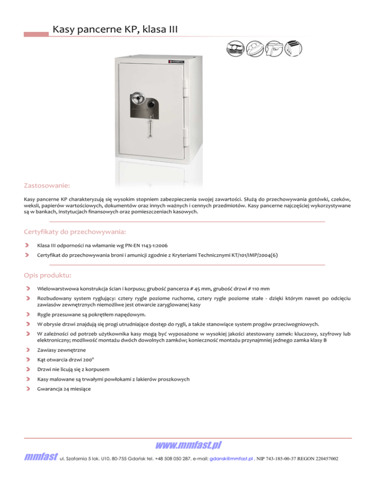Kasy pancerne KP, klasa III Zastosowanie: Kasy pancerne KP charakteryzują się wysokim stopniem zabezpieczenia swojej zawartości. Służą do przechowywania gotówki, czeków, weksli, papierów wartościowych, dokumentów oraz innych ważnych i cennych przedmiotów. Kasy pancerne najczęściej wykorzystywane są w bankach, instytucjach finansowych oraz pomieszczeniach kasowych. Certyfikaty do przechowywania: Klasa III odporności na włamanie wg PN-EN 1143-1:2006 Certyfikat do przechowywania broni i amunicji zgodnie z Kryteriami Technicznymi KT/101/IMP/2004(6) Opis produktu: Wielowarstwowa konstrukcja ścian i korpusu; grubość pancerza # 45 mm, grubość drzwi # 110 mm Rozbudowany system ryglujący: cztery rygle poziome ruchome, cztery rygle poziome stałe - dzięki którym nawet po odcięciu zawiasów zewnętrznych niemożliwe jest otwarcie zaryglowanej kasy Rygle przesuwane są pokrętłem napędowym. W obrysie drzwi znajdują się progi utrudniające dostęp do rygli, a także stanowiące system progów przeciwogniowych. W zależności od potrzeb użytkownika kasy mogą być wyposażone w wysokiej jakości atestowany zamek: kluczowy, szyfrowy lub elektroniczny; możliwość montażu dwóch dowolnych zamków; konieczność montażu przynajmniej jednego zamka klasy B Zawiasy zewnętrzne Kąt otwarcia drzwi 200o Drzwi nie licują się z korpusem Kasy malowane są trwałymi powłokami z lakierów proszkowych Gwarancja 24 miesiące www.mmfast.pl mmfast ul. Szafarnia 5 lok. U10, 80-755 Gdańsk tel. +48 508 050 287, e-mail: [email protected] , NIP 743-185-00-37 REGON 220457002 Kasy pancerne KP, klasa III Wyposażenie podstawowe*: Zamek kluczowy kl. B z dwoma kluczami Zamek szyfrowy (mechaniczny bądź elektroniczny) Kluczyk do zmiany szyfru zamontowanych zamków szyfrowych mechanicznych Półki z płynną regulacją wysokości zawieszenia; maksymalne obciążenie półek 50 kg Zaczepy do półek Kotwa rozporowa do mocowania do podłoża M16 x 250 Otwór montażowy w dnie kasy ø 28 mm Instrukcja obsługi zamontowanych zamków szyfrowych (mechanicznych, elektronicznych) Instrukcja obsługi i użytkowania wyrobu z kartą gwarancyjną *Zależnie od wymagań Klienta Wyposażenie dodatkowe: Wyprowadzenie instalacji alarmowej – podłączenie do systemu alarmowego obiektu Skrytki indywidualnie zamykane – dodatkowe zabezpieczenie Depozyty Kartoteki Szuflady Dodatkowe półki Czujki wstrząsowe – przekazują impuls do systemu alarmowego przy próbie włamania Czujnik położenia rygli - przekazuje impuls do systemu alarmowego o stanie otwarcia drzwi Kompakt wrzutowy – certyfikowany zestaw kasy z wrzutnią Rodzaje zamków: kluczowy szyfrowy elektroniczny Standardowe kolory: Jasnoszary RAL 7035 (domyślny przy zamówieniu, jeśli nie zaznaczono koloru) Jasnoszary RAL 9002 (należy zaznaczyć w zamówieniu, bezpłatny) Czarny RAL 9005 (należy zaznaczyć w zamówieniu, bezpłatny) *Na indywidualne zamówienie wszystkie kolory z palety RAL (lakier proszkowy) www.mmfast.pl mmfast ul. Szafarnia 5 lok. U10, 80-755 Gdańsk tel. +48 508 050 287, e-mail: [email protected] , NIP 743-185-00-37 REGON 220457002 Kasy pancerne KP, klasa III Dane techniczne: Wymiary zewnętrzne [mm] Wymiary wewnętrzne [mm] W S G W S G Waga [kg] KP 67/III 670 610 615 578 510 459 380 KP 100/III 1000 610 615 908 510 459 515 99 KP 120/III 1200 610 615 1108 510 459 620 123 KP 150/III 1500 610 615 1410 510 459 722 181 KP 180/III 1800 610 615 1710 510 459 868 206 Model Model Pojemność [l] 59 Pokrętło klamki Półki [szt.] Skrytka* W Ø KP 67 1 TAK 32 80 KP 100 2 TAK 40 125 KP 120 3 TAK 40 125 KP 150, KP 180 4 TAK 40 125 *Możliwość zastosowania jako wyposażenia dodatkowego Wymiary zewnętrzne [mm] Skrytka* Światło drzwi [mm] W S G W S 278 480 446 180 355 *Skrytka indywidualnie zamykana na zamek kluczowy bębenkowy (oznaczenie - T np. KP 67T) Model Promień otwarcia drzwi R [mm] Prześwit drzwi [mm] W S KP 67/III 560 578 510 KP 100/III 560 908 510 KP 120/III 560 1108 510 KP 150/III 560 1410 510 KP 180/III 560 1710 510 www.mmfast.pl mmfast ul. Szafarnia 5 lok. U10, 80-755 Gdańsk tel. +48 508 050 287, e-mail: [email protected] , NIP 743-185-00-37 REGON 220457002 Kasy pancerne KP, klasa III Montaż do podłoża: Kasy montowane są do podłoża jednym stalowym łącznikiem rozporowym (Rys.1). Rys. 1 UWAGA: Stalowy łącznik rozporowy powinien być osadzony w podłożu na głębokość nie mniejszą niż 130mm, w betonie min. B15 www.mmfast.pl mmfast ul. Szafarnia 5 lok. U10, 80-755 Gdańsk tel. +48 508 050 287, e-mail: [email protected] , NIP 743-185-00-37 REGON 220457002 Kasy pancerne KP, klasa III Aby zamontować kasę do podłoża należy: 1. 2. 3. 4. 5. Ustawić kasę w miejscu przeznaczenia. Zdjąć zaślepkę z otworu w dnie wyrobu. Nawiercić otwór w podłożu przez otwór w wyrobie na głębokość odpowiadającą długości łącznika rozporowego. Ustawić kasę tak, aby otwór w dnie kasy i otwór w podłożu nachodziły na siebie. Włożyć kotwę i dokręcić nakrętkę. W przypadku, gdy śruba łącznika rozporowego po dokręceniu nakrętki wystaje powyżej dna wewnątrz kasy, należy poluzować nakrętkę, a następnie wkrętakiem wkręcić śrubę i dokręcić nakrętkę. 6. Przykryć otwór zaślepką. W przypadku, gdy kasa jest za mała aby nawiercić otwory przez otwory w kasie (wiertarka nie mieści się do środka kasy np. ze względu na wbudowane skarbczyki) należy: 1. 2. 3. 4. 5. Zmierzyć rozstaw otworu w kasie. Natrasować usytuowanie otworu na podłożu. Nawiercić otwór w podłożu na głębokość odpowiadającą długości łącznika rozporowego. Ustawić kasę tak, aby otwór w dnie kasy i otwór w podłożu nachodziły na siebie. Włożyć kotwę i dokręcić nakrętkę. W przypadku, gdy śruba łącznika rozporowego po dokręceniu nakrętki wystaje powyżej dna wewnątrz kasy, należy poluzować nakrętkę, a następnie wkrętakiem wkręcić śrubę i dokręcić nakrętkę. 6. Przykryć ot