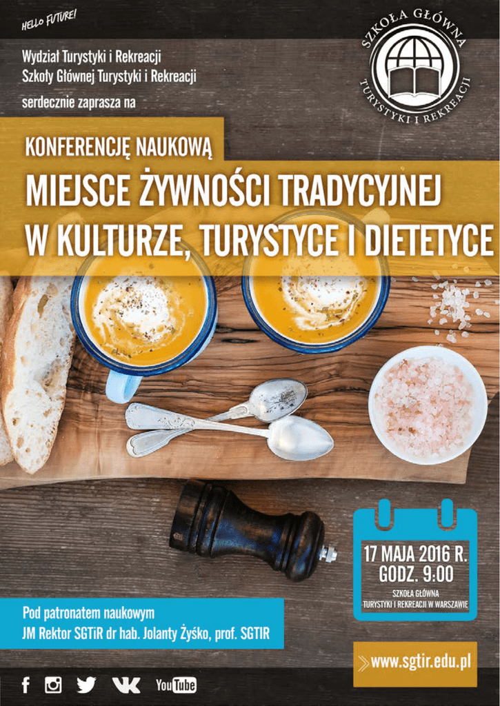 CEL KONFERENCJI Celem konferencji jest przedstawienie i dyskusja dotycząca znaczenia żywności tradycyjnej w kulturze, turystyce, dietetyce. Konferencja ma być okazją do wymiany poglądów, doświadczeń i wyników badań dotyczących wyzwań i perspektyw, jakie stwarza żywność tradycyjna dla kultury, turystyki i dietetyki oraz zachęceniem do twórczej dyskusji i wdrażania nowych badań dotyczących kreatywnego i aktywnego kształtowania roli żywności tradycyjnej. ZAPRASZAMY 1. Kadrę naukową uczelni warszawskich i innych ośrodków akademickich 2. Przedstawicieli organizacji turystycznych 3.Dietetyków 4. Właścicieli gospodarstw agroturystycznych 5.Restauratorów 6. Przedstawicieli biur podróży 7. Przedstawicieli organizacji konsumenckich 8. Pracowników Polskiej Organizacji Turystycznej 9. Pracowników Regionalnych Organizacji Turystycznych 10. Przedstawicieli organizacji samorządu gospodarczego 11. Studentów wyższych uczelni GOŚĆ SPECJALNY Gościem specjalnym będzie Beata Pawlikowska, która zechce sie z nami podzielić swoim doświadczeniem i obserwacjami na temat żywności tradycyjnej. MIEJSCE ŻYWNOŚCI TRADYCYJNEJ W KULTURZE, TURYSTYCE I DIETETYCE WYBRANE OBSZARY TEMATYCZNE Obszar I. Żywność w kulturze i tradycji • Współczesne określenie żywności tradycyjnej • Kulturowe uwarunkowania produktów kulinarnych • Obrzędowość tradycyjna związana z żywnością • Kulinaria jako dziedzictwo kulturowe • Kuchnie regionalne i kulinarne produkty lokalne Obszar II. Żywność w turystyce • Żywność tradycyjna, jako atrakcja turystyczna • Szlaki kulinarne, elementem uatrakcyjniającym ofertę turystyczną • Żywność tradycyjna w gastronomii • Ginące zawody związane z produkcją żywności • Formy turystyki kulinarnej Obszar III. Prozdrowotne aspekty żywności tradycyjnej • Walory zdrowotne żywności tradycyjnej • Charakterystyka żywności nieprzetworzonej i przemysłowej • Profilaktyka zdrowotna w oparciu o żywność tradycyjną • Tradycyjne modele żywieniowe, jako postępowanie dietetyczne MIEJSCE ŻYWNOŚCI TRADYCYJNEJ W KULTURZE, TURYSTYCE I DIETETYCE PROGRAM KONFERENCJI 9.30 – 10.00 Rejestracja uczestników 10.00 Rozpoczęcie i powitanie gości - prowadznie dr Piotr Dominik Wykład wprowadzający: Współczesne określenie żywności tradycyjnej. prof. dr hab. Irena Ozimek Blok I. Żywność w kulturze - prowadzenie dr Piotr Dominik • Socjopsychologiczne aspekty żywności tradycyjnej i jej spożycia. prof. dr hab. Marzena Jeżewska Zychowicz • Miód – boski pokarm o doniosłych znaczeniach obrzędowych dr hab. Katarzyna Łeńska-Bąk • Historia na talerzu - o przeszłości, teraźniejszości i przyszłości polskiego gotowania, czyli o tym co kształtuje naszą kuchnię. mgr Barbara Adamczewska • Znaczenie pieczywa w codziennym życiu człowieka. prof. dr hab. Alicja Ceglińska • Zapomniany świat dawnego mistycyzmu, czyli o znaczeniu jedzenia w religiach świata. dr hab. Adam Mazur • Żywieniowe tradycje świąteczne – dawniej i współcześnie. mgr inż. Ewa Ołubiec-Opatowska dr hab. Ewa Czarniecka-Skubina • Bogactwo wyrobów kulinarnych z Mazowsza na liście produktu tradycyjnego. mgr Krzysztof Zaniewski • Dyskusja • ok 12.30 Przerwa kawowa MIEJSCE ŻYWNOŚCI TRADYCYJNEJ W KULTURZE, TURYSTYCE I DIETETYCE PROGRAM KONFERENCJI Blok II. Żywność w turystyce - prowadzenie prof.dr hab. Elżbieta Biernacka • Turystyka kulinarna nowe trendy, czy turystyka z tradycjami. mgr Kamila Łuczyńska – Wilczek • Jakość i tradycja na turystycznych szlakach kulinarnych – prezentacja projektu. mgr Izabela Byszewska mgr Jan Zwoliński mgr Jolanta Kamieniecka • Kulinarne wizyty studyjne, jako forma promocji produktu i regionu. mgr Monika Kucia • Turystyka kulinarna - sprawa dla ciała i ducha. Kulinarne sacrum i profanum. mgr Elżbieta Tomczyk-Miczka • Kulinaria - atrakcją turystyczną? Tak, ale .... dr Piotr Geise • Europejskie muzea produktów żywnościowych i ich znaczenie w turystyce kulinarnej. dr Dominik Orłowski • Turystyka kulinarna w Wielkopolsce. Profil mieszkańca Wielkopolski jako turysty kulinarnego – stan obecny i możliwości rozwoju. mgr Paulina Górska • Miejsce żywności tradycyjnej w ofercie turystycznej regionu na przykładzie Podlasia. mgr Piotr Kociszewski • Żywność tradycyjna jako element uatrakcyjniający ofertę hoteli i gospodarstw agroturystycznych. dr Piotr Dominik • Dyskusja • 14.00 – 14.30 Przerwa na lunch MIEJSCE ŻYWNOŚCI TRADYCYJNEJ W KULTURZE, TURYSTYCE I DIETETYCE PROGRAM KONFERENCJI Blok III. Żywność w dietetyce - prowadzenie dr Anna Fabisiak • Obiad przy indiańskim ognisku. Beata Pawlikowska • Wartość odżywcza żywności tradycyjnej. dr hab. inż. Katarzyna Antosik • Żywność tradycyjna versus żywność wytwarzana przy zastosowaniu nowoczesnych technologii. dr hab. Ewa Czarniecka-Skubina mgr inż. Marlena Pielak • Śródziemnomorski model żywienia w profilaktyce przewlekłych chorób niezakaźnych. dr hab. n. o zdr. dr med. Dorota Szostak - Węgierek, WUM • Jakość żywności ekologicznej i jej znaczenie dla zdrowia. prof.dr hab. Ewa Rembiałkowska • Przegląd aktualnych badań dotyczących tradycyjnej żywności funkcjonalnej. prof.dr hab. Józef Grochowicz • Trendy żywieniowe. Lokalne tradycje na arenie globalnej. mgr Baszar El-Helou • Produkty pszczele i ich zastosowanie w medycynie i profilaktyce. dr hab. Beata Madras-Majewska • Dyskusja 17:00 Podsumowanie konferencji i zakończenie MIEJSCE ŻYWNOŚCI TRADYCYJNEJ W KULTURZE, TURYSTYCE I DIETETYCE KOMITET NAUKOWY: • • • • • • • • • • • • • • • • • • • prof. dr hab. Elżbieta Biernacka prof. dr hab. Alicja Ceglińska prof. dr hab. Józef Grochowicz prof.dr hab. Andrzej Kowalczyk prof. dr hab. Janusz Szymborski dr hab. Teresa Skalska, prof. SGTIR dr hab. Krystyna Żelazna, prof. SGTiR dr hab. Ewa Szczepanowska, pro