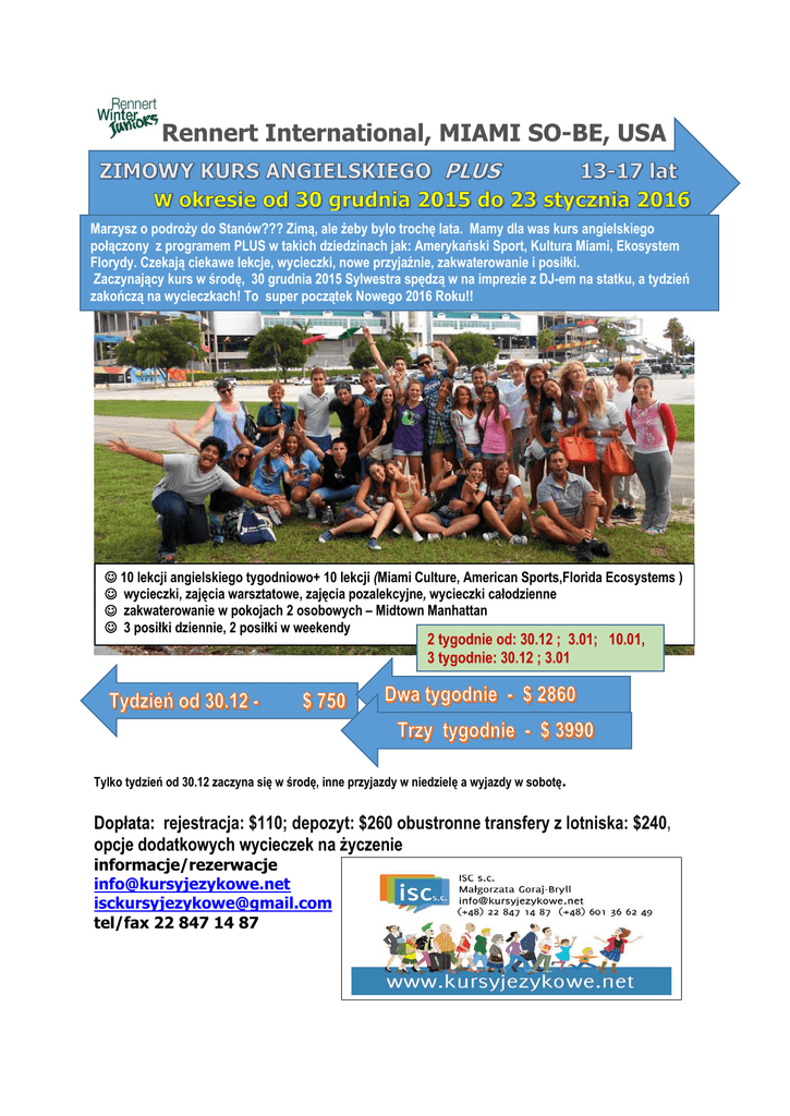 Rennert International, MIAMI SO-BE, USA Marzysz o podroży do Stanów??? Zimą, ale żeby było trochę lata. Mamy dla was kurs angielskiego połączony z programem PLUS w takich dziedzinach jak: Amerykański Sport, Kultura Miami, Ekosystem Florydy. Czekają ciekawe lekcje, wycieczki, nowe przyjaźnie, zakwaterowanie i posiłki. Zaczynający kurs w środę, 30 grudnia 2015 Sylwestra spędzą w na imprezie z DJ-em na statku, a tydzień zakończą na wycieczkach! To super początek Nowego 2016 Roku!! 10 lekcji angielskiego tygodniowo+ 10 lekcji (Miami Culture, American Sports,Florida Ecosystems ) wycieczki, zajęcia warsztatowe, zajęcia pozalekcyjne, wycieczki całodzienne zakwaterowanie w pokojach 2 osobowych – Midtown Manhattan 3 posiłki dziennie, 2 posiłki w weekendy 2 tygodnie od: 30.12 ; 3.01; 10.01, 3 tygodnie: 30.12 ; 3.01 Tylko tydzień od 30.12 zaczyna się w środę, inne przyjazdy w niedzielę a wyjazdy w sobotę. Dopłata: rejestracja: $110; depozyt: $260 obustronne transfery z lotniska: $240, opcje dodatkowych wycieczek na życzenie informacje/rezerwacje [email protected] [email protected] tel/fax 22 847 14 87