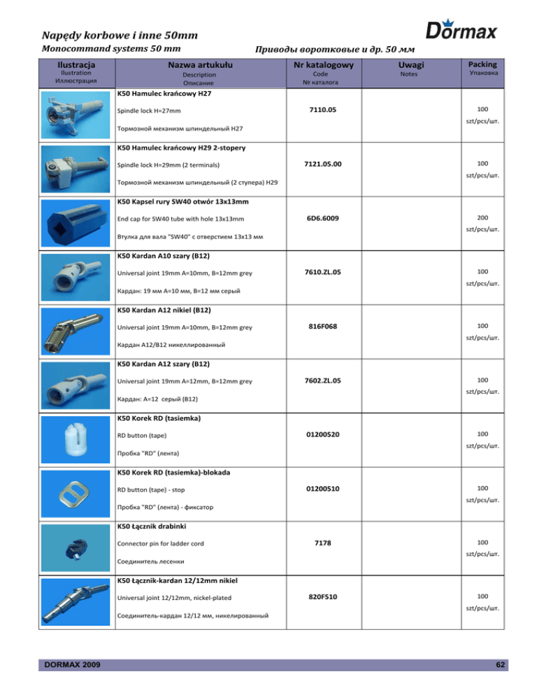 Napędy korbowe i inne 50mm Monocommand systems 50 mm Ilustracja Приводы воротковые и др. 50 мм Nazwa artukułu Ilustration Иллюстрация Description Описание Nr katalogowy Code № каталога Uwagi Notes Packing Упаковка K50 Hamulec krańcowy H27 Spindle lock H=27mm 7110.05 100 szt/pcs/шт. Тормозной механизм шпиндельный H27 K50 Hamulec krańcowy H29 2‐stopery Spindle lock H=29mm (2 terminals) 7121.05.00 100 szt/pcs/шт. Тормозной механизм шпиндельный (2 ступера) H29 K50 Kapsel rury SW40 otwór 13x13mm End cap for SW40 tube with hole 13x13mm 6D6.6009 200 szt/pcs/шт. Втулка для вала "SW40" с отверстием 13х13 мм K50 Kardan A10 szary (B12) Universal joint 19mm A=10mm, B=12mm grey 7610.ZL.05 100 szt/pcs/шт. Кардан: 19 мм А=10 мм, В=12 мм серый K50 Kardan A12 nikiel (B12) Universal joint 19mm A=10mm, B=12mm grey 816F068 100 szt/pcs/шт. Кардан A12/B12 никеллированный K50 Kardan A12 szary (B12) Universal joint 19mm A=12mm, B=12mm grey 7602.ZL.05 100 szt/pcs/шт. Кардан: А=12 серый (B12) K50 Korek RD (tasiemka) RD button (tape) 01200520 100 szt/pcs/шт. Пробка "RD" (лента) K50 Korek RD (tasiemka)‐blokada RD button (tape) ‐ stop 01200510 100 szt/pcs/шт. Пробка "RD" (лента) ‐ фиксатор K50 Łącznik drabinki Connector pin for ladder cord 7178 100 szt/pcs/шт. Соединитель лесенки K50 Łącznik‐kardan 12/12mm nikiel Universal joint 12/12mm, nickel‐plated 820F510 100 szt/pcs/шт. Соединитель‐кардан 12/12 мм, никелированный DORMAX 2009 62 Napędy korbowe i inne 50mm Monocommand systems 50 mm Ilustracja Ilustration Иллюстрация Приводы воротковые и др. 50 мм Nazwa artukułu Description Описание Nr katalogowy Code № каталога Uwagi Notes Packing Упаковка K50 Przekładnia 1,8:1 (3,2Nm) B12 Bevel gear winch 1,8:1 (3,2Nm) B=12mm 7014.05 100 szt/pcs/шт. Направляющая воротка 1,8:1 (3,2 Нм) В=12 мм K50 Przekładnia 2:1 z kardanem Bevel gear 2:1with universal joint 434F523‐001 20 szt/pcs/шт. Передача 2:1 с карданом K50 Przekładnia 2:1‐mocowanie Bracket for bevel gear 2:1 432F120 50 szt/pcs/шт. Крепление воротка 2:1 K50 Przekładnia‐mocowanie H27 Bracket for bevel gear H=27mm 7090.P 100 szt/pcs/шт. Крепление воротка Н27 K50 Przekładnia‐mocowanie H29 Bracket for bevel gear H=29mm 7080.P 100 szt/pcs/шт. Крепление воротка Н29 мм K50 Rączka korby L=100mm/A10 anoda Crank handle L=100mm A=10mm, anodized 510F196 50 szt/pcs/шт. Ручка воротка L=100, A=10 мм, анодированная K50 Rączka korby L=140mm/A12 anoda Crank handle L=140mm A=12mm, anodized 510F104 50 szt/pcs/шт. Ручка воротка L=140 мм/A12 анодированная K50 Rączka korby L=140mm/A12 biała Crank handle L=140mm A=12mm, white 510F150 50 szt/pcs/шт. Ручка воротка L=140 мм/A12 белая K50 Rączka korby L=140mm/A12 brąz Crank handle L=140mm A=12mm, brown 510F161 50 szt/pcs/шт. Ручка воротка L= 140 мм/A12, коричневая K50 Rura alum. kwadrat 12x1,0mm Aluminium square tube 12x1,0mm (6m) K501‐0012‐001 40 m/м Трубка алюминевая четырехгранная 12х1,0 мм DORMAX 2009 63 Napędy korbowe i inne 50mm Monocommand systems 50 mm Ilustracja Ilustration Иллюстрация Приводы воротковые и др. 50 мм Nazwa artukułu Description Описание Nr katalogowy Code № каталога Uwagi Notes Packing Упаковка K50 Rura oktagonalna SW40x0,6mm Octagonal tube SW40x0,6 mm (6m) K505‐SW40‐001 30 m/м Трубка восьмиугольная SW40x0,6 мм K50 Rurka korby A10 12x1,0mm anoda Crank rod 12x1,0mm anodized (4m) K502‐0012‐00A 40 m/м Трубка воротка A10 12x1,0 мм анодированная K50 Rurka korby A12 15x1,5mm anoda(4m) Crank rod 15x1,5mm anodized (4m) K502‐0015‐00A 40 m/м Трубка воротка А 12 15х1,5 мм анодированная (4 м) K50 Rurka korby A12 15x1,5mm biała(4m) Crank rod 15x1,5mm white (4m) K502‐0015‐00W 40 m/м Трубка воротка A12 15x1,5 мм белая (4m) K50 Rurka korby A12 15x1,5mm brąz (4m) Crank rod 15x1,5mm brown (4m) K502‐0015‐00B 40 m/м Трубка корда A12 15x1,5 мм коричневая (4 м) K50 Sznurek kulkowy 135/135mm 3‐sphere cord 135/135 mm 7180 100 szt/pcs/шт. Шнур шариковый 135/135 мм K50 Tasiemka 6x0,18mm szara INT. Lift tape 6x0,18 mm grey INTERIOR 2187.058.320 500 m/м Лента 6x0,18 мм серая INTERIOR K50 Tasiemka 6x0,28mm szara EXT. Lift tape 6x0,28 mm grey EXTERIOR 2142.06.320 500 m/м Лента 6х0,28 мм серая ЕNTERIOR K50 Tuleja z nitem rurki korby15mm biała Safety adaptor 15mm with pin, white 510F991 200 szt/pcs/шт. Втулка с заклепкой трубки воротка 15 мм белая K50 Tuleja z nitem rurki korby15mm brąz Safety adaptor 15mm with pin, brown 510F995 200 szt/pcs/шт. Втулка с заклепкой трубки воротка 15 мм кор. DORMAX 2009 64 Napędy korbowe i inne 50mm Monocommand systems 50 mm Ilustracja Ilustration Иллюстрация Приводы воротковые и др. 50 мм Nazwa artukułu Description Описание Nr katalogowy Code № каталога Uwagi Notes Packing Упаковка K50 Tuleja z nitem rurki korby15mm szara Safety adaptor 15mm with pin, grey 510F990 200 szt/pcs/шт. Втулка с заклепкой трубки воротка 15 мм серая K50 Uchwyt korby stały nikiel Crank holder, nickel‐plated 514F006 100 szt/pcs/шт. Держатель воротка, никелиров