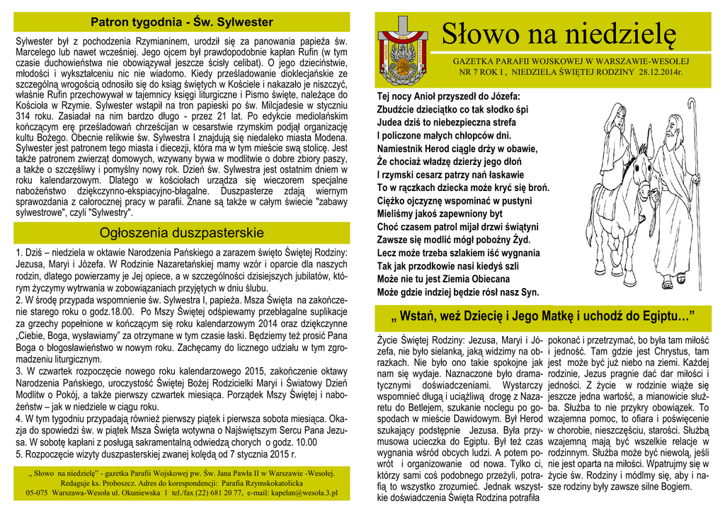 Patron tygodnia - Św. Sylwester Sylwester był z pochodzenia Rzymianinem, urodził się za panowania papieża św. Marcelego lub nawet wcześniej. Jego ojcem był prawdopodobnie kapłan Rufin (w tym czasie duchowieństwa nie obowiązywał jeszcze ścisły celibat). O jego dzieciństwie, młodości i wykształceniu nic nie wiadomo. Kiedy prześladowanie dioklecjańskie ze szczególną wrogością odnosiło się do ksiąg świętych w Kościele i nakazało je niszczyć, właśnie Rufin przechowywał w tajemnicy księgi liturgiczne i Pismo święte, należące do Kościoła w Rzymie. Sylwester wstąpił na tron papieski po św. Milcjadesie w styczniu 314 roku. Zasiadał na nim bardzo długo - przez 21 lat. Po edykcie mediolańskim kończącym erę prześladowań chrześcijan w cesarstwie rzymskim podjął organizację kultu Bożego. Obecnie relikwie św. Sylwestra I znajdują się niedaleko miasta Modena. Sylwester jest patronem tego miasta i diecezji, która ma w tym mieście swą stolicę. Jest także patronem zwierząt domowych, wzywany bywa w modlitwie o dobre zbiory paszy, a także o szczęśliwy i pomyślny nowy rok. Dzień św. Sylwestra jest ostatnim dniem w roku kalendarzowym. Dlatego w kościołach urządza się wieczorem specjalne nabożeństwo dziękczynno-ekspiacyjno-błagalne. Duszpasterze zdają wiernym sprawozdania z całorocznej pracy w parafii. Znane są także w całym świecie "zabawy sylwestrowe", czyli "Sylwestry". Ogłoszenia duszpasterskie 1. Dziś – niedziela w oktawie Narodzenia Pańskiego a zarazem święto Świętej Rodziny: Jezusa, Maryi i Józefa. W Rodzinie Nazaretańskiej mamy wzór i oparcie dla naszych rodzin, dlatego powierzamy je Jej opiece, a w szczególności dzisiejszych jubilatów, którym życzymy wytrwania w zobowiązaniach przyjętych w dniu ślubu. 2. W środę przypada wspomnienie św. Sylwestra I, papieża. Msza Święta na zakończenie starego roku o godz.18.00. Po Mszy Świętej odśpiewamy przebłagalne suplikacje za grzechy popełnione w kończącym się roku kalendarzowym 2014 oraz dziękczynne „Ciebie, Boga, wysławiamy” za otrzymane w tym czasie łaski. Będziemy też prosić Pana Boga o błogosławieństwo w nowym roku. Zachęcamy do licznego udziału w tym zgromadzeniu liturgicznym. 3. W czwartek rozpoczęcie nowego roku kalendarzowego 2015, zakończenie oktawy Narodzenia Pańskiego, uroczystość Świętej Bożej Rodzicielki Maryi i Światowy Dzień Modlitw o Pokój, a także pierwszy czwartek miesiąca. Porządek Mszy Świętej i nabożeństw – jak w niedziele w ciągu roku. 4. W tym tygodniu przypadają również pierwszy piątek i pierwsza sobota miesiąca. Okazja do spowiedzi św. w piątek Msza Święta wotywna o Najświętszym Sercu Pana Jezusa. W sobotę kapłani z posługą sakramentalną odwiedzą chorych o godz. 10.00 5. Rozpoczęcie wizyty duszpasterskiej zwanej kolędą od 7 stycznia 2015 r. „ Słowo na niedzielę” - gazetka Parafii Wojskowej pw. Św. Jana Pawła II w Warszawie -Wesołej. Redaguje ks. Proboszcz. Adres do korespondencji: Parafia Rzymskokatolicka 05-075 Warszawa-Wesoła ul. Okuniewska 1 tel./fax (22) 681 20 77, e-mail: kapelan@wesoła.3.pl Słowo na niedzielę GAZETKA PARAFII WOJSKOWEJ W WARSZAWIE-WESOŁEJ NR 7 ROK I , NIEDZIELA ŚWIĘTEJ RODZINY 28.12.2014r. Tej nocy Anioł przyszedł do Józefa: Zbudźcie dzieciątko co tak słodko śpi Judea dziś to niebezpieczna strefa I policzone małych chłopców dni. Namiestnik Herod ciągle drży w obawie, Że chociaż władzę dzierży jego dłoń I rzymski cesarz patrzy nań łaskawie To w rączkach dziecka może kryć się broń. Ciężko ojczyznę wspominać w pustyni Mieliśmy jakoś zapewniony byt Choć czasem patrol mijał drzwi świątyni Zawsze się modlić mógł pobożny Żyd. Lecz może trzeba szlakiem iść wygnania Tak jak przodkowie nasi kiedyś szli Może nie tu jest Ziemia Obiecana Może gdzie indziej będzie rósł nasz Syn. „ Wstań, weź Dziecię i Jego Matkę i uchodź do Egiptu…” Życie Świętej Rodziny: Jezusa, Maryi i Józefa, nie było sielanką, jaką widzimy na obrazkach. Nie było ono takie spokojne jak nam się wydaje. Naznaczone było dramatycznymi doświadczeniami. Wystarczy wspomnieć długą i uciążliwą drogę z Nazaretu do Betlejem, szukanie noclegu po gospodach w mieście Dawidowym. Był Herod szukający podstępnie Jezusa. Była przymusowa ucieczka do Egiptu. Był też czas wygnania wśród obcych ludzi. A potem powrót i organizowanie od nowa. Tylko ci, którzy sami coś podobnego przeżyli, potrafią to wszystko zrozumieć. Jednak wszystkie doświadczenia Święta Rodzina potrafiła pokonać i przetrzymać, bo była tam miłość i jedność. Tam gdzie jest Chrystus, tam jest może być już niebo na ziemi. Każdej rodzinie, Jezus pragnie dać dar miłości i jedności. Z życie w rodzinie wiąże się jeszcze jedna wartość, a mianowicie służba. Służba to nie przykry obowiązek. To wzajemna pomoc, to ofiara i poświęcenie w chorobie, nieszczęściu, starości. Służbą wzajemną mają być wszelkie relacje w rodzinnym. Służba może być niewolą, jeśli nie jest oparta na miłości. Wpatrujmy się w życie św. Rodziny i módlmy się, aby i nasze rodziny były zawsze silne Bogiem. Liturgia Słowa na Niedzielę Świętej Rodziny I Czytanie Syr 3,2-6.12-14 II Czytanie Kol 3,12-21 Czytanie z Księgi Syracydesa Pan uczcił ojca przez dzieci, a prawa matki nad synami utwierdził. Kto czci ojca, zyskuje odpuszczenie grzechów, a kto szanuje matkę, jakby skarby gromadził. Kto czci ojca, radość mieć będzie z dzieci, a w czasie modlitwy swej będzie wysłuchany. Kto szanuje ojca, długo żyć będzie, a kto posłuszny jest Panu, da wytchnienie swej matce. Synu, wspomagaj swego ojca w starości, nie zasmucaj go w jego życiu. A jeśliby nawet rozum stracił, miej wyrozumiałość, nie pogardzaj nim, choć jesteś w pełni sił. Miłosierdzie względem ojca nie pójdzie w zapomnienie, w miejsce grzech