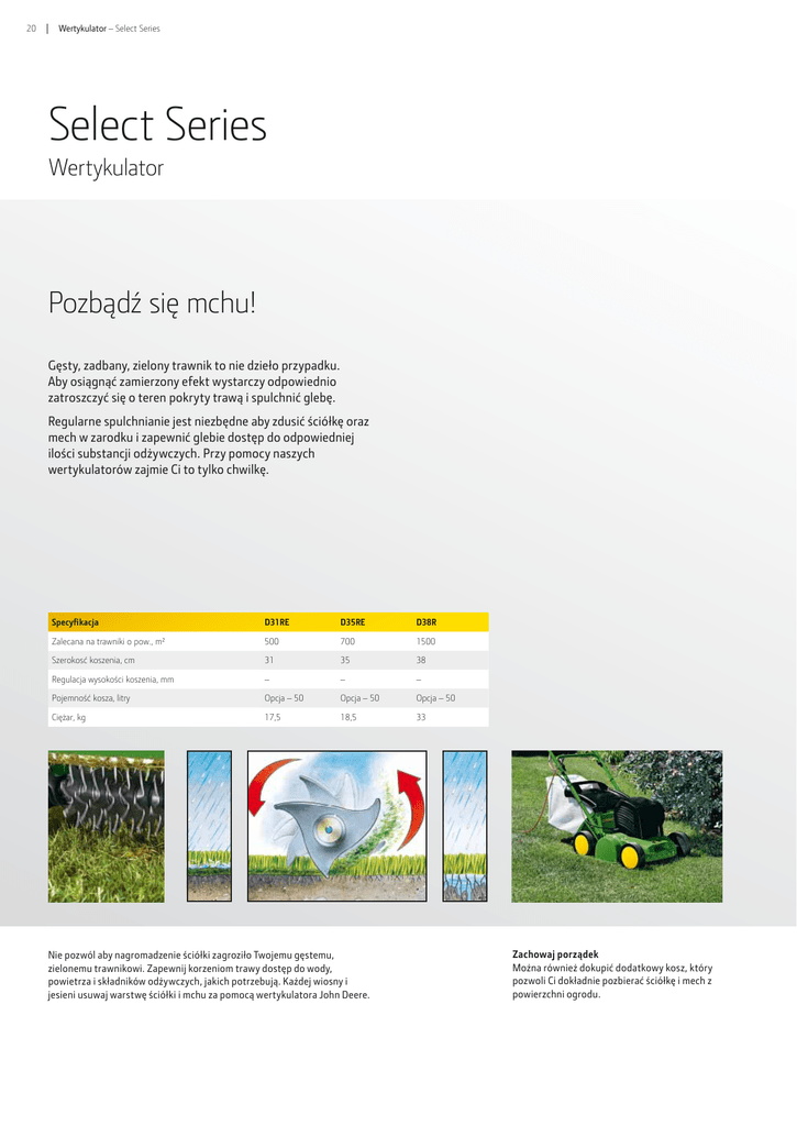20 | Wertykulator – Select Series Select Series Wertykulator Pozbądź się mchu! Gęsty, zadbany, zielony trawnik to nie dzieło przypadku. Aby osiągnąć zamierzony efekt wystarczy odpowiednio zatroszczyć się o teren pokryty trawą i spulchnić glebę. Regularne spulchnianie jest niezbędne aby zdusić ściółkę oraz mech w zarodku i zapewnić glebie dostęp do odpowiedniej ilości substancji odżywczych. Przy pomocy naszych wertykulatorów zajmie Ci to tylko chwilkę. Specyfikacja D31RE D35RE D38R Zalecana na trawniki o pow., m² 500 700 1500 Szerokosć koszenia, cm 31 35 38 Regulacja wysokości koszenia, mm – – – Pojemność kosza, litry Opcja – 50 Opcja – 50 Opcja – 50 Ciężar, kg 17,5 18,5 33 Nie pozwól aby nagromadzenie ściółki zagroziło Twojemu gęstemu, zielonemu trawnikowi. Zapewnij korzeniom trawy dostęp do wody, powietrza i składników odżywczych, jakich potrzebują. Każdej wiosny i jesieni usuwaj warstwę ściółki i mchu za pomocą wertykulatora John Deere. Zachowaj porządek Można również dokupić dodatkowy kosz, który pozwoli Ci dokładnie pozbierać ściółkę i mech z powierzchni ogrodu.