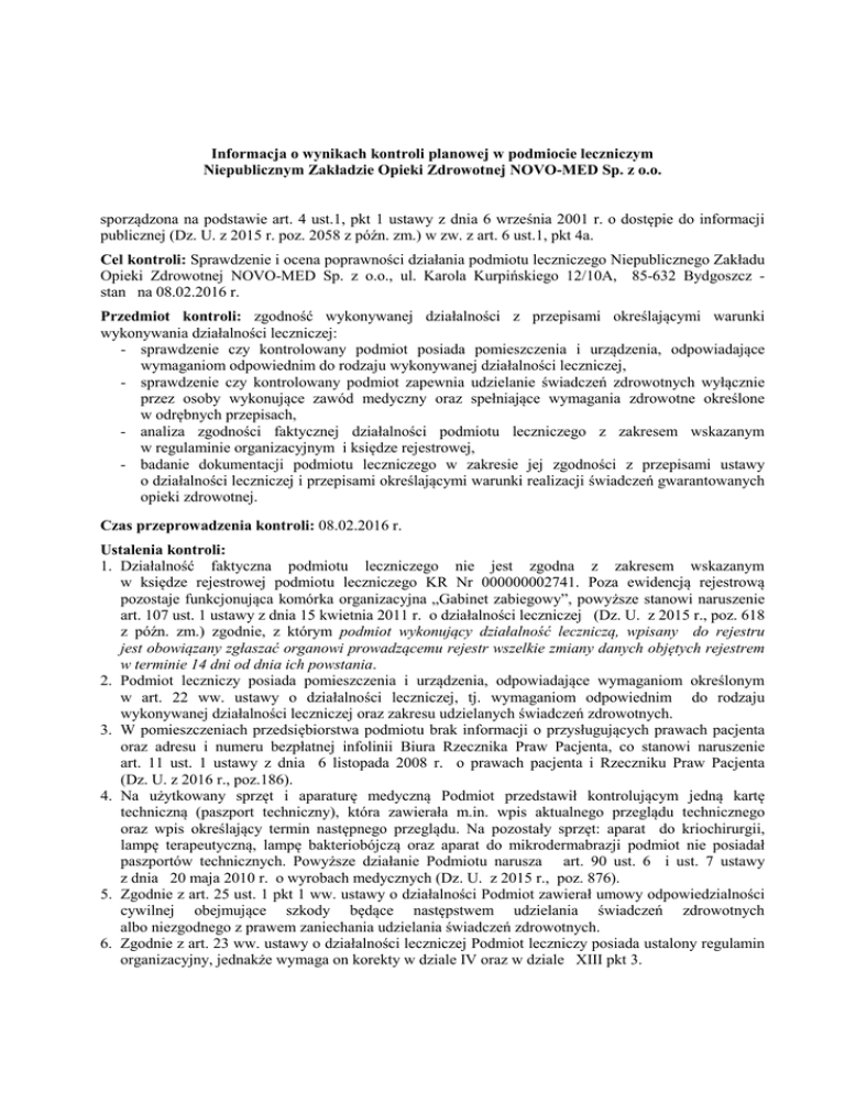 Informacja o wynikach kontroli planowej w podmiocie leczniczym Niepublicznym Zakładzie Opieki Zdrowotnej NOVO-MED Sp. z o.o. sporządzona na podstawie art. 4 ust.1, pkt 1 ustawy z dnia 6 września 2001 r. o dostępie do informacji publicznej (Dz. U. z 2015 r. poz. 2058 z późn. zm.) w zw. z art. 6 ust.1, pkt 4a. Cel kontroli: Sprawdzenie i ocena poprawności działania podmiotu leczniczego Niepublicznego Zakładu Opieki Zdrowotnej NOVO-MED Sp. z o.o., ul. Karola Kurpińskiego 12/10A, 85-632 Bydgoszcz stan na 08.02.2016 r. Przedmiot kontroli: zgodność wykonywanej działalności z przepisami określającymi warunki wykonywania działalności leczniczej: - sprawdzenie czy kontrolowany podmiot posiada pomieszczenia i urządzenia, odpowiadające wymaganiom odpowiednim do rodzaju wykonywanej działalności leczniczej, - sprawdzenie czy kontrolowany podmiot zapewnia udzielanie świadczeń zdrowotnych wyłącznie przez osoby wykonujące zawód medyczny oraz spełniające wymagania zdrowotne określone w odrębnych przepisach, - analiza zgodności faktycznej działalności podmiotu leczniczego z zakresem wskazanym w regulaminie organizacyjnym i księdze rejestrowej, - badanie dokumentacji podmiotu leczniczego w zakresie jej zgodności z przepisami ustawy o działalności leczniczej i przepisami określającymi warunki realizacji świadczeń gwarantowanych opieki zdrowotnej. Czas przeprowadzenia kontroli: 08.02.2016 r. Ustalenia kontroli: 1. Działalność faktyczna podmiotu leczniczego nie jest zgodna z zakresem wskazanym w księdze rejestrowej podmiotu leczniczego KR Nr 000000002741. Poza ewidencją rejestrową pozostaje funkcjonująca komórka organizacyjna „Gabinet zabiegowy”, powyższe stanowi naruszenie art. 107 ust. 1 ustawy z dnia 15 kwietnia 2011 r. o działalności leczniczej (Dz. U. z 2015 r., poz. 618 z późn. zm.) zgodnie, z którym podmiot wykonujący działalność leczniczą, wpisany do rejestru jest obowiązany zgłaszać organowi prowadzącemu rejestr wszelkie zmiany danych objętych rejestrem w terminie 14 dni od dnia ich powstania. 2. Podmiot leczniczy posiada pomieszczenia i urządzenia, odpowiadające wymaganiom określonym w art. 22 ww. ustawy o działalności leczniczej, tj. wymaganiom odpowiednim do rodzaju wykonywanej działalności leczniczej oraz zakresu udzielanych świadczeń zdrowotnych. 3. W pomieszczeniach przedsiębiorstwa podmiotu brak informacji o przysługujących prawach pacjenta oraz adresu i numeru bezpłatnej infolinii Biura Rzecznika Praw Pacjenta, co stanowi naruszenie art. 11 ust. 1 ustawy z dnia 6 listopada 2008 r. o prawach pacjenta i Rzeczniku Praw Pacjenta (Dz. U. z 2016 r., poz.186). 4. Na użytkowany sprzęt i aparaturę medyczną Podmiot przedstawił kontrolującym jedną kartę techniczną (paszport techniczny), która zawierała m.in. wpis aktualnego przeglądu technicznego oraz wpis określający termin następnego przeglądu. Na pozostały sprzęt: aparat do kriochirurgii, lampę terapeutyczną, lampę bakteriobójczą oraz aparat do mikrodermabrazji podmiot nie posiadał paszportów technicznych. Powyższe działanie Podmiotu narusza art. 90 ust. 6 i ust. 7 ustawy z dnia 20 maja 2010 r. o wyrobach medycznych (Dz. U. z 2015 r., poz. 876). 5. Zgodnie z art. 25 ust. 1 pkt 1 ww. ustawy o działalności Podmiot zawierał umowy odpowiedzialności cywilnej obejmujące szkody będące następstwem udzielania świadczeń zdrowotnych albo niezgodnego z prawem zaniechania udzielania świadczeń zdrowotnych. 6. Zgodnie z art. 23 ww. ustawy o działalności leczniczej Podmiot leczniczy posiada ustalony regulamin organizacyjny, jednakże wymaga on korekty w dziale IV oraz w dziale XIII pkt 3. 7. Podmiot leczniczy zapewnia udzielanie świadczeń zdrowotnych wyłącznie przez osoby wykonujące zawód medyczny oraz spełniające wymagania zdrowotne określone w odrębnych przepisach, a ich kwalifikacje są zgodne z warunkami realizacji świadczeń gwarantowanych określonych w rozporządzeniu w załączniku Nr 1, Lp. 20 rozporządzenia Ministra Zdrowia z dnia 6 listopada 2013 r. w sprawie świadczeń gwarantowanych z zakresu ambulatoryjnej opieki specjalistycznej (Dz. U. z 2013 r., poz. 1413 z późn. zm.). Ocena działalności podmiotu kontrolowanego, uwagi i wnioski: Wydział Zdrowia – Kujawsko-Pomorskie Centrum Zdrowia Publicznego Kujawsko – Pomorskiego Urzędu Wojewódzkiego w Bydgoszczy kontrolowaną działalność ocenia pozytywnie z nieprawidłowościami. Wnioski dotyczące doskonalenia: 1) złożyć do organu prowadzącego Rejestr Podmiotów Wykonujących Działalność Leczniczą wniosek w zakresie wpisu funkcjonującej komórki organizacyjnej „Gabinet zabiegowy”. Wniosek należy złożyć poprzez aplikację elektroniczną, dostępną na stronie internetowej: www.rpwdl.csioz.gov.pl, 2) w miejscu ogólnodostępnym, w formie pisemnej udostępnić informację o prawach pacjenta określonych w ww. ustawie o prawach pacjenta i Rzeczniku Praw Pacjenta i w przepisach odrębnych oraz adresu i numeru bezpłatnej infolinii Biura Rzecznika Praw Pacjenta, 3) założyć brakujące paszporty techniczne na sprzęt i aparaturę medyczną oraz poddać okresowej kontroli technicznej aparat do kriochirurgii, lampę terapeutyczną, lampę bakteriobójczą oraz aparat do mikrodermabrazji. Dokumentację techniczną prowadzić zgodnie z wymaganiami określonymi w ww. ustawie o wyrobach medycznych, 4) w regulaminie organizacyjnym dokonać korekty w dziale IV oraz w dziale XIII w pkt 3. Kontrolujący: 1.............................................. 2.............................................. Zatwierdził: z up. Wojewody Dyrektor Wydziału