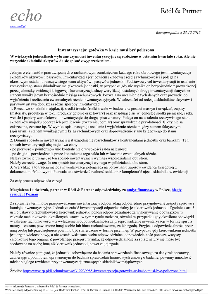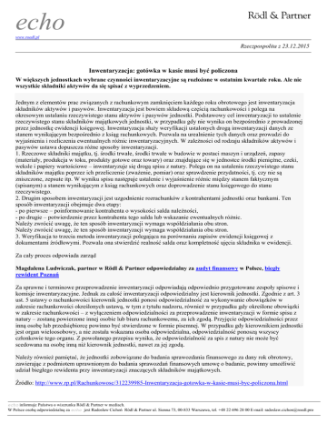 echo www.roedl.pl Rzeczpospolita z 23.12.2015 Inwentaryzacja: gotówka w kasie musi być policzona W większych jednostkach wybrane czynności inwentaryzacyjne są rozłożone w ostatnim kwartale roku. Ale nie wszystkie składniki aktywów da się spisać z wyprzedzeniem. Jednym z elementów prac związanych z rachunkowym zamknięciem każdego roku obrotowego jest inwentaryzacja składników aktywów i pasywów. Inwentaryzacja jest bowiem składową częścią rachunkowości i polega na okresowym ustalaniu rzeczywistego stanu aktywów i pasywów jednostki. Podstawowy cel inwentaryzacji to ustalenie rzeczywistego stanu składników majątkowych jednostki, w przypadku gdy nie wynika on bezpośrednio z prowadzonej przez jednostkę ewidencji księgowej. Inwentaryzacja służy weryfikacji ustalonych drogą inwentaryzacji danych ze stanem wynikającym bezpośrednio z ksiąg rachunkowych. Pozwala na urealnienie tych danych oraz prowadzi do wyjaśnienia i rozliczenia ewentualnych różnic inwentaryzacyjnych. W zależności od rodzaju składników aktywów i pasywów ustawa dopuszcza różne sposoby inwentaryzacji. 1. Rzeczowe składniki majątku, tj. środki trwałe, środki trwałe w budowie w postaci maszyn i urządzeń, zapasy (materiały, produkcja w toku, produkty gotowe oraz towary) oraz znajdujące się w jednostce środki pieniężne, czeki, weksle i papiery wartościowe – inwentaryzuje się drogą spisu z natury. Polega on na ustaleniu rzeczywistego stanu składników majątku poprzez ich przeliczenie (zważenie, pomiar) oraz sprawdzenie przydatności, tj. czy nie są zniszczone, zepsute itp. W wyniku spisu następuje ustalenie i wyjaśnienie różnic między stanem faktycznym (spisanym) a stanem wynikającym z ksiąg rachunkowych oraz doprowadzenie stanu księgowego do stanu rzeczywistego. 2. Drugim sposobem inwentaryzacji jest uzgodnienie rozrachunków z kontrahentami jednostki oraz bankami. Ten sposób inwentaryzacji obejmuje dwa etapy: - po pierwsze – poinformowanie kontrahenta o wysokości salda należności, - po drugie – potwierdzenie przez kontrahenta tego salda lub wskazanie ewentualnych różnic. Należy zwrócić uwagę, że ten sposób inwentaryzacji wymaga współdziałania obu stron. Należy zwrócić uwagę, że ten sposób inwentaryzacji wymaga współdziałania obu stron. 3. Weryfikacja to trzecia metoda inwentaryzacji polegająca na porównaniu zapisów ewidencji księgowej z dokumentami źródłowymi. Pozwala ona stwierdzić realność salda oraz kompletność ujęcia składnika w ewidencji. Za cały proces odpowiada zarząd Magdalena Ludwiczak, partner w Rödl & Partner odpowiedzialny za audyt finansowy w Polsce, biegły rewident Poznań Za sprawne i terminowe przeprowadzenie inwentaryzacji odpowiadają odpowiednio przygotowane zespoły spisowe i komisje inwentaryzacyjne. Jednak za całość inwentaryzacji odpowiedzialny jest kierownik jednostki. Zgodnie z art. 3 ust. 5 ustawy o rachunkowości kierownik jednostki ponosi odpowiedzialność za wykonywanie obowiązków w zakresie rachunkowości określonych ustawą, w tym z tytułu nadzoru, również w przypadku gdy określone obowiązki w zakresie rachunkowości – z wyłączeniem odpowiedzialności za przeprowadzenie inwentaryzacji w formie spisu z natury – zostaną powierzone innej osobie lub biuru rachunkowemu, za ich zgodą. Przyjęcie odpowiedzialności przez inną osobę lub przedsiębiorcę powinno być stwierdzone w formie pisemnej. W przypadku gdy kierownikiem jednostki jest organ wieloosobowy, a nie została wskazana osoba odpowiedzialna, odpowiedzialność ponoszą wszyscy członkowie tego organu. Z powołanego przepisu wynika, że odpowiedzialność za spis z natury nie może być scedowana na osobę inną niż kierownik jednostki, nawet za jej zgodą. Należy również pamiętać, że jednostki zobowiązane do badania sprawozdania finansowego za dany rok obrotowy, zawierając z podmiotem uprawnionym do badania sprawozdań finansowych umowę o badanie, powinny umożliwić udział biegłego rewidenta przy inwentaryzacji znaczących składników majątkowych. Źródło: http://www.rp.pl/Rachunkowosc/312239985-Inwentaryzacja-gotowka-w-kasie-musi-byc-policzona.html echo informuje Państwa o wizerunku Rödl & Partner w mediach. W Polsce osobą odpowiedzialną za echo jest Radosław Cichoń Rödl & Partner ul. Sienna 73, 00-833 Warszawa, tel. +48 22 696 28 00 E-mail: [email protected]
