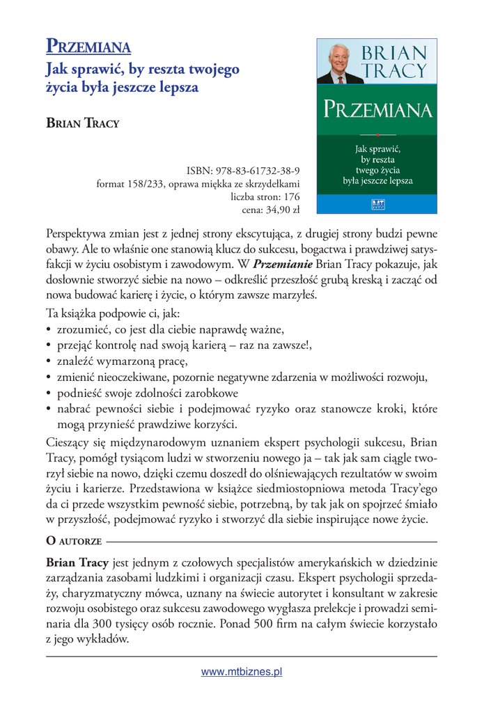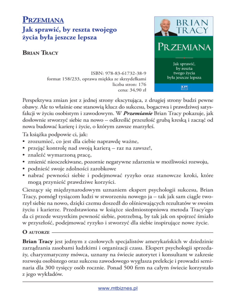 Przemiana Jak sprawić, by reszta twojego życia była jeszcze lepsza Brian Tracy ISBN: 978-83-61732-38-9 format 158/233, oprawa miękka ze skrzydełkami liczba stron: 176 cena: 34,90 zł Perspektywa zmian jest z jednej strony ekscytująca, z drugiej strony budzi pewne obawy. Ale to właśnie one stanowią klucz do sukcesu, bogactwa i prawdziwej satysfakcji w życiu osobistym i zawodowym. W Przemianie Brian Tracy pokazuje, jak dosłownie stworzyć siebie na nowo – odkreślić przeszłość grubą kreską i zacząć od nowa budować karierę i życie, o którym zawsze marzyłeś. Ta książka podpowie ci, jak: • zrozumieć, co jest dla ciebie naprawdę ważne, • przejąć kontrolę nad swoją karierą – raz na zawsze!, • znaleźć wymarzoną pracę, • zmienić nieoczekiwane, pozornie negatywne zdarzenia w możliwości rozwoju, • podnieść swoje zdolności zarobkowe • nabrać pewności siebie i podejmować ryzyko oraz stanowcze kroki, które mogą przynieść prawdziwe korzyści. Cieszący się międzynarodowym uznaniem ekspert psychologii sukcesu, Brian Tracy, pomógł tysiącom ludzi w stworzeniu nowego ja – tak jak sam ciągle tworzył siebie na nowo, dzięki czemu doszedł do olśniewających rezultatów w swoim życiu i karierze. Przedstawiona w książce siedmiostopniowa metoda Tracy’ego da ci przede wszystkim pewność siebie, potrzebną, by tak jak on spojrzeć śmiało w przyszłość, podejmować ryzyko i stworzyć dla siebie inspirujące nowe życie. O autorze Brian Tracy jest jednym z czołowych specjalistów amerykańskich w dziedzinie zarządzania zasobami ludzkimi i organizacji czasu. Ekspert psychologii sprzedaży, charyzmatyczny mówca, uznany na świecie autorytet i konsultant w zakresie rozwoju osobistego oraz sukcesu zawodowego wygłasza prelekcje i prowadzi seminaria dla 300 tysięcy osób rocznie. Ponad 500 firm na całym świecie korzystało z jego wykładów. www.mtbiznes.pl Przemiana Spis treści Przedmowa . . . . . . . . . . . . . . . . . . . . . . . . . . . . . . . . . . . 13 WSTĘP. Twój zmieniający się świat . . . . . . . . . . . . . . . . Wiwat dobre czasy!. . . . . . . . . . . . . . . . . . . . . . . . . . . . Zmiana pracy . . . . . . . . . . . . . . . . . . . . . . . . . . . . . . . . Zanikające zawody i branże . . . . . . . . . . . . . . . . . . . . . . Nieustanne zmiany stylu życia . . . . . . . . . . . . . . . . . . . . Pomyśl o przyszłości . . . . . . . . . . . . . . . . . . . . . . . . . . . Nowi 65-latkowie . . . . . . . . . . . . . . . . . . . . . . . . . . . . . Punkt zwrotny . . . . . . . . . . . . . . . . . . . . . . . . . . . . . . . Adaptacja, przystosowanie, reakcja. . . . . . . . . . . . . . . . . 15 15 16 17 18 19 19 20 21 ROZDZIAŁ 1. Jesteś wyjątkowy. . . . . . . . . . . . . . . . . . . Najlepiej płatna praca . . . . . . . . . . . . . . . . . . . . . . . . . . Umiejętność myślenia w XXI wieku. . . . . . . . . . . . . . . . Sześć etapów odzyskiwania kontroli . . . . . . . . . . . . . . . . Pytania do przemyślenia . . . . . . . . . . . . . . . . . . . . . . . . 23 24 25 28 31 ROZDZIAŁ 2. Kim jesteś? . . . . . . . . . . . . . . . . . . . . . . . Zarządź przerwę . . . . . . . . . . . . . . . . . . . . . . . . . . . . . . Przeprowadź dokładną autoanalizę . . . . . . . . . . . . . . . . . Pytania do przemyślenia . . . . . . . . . . . . . . . . . . . . . . . . 33 34 35 41 www.mtbiznes.pl 7 Przemiana SPIS TREŚCI ROZDZIAŁ 3. Czego chcesz? . . . . . . . . . . . . . . . . . . . . . Odpowiedzi są znane . . . . . . . . . . . . . . . . . . . . . . . . . . . Żelazne prawo . . . . . . . . . . . . . . . . . . . . . . . . . . . . . . . Moc myślenia . . . . . . . . . . . . . . . . . . . . . . . . . . . . . . . . Zasada wiary. . . . . . . . . . . . . . . . . . . . . . . . . . . . . . . . . Zasada oczekiwań . . . . . . . . . . . . . . . . . . . . . . . . . . . . . Prawo przyciągania . . . . . . . . . . . . . . . . . . . . . . . . . . . . Wnioski . . . . . . . . . . . . . . . . . . . . . . . . . . . . . . . . . . . . Patrz, dokąd zmierzasz . . . . . . . . . . . . . . . . . . . . . . . . . Twoja pięcioletnia wizja. . . . . . . . . . . . . . . . . . . . . . . . . Powrót z przyszłości . . . . . . . . . . . . . . . . . . . . . . . . . . . Siedem głównych dziedzin życia . . . . . . . . . . . . . . . . . . . Trzej wrogowie, których należy unikać . . . . . . . . . . . . . . Metoda szybkiej listy . . . . . . . . . . . . . . . . . . . . . . . . . . . Klucz do sukcesu . . . . . . . . . . . . . . . . . . . . . . . . . . . . . Cele, plany i dochody . . . . . . . . . . . . . . . . . . . . . . . . . . Samochodem przez cały kraj . . . . . . . . . . . . . . . . . . . . . Proste ustalanie celów . . . . . . . . . . . . . . . . . . . . . . . . . . Ustalanie celów – ćwiczenie . . . . . . . . . . . . . . . . . . . . . . Podejmowanie działań . . . . . . . . . . . . . . . . . . . . . . . . . . Uwolnienie energii psychicznej. . . . . . . . . . . . . . . . . . . . Kontrola nad własnym życiem i wewnętrzna siła . . . . . . . Pytania do przemyślenia . . . . . . . . . . . . . . . . . . . . . . . . 43 44 44 45 45 46 46 47 48 48 49 50 52 54 55 56 56 57 59 60 61 61 62 ROZDZIAŁ 4. Ile jesteś wart? . . . . . . . . . . . . . . . . . . . . Dążenie do szczęścia . . . . . . . . . . . . . . . . . . . . . . . . . . . Praca jako towar . . . . . . . . . . . . . . . . . . . . . . . . . . . . . . Definicja pracy . . . . . . . . . . . . . . . . . . . . . . . . . . . . . . . Twoje najcenniejsze aktywa . . . . . . . . . . . . . . . . . . . . . . Osobiste planowanie strategiczne . . . . . . . . . . . . . . . . . . Prezes własnej firmy . . . . . . . . . . . . . . . . . . . . . . . . . . . Planowanie sukcesu. . . . . . . . . . . . . . . . . . . . . . . . . . . . Siedem obszarów myślenia strategicznego . . . . . . . . . . . . Siedem elementów osobistego planu strategicznego. . . . . Zwiększ swój wkład . . . . . . . . .