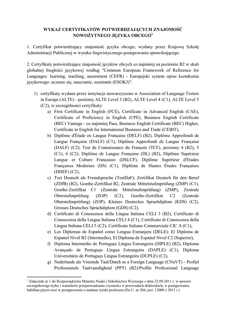 WYKAZ CERTYFIKATÓW POTWIERDZAJĄCYCH ZNAJOMOŚĆ NOWOŻYTNEGO JĘZYKA OBCEGO1 1. Certyfikat potwierdzający znajomość języka obcego, wydany przez Krajową Szkołę Administracji Publicznej w wyniku lingwistycznego postępowania sprawdzającego. 2. Certyfikaty potwierdzające znajomość języków obcych co najmniej na poziomie B2 w skali globalnej biegłości językowej według "Common European Framework of Reference for Languages: learning, teaching, assessment (CEFR) - Europejski system opisu kształcenia językowego: uczenie się, nauczanie, ocenianie (ESOKJ)": 1) certyfikaty wydane przez instytucje stowarzyszone w Association of Language Testers in Europe (ALTE) - poziomy ALTE Level 3 (B2), ALTE Level 4 (C1), ALTE Level 5 (C2), w szczególności certyfikaty: a) First Certificate in English (FCE), Certificate in Advanced English (CAE), Certificate of Proficiency in English (CPE), Business English Certificate (BEC) Vantage - co najmniej Pass, Business English Certificate (BEC) Higher, Certificate in English for International Business and Trade (CEIBT), b) Diplôme d'Étude en Langue Française (DELF) (B2), Diplôme Approfondi de Langue Française (DALF) (C1), Diplôme Approfondi de Langue Française (DALF) (C2); Test de Connaissance du Français (TCF), poziomy 4 (B2), 5 (C1), 6 (C2); Diplôme de Langue Française (DL) (B2), Diplôme Supérieur Langue et Culture Françaises (DSLCF), Diplôme Supérieur d'Etudes Françaises Modernes (DS) (C1), Diplôme de Hautes Études Françaises (DHEF) (C2), c) Test Deutsch als Fremdsprache (TestDaF); Zertifikat Deutsch für den Beruf (ZDfB) (B2), Goethe-Zertifikat B2, Zentrale Mittelstufenprüfung (ZMP) (C1), Goethe-Zertifikat C1 (Zentrale Mittelstufenprüfung) (ZMP), Zentrale Oberstufenprüfung (ZOP) (C2), Goethe-Zertifikat C2 (Zentrale Oberstufenprüfung) (ZOP), Kleines Deutsches Sprachdiplom (KDS) (C2), Grosses Deutsches Sprachdiplom (GDS) (C2), d) Certificato di Conoscenza della Lingua Italiana CELI 3 (B2), Certificato di Conoscenza della Lingua Italiana CELI 4 (C1), Certificato di Conoscenza della Lingua Italiana CELI 5 (C2); Certificato Italiano Commerciale CIC A (C1), e) Los Diplomas de Espańol como Lengua Extranjera (DELE): El Diploma de Espańol Nivel B2 (Intermedio), El Diploma de Espańol Nivel C2 (Superior), f) Diploma Intermédio de Portuguęs Língua Estrangeira (DIPLE) (B2), Diploma Avançado de Portuguęs Língua Estrangeira (DAPLE) (C1), Diploma Universitário de Portuguęs Língua Estrangeira (DUPLE) (C2), g) Nederlands als Vreemde Taal/Dutch as a Foreign Language (CNaVT) - Profiel Professionele Taalvaardigheid (PPT) (B2)/Profile Professional Language 1 Załącznik nr 1 do Rozporządzenia Ministra Nauki i Szkolnictwa Wyższego z dnia 22.09.2011 r. w sprawie szczegółowego trybu i warunków przeprowadzania czynności w przewodach doktorskich, w postępowaniu habilitacyjnym oraz w postępowaniu o nadanie tytułu profesora (Dz.U. nr 204, poz. 12000 z 2011 r.) Proficiency (PPT) (B2), Profiel Taalvaardigheid Hoger Onderwijs (PTHO) (B2)/Profile Language Proficiency Higher Education (PTHO) (B2), Profiel Academische Taalvaardigheid (PAT) (C1)/Profile Academic Language Proficiency (PAT) (C1); Nederlands als Tweede Taal II (NT2-II) (B2)/Dutch as a Second Language II (NT2-II) (B2), h) h) Prřve i Dansk 3 (B2), Studieprřven (C1), i) Certyfikat znajomości języka słoweńskiego na poziomie średniozaawansowanym/ Certificate of Slovene on the Intermediate Level (B2), Certyfikat znajomości języka słoweńskiego na poziomie zaawansowanym/ Certificate of Slovene on the Advanced Level (C1); 2) certyfikaty następujących instytucji: a) Educational Testing Service (ETS) - w szczególności certyfikaty: Test of English as a Foreign Language (TOEFL) - co najmniej 87 pkt w wersji Internet-Based Test (iBT); Test of English as a Foreign Language (TOEFL) co najmniej 180 pkt w wersji Computer-Based Test (CBT) uzupełnione o co najmniej 50 pkt z Test of Spoken English (TSE); Test of English as a Foreign Language (TOEFL) - co najmniej 510 pkt w wersji Paper-Based Test (PBT) uzupełnione o co najmniej 3,5 pkt z Test of Written English (TWE) oraz o co najmniej 50 pkt z Test of Spoken English (TSE); Test of English for International Communication (TOEIC) - co najmniej 700 pkt; Test de Français International (TFI) - co najmniej 605 pkt, b) European Consortium for the Certificate of Attainment in Modern Languages (ECL), c) City & Guilds, City & Guilds Pitman Qualifications, Pitman Qualifications Institute - w szczególności certyfikaty: English for Speakers of Other Languages (ESOL) - First Class Pass at Intermediate Level, Higher Intermediate Level, Advanced Level; International English for Speakers of Other Languages (IESOL) - poziom "Communicator", poziom "Expert", poziom "Mastery"; City & Guilds Level 1 Certificate in ESOL International (reading, writing and listening) Communicator (B2) 500/1765/2; City & Guilds Level 2 Certificate in ESOL International (reading, writing and listening) Expert (C1) 500/1766/4; City & Guilds Level 3 Certificate in ESOL International (reading, writing and listening) Mastery (C2) 500/1767/6; Spoken English Test (SET) for Business - Stage B poziom "Communicator", Stage C poziom "Expert", Stage C poziom "Mastery"; English for Business Communications (EBC) - Level 2, Level 3; English for Office Skills (EOS) Level 2, d) Edexcel, Pearson Language Tests, Pearson Language Assessments - w szczególności certyfikaty: London Tests of English, Level 3 (Edexcel Level 1 Certificate in ESOL International); London Tests of English, Level 4 (Edexcel Level 2 Certificate in ESOL International); London Tests of English, Level 5 (Edexcel Level 3 Certificate in ESOL International), e) Education Development International (EDI), London Chamber of Commerce and Industry Examinations Board - w szczególności certyfikaty: London f) g) h) i) j) k) l) m) n) o) p) q) r) s) t) u) v) Chamber of Commerce and Industry Examinations (LCCI) - English for