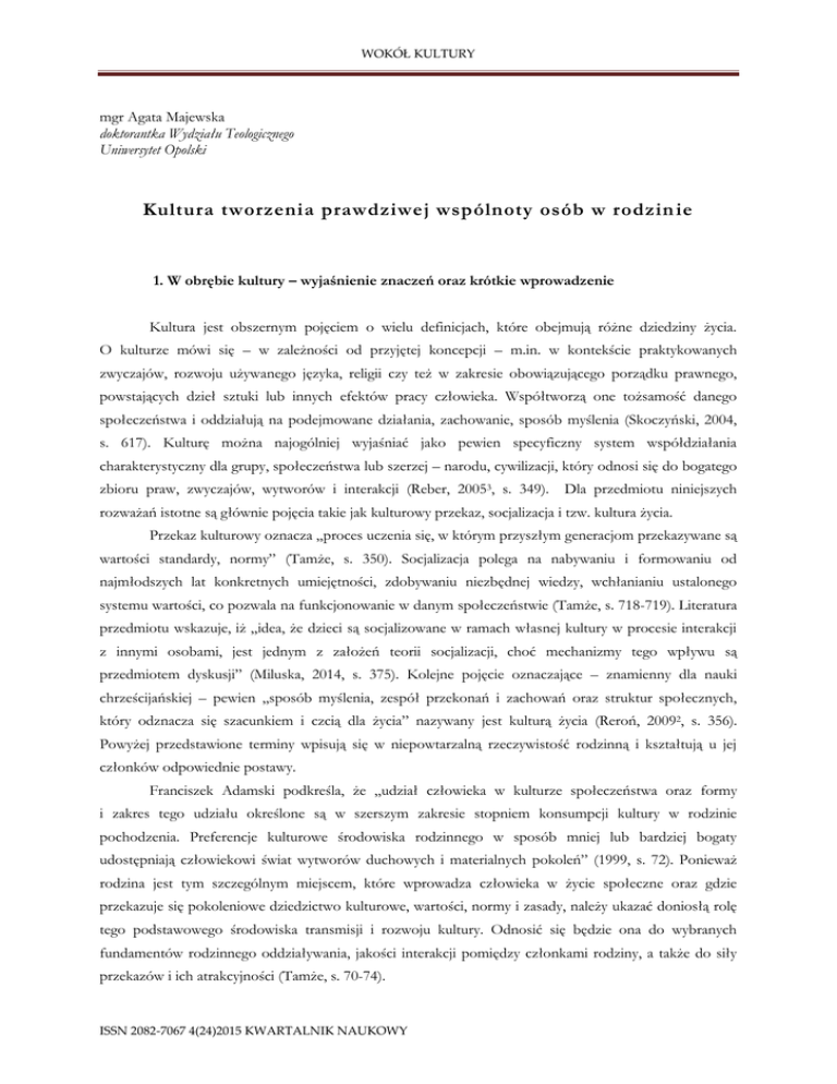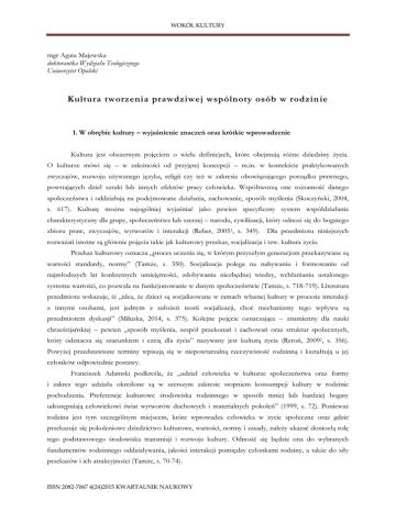 WOKÓŁ KULTURY mgr Agata Majewska doktorantka Wydziału Teologicznego Uniwersytet Opolski Kultura tworzenia prawdziwej wspólnoty osób w rodzin ie 1. W obrębie kultury – wyjaśnienie znaczeń oraz krótkie wprowadzenie Kultura jest obszernym pojęciem o wielu definicjach, które obejmują różne dziedziny życia. O kulturze mówi się – w zależności od przyjętej koncepcji – m.in. w kontekście praktykowanych zwyczajów, rozwoju używanego języka, religii czy też w zakresie obowiązującego porządku prawnego, powstających dzieł sztuki lub innych efektów pracy człowieka. Współtworzą one tożsamość danego społeczeństwa i oddziałują na podejmowane działania, zachowanie, sposób myślenia (Skoczyński, 2004, s. 617). Kulturę można najogólniej wyjaśniać jako pewien specyficzny system współdziałania charakterystyczny dla grupy, społeczeństwa lub szerzej – narodu, cywilizacji, który odnosi się do bogatego zbioru praw, zwyczajów, wytworów i interakcji (Reber, 20053, s. 349). Dla przedmiotu niniejszych rozważań istotne są głównie pojęcia takie jak kulturowy przekaz, socjalizacja i tzw. kultura życia. Przekaz kulturowy oznacza „proces uczenia się, w którym przyszłym generacjom przekazywane są wartości standardy, normy” (Tamże, s. 350). Socjalizacja polega na nabywaniu i formowaniu od najmłodszych lat konkretnych umiejętności, zdobywaniu niezbędnej wiedzy, wchłanianiu ustalonego systemu wartości, co pozwala na funkcjonowanie w danym społeczeństwie (Tamże, s. 718-719). Literatura przedmiotu wskazuje, iż „idea, że dzieci są socjalizowane w ramach własnej kultury w procesie interakcji z innymi osobami, jest jednym z założeń teorii socjalizacji, choć mechanizmy tego wpływu są przedmiotem dyskusji” (Miluska, 2014, s. 375). Kolejne pojęcie oznaczające – znamienny dla nauki chrześcijańskiej – pewien „sposób myślenia, zespół przekonań i zachowań oraz struktur społecznych, który odznacza się szacunkiem i czcią dla życia” nazywany jest kulturą życia (Reroń, 20092, s. 356). Powyżej przedstawione terminy wpisują się w niepowtarzalną rzeczywistość rodzinną i kształtują u jej członków odpowiednie postawy. Franciszek Adamski podkreśla, że „udział człowieka w kulturze społeczeństwa oraz formy i zakres tego udziału określone są w szerszym zakresie stopniem konsumpcji kultury w rodzinie pochodzenia. Preferencje kulturowe środowiska rodzinnego w sposób mniej lub bardziej bogaty udostępniają człowiekowi świat wytworów duchowych i materialnych pokoleń” (1999, s. 72). Ponieważ rodzina jest tym szczególnym miejscem, które wprowadza człowieka w życie społeczne oraz gdzie przekazuje się pokoleniowe dziedzictwo kulturowe, wartości, normy i zasady, należy ukazać doniosłą rolę tego podstawowego środowiska transmisji i rozwoju kultury. Odnosić się będzie ona do wybranych fundamentów rodzinnego oddziaływania, jakości interakcji pomiędzy członkami rodziny, a także do siły przekazów i ich atrakcyjności (Tamże, s. 70-74). ISSN 2082-7067 4(24)2015 KWARTALNIK NAUKOWY WOKÓŁ KULTURY Warto w tym miejscu tylko zaznaczyć, iż w naukowym dyskursie zwraca się uwagę na coraz częściej spotykaną sytuację braku ugruntowania czy osadzenia dzisiejszego człowieka w kulturze, co może być warunkowane różnorodnymi czynnikami (Skoczyński, 2004, s. 618). Więzi międzypokoleniowe w rodzinie określa się też dziś jako zdecydowanie słabsze, z czego wysuwane są pesymistyczne wnioski (Juroszek, 2013, s. 181-182). Najczęściej wskazuje się na dwa źródła oddziałujące w sposób znaczący na rodzinę– mianowicie na „pogarszające się warunki życia oraz postępującą laicyzację świadomości” (Dyczewski, 2003, s. 23). Współcześnie obserwowalne zmiany w wybranych obszarach życia dotykają ważnej płaszczyzny, jaką są przyjmowane i uznawane wartości (oraz ich stałość). Występujące przemiany niejednokrotnie stawiają w nowym świetle dotychczasowo postrzegane tradycje rodzinne czy autorytety społeczne (Kopka, 2008, s. 62-63). Niektórzy autorzy tłumaczą ten tzw. brak zakorzenienia współczesnymi tendencjami, które dążą do niszczenia trwałości struktury, którą jest rodzina. Wskazuje się na społeczne niedowierzanie instytucji rodziny i działanie zmierzające do dezintegracji rodzin, ich późniejszej rekonstrukcji, czyli budowy kolejnych wspólnot składających się z nowych członków, aż do ponownego rozpadu (Lévi-Strauss, 20054, s. 350). Dlatego też równocześnie postuluje się konieczność odnowy życia rodzinnego, integracji członków rodziny, umocnienia duchowego oraz troski na płaszczyźnie kulturowej i moralnej (Drożdż, 2011, s. 60-63). Mając na względzie zachodzące przeobrażenia i pewne zjawiska społeczne, zasadnym wydaje się próba przedstawienia rodziny – naturalnego środowiska społecznego i wychowawczego – z perspektywy ważnych zadań w zakresie wybranych wymiarów kultury (Petryk, 2013, s. 89). 2. Kulturotwórcza rola wspólnoty rodzinnej W rodzinie dokonuje się transmisja międzypokoleniowa norm, wzorców postępowania, kultywowanych tradycji, postaw, ról i ustalonego systemu wartości. Dzięki temu człowiek rozwija swoją tożsamość, kształtuje relacje rodzinne, modeluje przyszłe kontakty społeczne i buduje własną rodzinę z kolejnymi przekazami, zwyczajami, poglądami (Kołodziej, 2011, s. 30). W końcu każda rodzina posiada swój własny system komunikacji interpersonalnej, relacje emocjonalne, aktywność kulturową – „ma swoją historię, przechowuje pamiątki po przodkach, pielęgnuje więź genealogiczną, używa sobie tylko właściwych słów i zwrotów językowych, po swojemu ocenia rzeczywistość społeczną” (Dyczewski, 2003, s. 38). Te i inne elementy życia rodziny tworzą jej charakterystyczną kulturę. Leon Dyczewski opisuje kulturotwórczą rolę rodziny i przeds