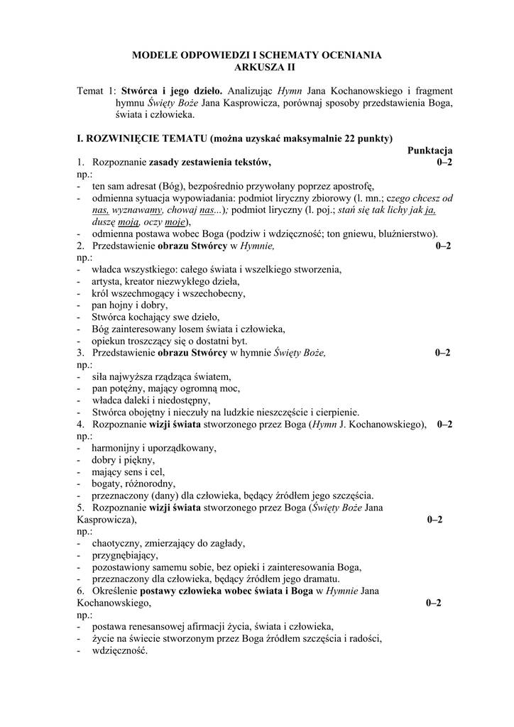 MODELE ODPOWIEDZI I SCHEMATY OCENIANIA ARKUSZA II Temat 1: Stwórca i jego dzieło. Analizując Hymn Jana Kochanowskiego i fragment hymnu Święty Boże Jana Kasprowicza, porównaj sposoby przedstawienia Boga, świata i człowieka. I. ROZWINIĘCIE TEMATU (można uzyskać maksymalnie 22 punkty) Punktacja 1. Rozpoznanie zasady zestawienia tekstów, 0–2 np.: - ten sam adresat (Bóg), bezpośrednio przywołany poprzez apostrofę, - odmienna sytuacja wypowiadania: podmiot liryczny zbiorowy (l. mn.; czego chcesz od nas, wyznawamy, chowaj nas...); podmiot liryczny (l. poj.; stań się tak lichy jak ja, duszę moją, oczy moje), - odmienna postawa wobec Boga (podziw i wdzięczność; ton gniewu, bluźnierstwo). 2. Przedstawienie obrazu Stwórcy w Hymnie, 0–2 np.: - władca wszystkiego: całego świata i wszelkiego stworzenia, - artysta, kreator niezwykłego dzieła, - król wszechmogący i wszechobecny, - pan hojny i dobry, - Stwórca kochający swe dzieło, - Bóg zainteresowany losem świata i człowieka, - opiekun troszczący się o dostatni byt. 3. Przedstawienie obrazu Stwórcy w hymnie Święty Boże, 0–2 np.: - siła najwyższa rządząca światem, - pan potężny, mający ogromną moc, - władca daleki i niedostępny, - Stwórca obojętny i nieczuły na ludzkie nieszczęście i cierpienie. 4. Rozpoznanie wizji świata stworzonego przez Boga (Hymn J. Kochanowskiego), 0–2 np.: - harmonijny i uporządkowany, - dobry i piękny, - mający sens i cel, - bogaty, różnorodny, - przeznaczony (dany) dla człowieka, będący źródłem jego szczęścia. 5. Rozpoznanie wizji świata stworzonego przez Boga (Święty Boże Jana Kasprowicza), 0–2 np.: - chaotyczny, zmierzający do zagłady, - przygnębiający, - pozostawiony samemu sobie, bez opieki i zainteresowania Boga, - przeznaczony dla człowieka, będący źródłem jego dramatu. 6. Określenie postawy człowieka wobec świata i Boga w Hymnie Jana Kochanowskiego, 0–2 np.: - postawa renesansowej afirmacji życia, świata i człowieka, - życie na świecie stworzonym przez Boga źródłem szczęścia i radości, - wdzięczność. 7. Określenie postawy człowieka wobec świata i Boga w hymnie Święty Boże J. Kasprowicza, 0–2 np.: - gniew i bunt, - oskarżenie Boga o zło panujące na świecie, - świadomość porzucenia i zapomnienia. 8. Określenie struktury artystycznej Hymnu J. Kochanowskiego, 0–2 np.: - wersyfikacja, np. wiersz sylabiczny, regularny, rymy, - środki artystyczne, np. apostrofa, anafory, pytania retoryczne, epitety, peryfrazy, - kontynuacja tradycji hymnicznej, - postawa podmiotu mówiącego typowa dla epoki, np. obiektywizm, dystans, szacunek. 9. Określenie struktury artystycznej hymnu Święty Boże J. Kasprowicza, 0–2 np.: - wersyfikacja, np. wiersz wolny emocjonalny, nieregularny, rymy, - środki artystyczne, np. apostrofy, anafory, peryfrazy, wykrzyknienia, symbole, słownictwo w funkcji ekspresyjnej, - postawa podmiotu mówiącego typowa dla epoki, np. subiektywizm, brak dystansu, ton bluźnierczy, ironia, - „przełamywanie wzorca” gatunkowego hymnu. 10. Sformułowanie pełnego wniosku, 4 np.: - określenie podobieństwa między obrazami Boga i świata, - wyjaśnienie różnic, np. wskazanie indywidualnego wymiaru „wadzenia się z Bogiem” Kasprowicza oraz uniwersalnej wymowy postawy Kochanowskiego, - uzasadnienie różnic kontekstem epoki, ewentualnie kontekstem biograficznym, - wskazanie renesansowego optymizmu i młodopolskiego pesymizmu wynikających z filozofii epok. 11. Sformułowanie wniosku częściowego, 2 np.: - odmienna wizja Boga, świata i człowieka, - uzasadnienie różnic: wykorzystanie wiedzy o epokach. 12. Podjęcie próby wnioskowania, 1 np.: - dwie różne wizje Boga i świata. Temat 2: Jednostka w świecie ograniczeń. Analizując zachowania bohaterów zwierzęcych oraz ukształtowanie językowe podanego fragmentu, odczytaj metaforyczny sens sceny i jej związek z przesłaniem powieści Zofii Nałkowskiej Granica. I. ROZWINIĘCIE TEMATU (można uzyskać maksymalnie 22 punkty) Punktacja Rozpoznanie sytuacji bohaterów zwierzęcych 1. Sytuacja i zachowanie Fitka, 0–4 np.: - pies podwórzowy, - ograniczenie przestrzeni życiowej (buda, linia drutu, niewola), - każdorazowe bolesne rozpoznawanie kresu własnych, życiowych możliwości (nieświadomy własnych ograniczeń), - monotonia, jałowość egzystencji, - wrogie nastawienie do obcych, nieufność, - zapominanie o ograniczeniu, jakim jest łańcuch, - zaspokojenie głodu dające poczucie szczęścia; okazuje wdzięczność, - przejawy krótkotrwałej radości podczas zabawy z Lulu. 2. Sytuacja i zachowanie Lulu, 0–4 np.: - pies domowy niedoświadczający ograniczeń, - zabawy z Fitkiem przejawem kaprysu, - zachowywanie dystansu, - poczucie przynależnej mu niezależności i swobody, - ignorowanie potrzeb Fitka. 3. Odczytanie zachowania innych bohaterów (ludzi) na sytuację psa 0–1 np.: - brak zrozumienia sytuacji psa przez innych (pies podwórzowy ma pilnować obejścia, pogodził się ze swoim losem, najlepiej jest mu na łańcuchu). 4. Odczytanie metaforycznych sensów tekstu i ich związku z problematyką powieści, 0-4 np.: - usytuowanie sceny w początkowej części powieści zapowiedzią problematyki utworu, - Fitek nie może przekroczyć granicy, podobnie jak bohaterowie powieści, - sytuacja Fitka ilustracją losu ludzi z nizin społecznych – są metaforą postaw ludzi ograniczonych w swojej wolności, - sytuacja Lulu metaforą postaw ludzi wolnych, - symbolika drutu, łańcucha (ograniczenia zdeterminowane przynależnością). 5. Charakterystyka ukształtowania językowego fragmentu, 0–4 np.: - realistyczny opis bohaterów zwierzęcych, - słownictwo akcentujące monotonię życia (np. obojętnie, nieruchomo, apatycznie, jednostajne, jałowe; epitety – znudzony, tęskny, rozpaczający, błagalne jęki, skowytliwe szczeknięcia, gniew daremny), - wyliczenie czasowników wskazujące na beznadziejność