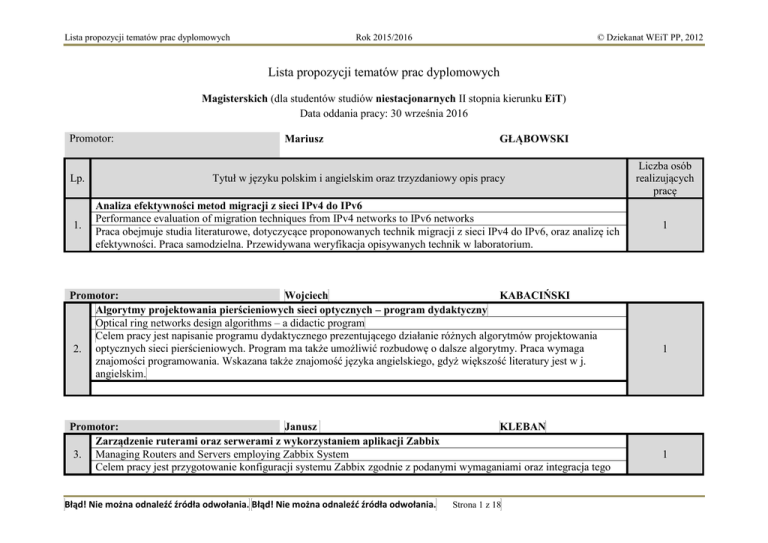 Lista propozycji tematów prac dyplomowych © Dziekanat WEiT PP, 2012 Rok 2015/2016 Lista propozycji tematów prac dyplomowych Magisterskich (dla studentów studiów niestacjonarnych II stopnia kierunku EiT) Data oddania pracy: 30 września 2016 Promotor: Mariusz GŁĄBOWSKI Lp. Tytuł w języku polskim i angielskim oraz trzyzdaniowy opis pracy Liczba osób realizujących pracę 1. Analiza efektywności metod migracji z sieci IPv4 do IPv6 Performance evaluation of migration techniques from IPv4 networks to IPv6 networks Praca obejmuje studia literaturowe, dotyczycące proponowanych technik migracji z sieci IPv4 do IPv6, oraz analizę ich efektywności. Praca samodzielna. Przewidywana weryfikacja opisywanych technik w laboratorium. 1 Promotor: Wojciech KABACIŃSKI Algorytmy projektowania pierścieniowych sieci optycznych – program dydaktyczny Optical ring networks design algorithms – a didactic program Celem pracy jest napisanie programu dydaktycznego prezentującego działanie różnych algorytmów projektowania 2. optycznych sieci pierścieniowych. Program ma także umożliwić rozbudowę o dalsze algorytmy. Praca wymaga znajomości programowania. Wskazana także znajomość języka angielskiego, gdyż większość literatury jest w j. angielskim. Promotor: Janusz KLEBAN Zarządzenie ruterami oraz serwerami z wykorzystaniem aplikacji Zabbix 3. Managing Routers and Servers employing Zabbix System Celem pracy jest przygotowanie konfiguracji systemu Zabbix zgodnie z podanymi wymaganiami oraz integracja tego Błąd! Nie można odnaleźć źródła odwołania. Błąd! Nie można odnaleźć źródła odwołania. Strona 1 z 18 1 1 Lista propozycji tematów prac dyplomowych 4. © Dziekanat WEiT PP, 2012 Rok 2015/2016 systemu z aplikacją pozwalającą na rozsyłanie zawiadomień o problemach wykrytych w sieci. Praca wymaga napisania skryptów konfiguracyjnych. Protokoły routingu – prezentacja dydaktyczna Routing Protocols – Didactic Presentation Praca obejmuje przygotowanie prezentacji dydaktycznej zawierającej informacje na temat protokołów routingu stosowanych w sieciach IP. Prezentacja musi zawierać elementy animacji obrazujących funkcjonowanie protokołów routingu. Promotor: Maciej SOBIERAJ IPSec w systemach Linux IPSec in Linux 5. Tematyka pracy obejmuje zastosowanie protokołu IPSec do tworzenia bezpiecznych połączeń w publicznej sieci Internet. Student powinien zaproponować odpowiednią dystrybucję systemu Linux, która będzie umożliwiała realizację takich połączeń, a także zaproponować odpowiednią konfigurację systemu. Projektowanie sieci bezprzewodowych Designing of wireless networks 6. Tematyka pracy obejmuje przegląd narzędzi umożliwiających projektowanie sieci bezprzewodowych oraz zaproponowanie i przeprowadzenie pomiarów w zbudowanej przez studenta sieci w celu weryfikacji opisywanych narzędzi. Mariusz ŻAL Promotor: Ocena topologii sieci w centrach danych Evaluation of data center network topologies 7. Celem pracy jest ocena różnych topologii sieci w centrach danych. Główne kryteria oceny to wydajność, koszt budowy i zużycie energii. Ocena powinna również uwzględniać dostępne typy mediów transmisyjnych. Praca przeglądowa. Ocena zużycia energii elektrycznej w procesorach ARM Evaluation of energy consumption of ARM processors 8. Praca o charakterze konstrukcyjnym/projektowym. Celem pracy jest zaproponowanie metod pomiaru zużycia energii elektrycznej w procesorach ARM w trakcie wykonywania różnych programu napisanego w C++ (instrukcje Błąd! Nie można odnaleźć źródła odwołania. Błąd! Nie można odnaleźć źródła odwołania. Strona 2 z 18 1 1 1 1 1 Lista propozycji tematów prac dyplomowych 9. © Dziekanat WEiT PP, 2012 Rok 2015/2016 arytmetyczne, logiczne, wyboru, pętle. Ocena może być dokonana w sposób analityczny lub doświadczalny. Zastosowanie odnawialnych źródeł energii w sieciach telekomunikacyjnych Renewable energy sources usage in telecommunication networks Celem pracy jest zaproponowanie elementów sieci telekomunikacyjnej, które mogą być zasilane przez odnawialne źródła energii. Celowość takiego zasilania powinna być uzasadniona pod względem ekonomicznym i technologicznym. Praca ma charakter przeglądowy/koncepcyjny. Błąd! Nie można odnaleźć źródła odwołania. Błąd! Nie można odnaleźć źródła odwołania. Strona 3 z 18 1 Lista propozycji tematów prac dyplomowych © Dziekanat WEiT PP, 2012 Rok 2015/2016 Lista propozycji tematów prac dyplomowych Magisterskich (dla studentów studiów stacjonarnych II stopnia kierunku EiT) Data oddania pracy: 30 czerwca 2016 Promotor: Lp. 1. 2. Błąd! Nie można odnaleźć źródła odwołania. DANILEWICZ Tytuł w języku polskim i angielskim oraz trzyzdaniowy opis pracy Protokół rutingu dla połączeń rozgłoszeniowych z ograniczeniami Routing protocol for limited multicast connections Praca przeglądowo/teoretyczna/konstrukcyjna. Magistrant powinien mieć wiedzę o działaniu sieci komputerowych oraz protokołach ruringu. Wymagana jest umiejętność myślenia algorytmicznego, dobra znajomość technicznego języka angielskiego i dobra znajomość przynajmniej jednego języka programowania wyższego rzędu. Realizacja w polach komutacyjnych połączeń rozgłoszeniowych z ograniczeniami. Switching fabrics for limited multicast connections Praca przeglądowo/teoretyczna/konstrukcyjna. Magistrant powinien mieć wiedzę o działaniu węzłów sieci. Wymagana jest umiejętność myślenia algorytmicznego, dobra znajomość technicznego języka angielskiego i dobra znajomość przynajmniej jednego języka programowania wyższego rzędu. Mariusz GŁĄBOWSKI Promotor: Analiza mechanizmów pionowego przenoszenia połączeń w heterogenicznych sieciach komórkowych 4G Vertical handovers in heterogeneous 4g cellular networks 3. Praca wymagająca studiów literaturowych (algorytmy dla pionowego przenoszenia połączeń) oraz opracowania symulatora s