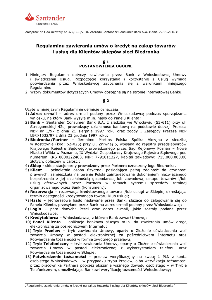 Załącznik nr 1 do Uchwały nr 372/SCB/2016 Zarządu Santander Consumer Bank S.A. z dnia 29.11.2016 r. Regulaminu zawierania umów o kredyt na zakup towarów i usług dla Klientów sklepów sieci Biedronka §1 POSTANOWIENIA OGÓLNE 1. Niniejszy Regulamin dotyczy zawierania przez Bank z Wnioskodawcą Umowy i świadczenia Usług. Rozpoczęcie korzystania i korzystanie z Usług wymaga potwierdzenia przez Wnioskodawcę zapoznania się z warunkami niniejszego Regulaminu. 2. Wzory dokumentów dotyczących Umowy dostępne są na stronie internetowej Banku. §2 Użyte w niniejszym Regulaminie definicje oznaczają: 1) Adres e-mail – adres e-mail podany przez Wnioskodawcę podczas sporządzania wniosku, na który Bank wysyła m.in. hasło do Panelu Klienta; 2) Bank – Santander Consumer Bank S.A. z siedzibą we Wrocławiu (53-611) przy ul. Strzegomskiej 42c, prowadzący działalność bankową na podstawie decyzji Prezesa NBP nr 3/97 z dnia 21 sierpnia 1997 roku oraz zgody I Zastępcy Prezesa NBP LB/I/1532/97 z dnia 23 grudnia 1997 roku; 3) Biedronka/Partner - Jeronimo Martins Polska Spółka Akcyjna z siedzibą w Kostrzynie (kod: 62-025) przy ul. Żniwnej 5, wpisana do rejestru przedsiębiorców Krajowego Rejestru Sądowego prowadzonego przez Sąd Rejonowy Poznań – Nowe Miasto i Wilda w Poznaniu, IX Wydział Gospodarczy Krajowego Rejestru Sądowego pod numerem KRS 0000222483, NIP: 7791011327, kapitał zakładowy: 715.000.000,00 złotych, opłacony w całości; 4) Sklep - sklep stacjonarny prowadzony przez Partnera oznaczony logo Biedronka, 5) Klient – pełnoletnia osoba fizyczna, posiadająca pełną zdolność do czynności prawnych, zamieszkała na terenie Polski zainteresowana dokonaniem niezwiązanego bezpośrednio z jej działalnością gospodarczą lub zawodową zakupu towarów i/lub usług oferowanych przez Partnera w ramach systemu sprzedaży ratalnej organizowanego przez Bank (konsument); 6) Rezerwacja – rezerwacja kredytowanego towaru i/lub usługi w Sklepie, określająca termin dostępności kredytowanego towaru i/lub usługi; 7) Hasło – jednorazowe hasło nadawane przez Bank, służące do zalogowania się do Panelu Klienta, przesyłane przez Bank na adres e-mail podany przez Wnioskodawcę; 8) Login – para danych: Pesel oraz adres e-mail, jakie zostały podane przez Wnioskodawcę; 9) Kredytobiorca – Wnioskodawca, z którym Bank zawarł Umowę; 10) Panel Klienta – aplikacja bankowa służąca m.in. do zawierania umów drogą elektroniczną za pośrednictwem Internetu; 11) Tryb Przelew – tryb zawierania Umowy, oparty o Złożenie oświadczenia woli zawarcia Umowy w postaci elektronicznej za pośrednictwem Internetu oraz Potwierdzenie tożsamości w formie zwrotnego przelewu; 12) Tryb Telefoniczny – tryb zawierania Umowy, oparty o Złożenie oświadczenia woli zawarcia Umowy w postaci elektronicznej z wykorzystaniem telefonu oraz Potwierdzenie tożsamości w Sklepie; 13) Potwierdzenie tożsamości – przelew weryfikacyjny na kwotę 1 PLN z konta osobistego Wnioskodawcy - w przypadku trybu Przelew, albo weryfikacja tożsamości przez pracownika Partnera poprzez okazanie ważnego dowodu osobistego – w Trybie Telefonicznym, umożliwiające Bankowi weryfikację tożsamości Wnioskodawcy; „Regulaminu zawierania umów o kredyt na zakup towarów i usług dla Klientów sklepów sieci Biedronka” Załącznik nr 1 do Uchwały nr 372/SCB/2016 Zarządu Santander Consumer Bank S.A. z dnia 29.11.2016 r. 14) Przelew zwrotny – automatyczny przelew zwrotny od operatora płatności, przekazany na rachunek, z którego wpłynął przelew weryfikacyjny; 15) Regulamin – niniejszy Regulamin zawierania umowy o kredyt na zakup towarów i usług dla Klientów sklepów sieci Biedronka; 16) Strona internetowa Banku – strona internetowa o adresie www.santanderconsumer.pl.; 17) Umowa – umowa o kredyt na zakup towarów i usług oferowanych przez Partnera, zawierana w Trybie Przelew lub w Trybie Telefonicznym; 18) Usługi: a) świadczone przez Bank drogą elektroniczną za pośrednictwem Internetu – zakres Usług obejmuje: udostępnianie możliwości wnioskowania o kredyt na zakup towarów i/lub usług Partnera oraz zawarcia Umowy za pośrednictwem Internetu w Panelu Klienta, b) świadczone przez Bank drogą elektroniczną z wykorzystaniem telefonu – zakres Usług obejmuje: udostępnianie możliwości wnioskowania o kredyt na zakup towarów i/lub usług Partnera oraz złożenia oświadczenia woli zawarcia Umowy podczas rozmowy telefonicznej Wnioskodawcy z pracownikiem Banku; 19) Wnioskodawca – osoba fizyczna ubiegająca się o zawarcie Umowy z Bankiem; 20) Złożenie oświadczenia woli zawarcia Umowy w postaci elektronicznej za pośrednictwem Internetu – potwierdzenie woli zawarcia przez Wnioskodawcę Umowy w formie elektronicznej, zgodnie z przepisem art. 7 ustawy z dnia 29 sierpnia 1997 r. – Prawo bankowe, poprzez kliknięcie przycisku potwierdzającego złożenie oświadczenia woli o zawarciu Umowy w Panelu Klienta; 21) Złożenie oświadczenia woli zawarcia Umowy w postaci elektronicznej z wykorzystaniem telefonu – potwierdzenie woli zawarcia przez Wnioskodawcę Umowy w formie elektronicznej, zgodnie z przepisem art. 7 ustawy z dnia 29 sierpnia 1997 r. – Prawo bankowe, poprzez złożenie oświadczenia woli o zawarciu Umowy podczas rozmowy telefonicznej Wnioskodawcy z pracownikiem Banku. § 3. WARUNKI KORZYSTANIA Z USŁUG, W TYM ZAWIERANIA UMÓW 1. Z Usług może korzystać wyłącznie Wnioskodawca lub Kredytobiorca. 2. Zawarcie Umowy w Trybie Przelew lub w Trybie Telefonicznym i świadczenie Usług następuje na wniosek Wnioskodawcy. Zawarcie Umowy w Trybie Przelew i w Trybie Telefonicznym następuję pod warunkiem zawieszającym, o którym mowa w § 3 odpowiednio ust. 4 pkt 6 oraz pkt 8 lub ust. 5 pkt 5 Regulaminu. Niespełnienie warunku zawieszającego, o którym mowa w zdaniu poprzedzającym skutkuje uznaniem Umowy za niezawartą. Umowa zawarta w Trybie Przele