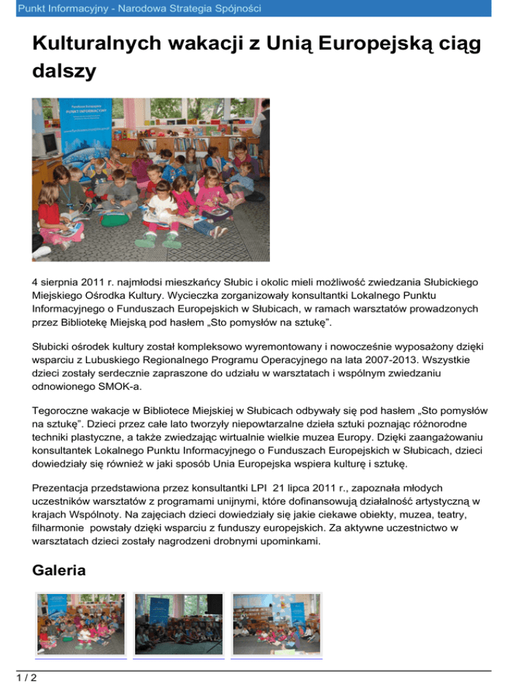 Punkt Informacyjny - Narodowa Strategia Spójności Kulturalnych wakacji z Unią Europejską ciąg dalszy 4 sierpnia 2011 r. najmłodsi mieszkańcy Słubic i okolic mieli możliwość zwiedzania Słubickiego Miejskiego Ośrodka Kultury. Wycieczka zorganizowały konsultantki Lokalnego Punktu Informacyjnego o Funduszach Europejskich w Słubicach, w ramach warsztatów prowadzonych przez Bibliotekę Miejską pod hasłem „Sto pomysłów na sztukę”. Słubicki ośrodek kultury został kompleksowo wyremontowany i nowocześnie wyposażony dzięki wsparciu z Lubuskiego Regionalnego Programu Operacyjnego na lata 2007-2013. Wszystkie dzieci zostały serdecznie zapraszone do udziału w warsztatach i wspólnym zwiedzaniu odnowionego SMOK-a. Tegoroczne wakacje w Bibliotece Miejskiej w Słubicach odbywały się pod hasłem „Sto pomysłów na sztukę”. Dzieci przez całe lato tworzyły niepowtarzalne dzieła sztuki poznając różnorodne techniki plastyczne, a także zwiedzając wirtualnie wielkie muzea Europy. Dzięki zaangażowaniu konsultantek Lokalnego Punktu Informacyjnego o Funduszach Europejskich w Słubicach, dzieci dowiedziały się również w jaki sposób Unia Europejska wspiera kulturę i sztukę. Prezentacja przedstawiona przez konsultantki LPI 21 lipca 2011 r., zapoznała młodych uczestników warsztatów z programami unijnymi, które dofinansowują działalność artystyczną w krajach Wspólnoty. Na zajęciach dzieci dowiedziały się jakie ciekawe obiekty, muzea, teatry, filharmonie powstały dzięki wsparciu z funduszy europejskich. Za aktywne uczestnictwo w warsztatach dzieci zostały nagrodzeni drobnymi upominkami. Galeria 1/2 Punkt Informacyjny - Narodowa Strategia Spójności 2/2