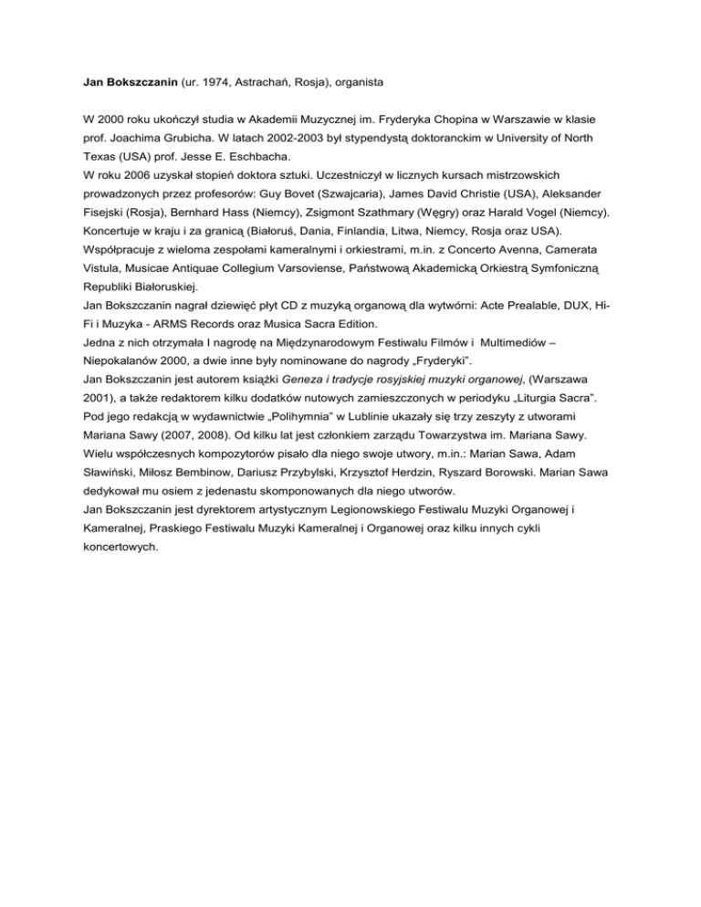 Jan Bokszczanin (ur. 1974, Astrachań, Rosja), organista W 2000 roku ukończył studia w Akademii Muzycznej im. Fryderyka Chopina w Warszawie w klasie prof. Joachima Grubicha. W latach 2002-2003 był stypendystą doktoranckim w University of North Texas (USA) prof. Jesse E. Eschbacha. W roku 2006 uzyskał stopień doktora sztuki. Uczestniczył w licznych kursach mistrzowskich prowadzonych przez profesorów: Guy Bovet (Szwajcaria), James David Christie (USA), Aleksander Fisejski (Rosja), Bernhard Hass (Niemcy), Zsigmont Szathmary (Węgry) oraz Harald Vogel (Niemcy). Koncertuje w kraju i za granicą (Białoruś, Dania, Finlandia, Litwa, Niemcy, Rosja oraz USA). Współpracuje z wieloma zespołami kameralnymi i orkiestrami, m.in. z Concerto Avenna, Camerata Vistula, Musicae Antiquae Collegium Varsoviense, Państwową Akademicką Orkiestrą Symfoniczną Republiki Białoruskiej. Jan Bokszczanin nagrał dziewięć płyt CD z muzyką organową dla wytwórni: Acte Prealable, DUX, HiFi i Muzyka - ARMS Records oraz Musica Sacra Edition. Jedna z nich otrzymała I nagrodę na Międzynarodowym Festiwalu Filmów i Multimediów – Niepokalanów 2000, a dwie inne były nominowane do nagrody „Fryderyki”. Jan Bokszczanin jest autorem ksiąŜki Geneza i tradycje rosyjskiej muzyki organowej, (Warszawa 2001), a takŜe redaktorem kilku dodatków nutowych zamieszczonych w periodyku „Liturgia Sacra”. Pod jego redakcją w wydawnictwie „Polihymnia” w Lublinie ukazały się trzy zeszyty z utworami Mariana Sawy (2007, 2008). Od kilku lat jest członkiem zarządu Towarzystwa im. Mariana Sawy. Wielu współczesnych kompozytorów pisało dla niego swoje utwory, m.in.: Marian Sawa, Adam Sławiński, Miłosz Bembinow, Dariusz Przybylski, Krzysztof Herdzin, Ryszard Borowski. Marian Sawa dedykował mu osiem z jedenastu skomponowanych dla niego utworów. Jan Bokszczanin jest dyrektorem artystycznym Legionowskiego Festiwalu Muzyki Organowej i Kameralnej, Praskiego Festiwalu Muzyki Kameralnej i Organowej oraz kilku innych cykli koncertowych.