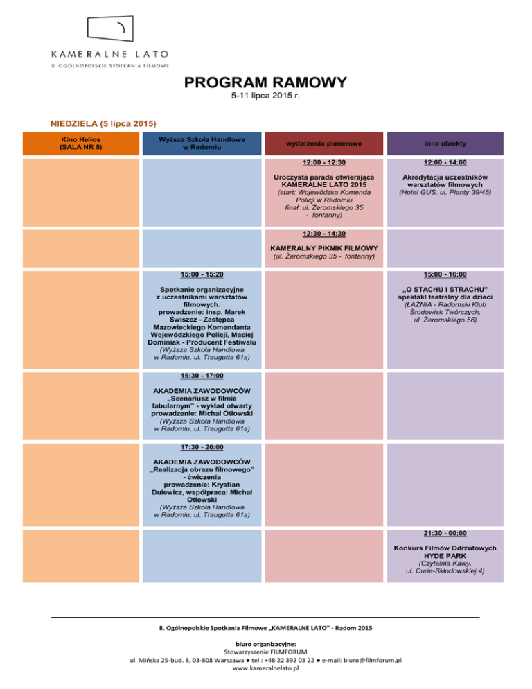 PROGRAM RAMOWY 5-11 lipca 2015 r. NIEDZIELA (5 lipca 2015) Kino Helios (SALA NR 5) Wyższa Szkoła Handlowa w Radomiu wydarzenia plenerowe inne obiekty 12:00 - 12:30 12:00 - 14:00 Uroczysta parada otwierająca KAMERALNE LATO 2015 (start: Wojewódzka Komenda Policji w Radomiu finał: ul. Żeromskiego 35 - fontanny) Akredytacja uczestników warsztatów filmowych (Hotel GUS, ul. Planty 39/45) 12:30 - 14:30 KAMERALNY PIKNIK FILMOWY (ul. Żeromskiego 35 - fontanny) 15:00 - 15:20 15:00 - 16:00 Spotkanie organizacyjne z uczestnikami warsztatów filmowych. prowadzenie: insp. Marek Świszcz - Zastępca Mazowieckiego Komendanta Wojewódzkiego Policji, Maciej Dominiak - Producent Festiwalu (Wyższa Szkoła Handlowa w Radomiu, ul. Traugutta 61a) „O STACHU I STRACHU” spektakl teatralny dla dzieci (ŁAŹNIA - Radomski Klub Środowisk Twórczych, ul. Żeromskiego 56) 15:30 - 17:00 AKADEMIA ZAWODOWCÓW „Scenariusz w filmie fabularnym” - wykład otwarty prowadzenie: Michał Otłowski (Wyższa Szkoła Handlowa w Radomiu, ul. Traugutta 61a) 17:30 - 20:00 AKADEMIA ZAWODOWCÓW „Realizacja obrazu filmowego” - ćwiczenia prowadzenie: Krystian Dulewicz, współpraca: Michał Otłowski (Wyższa Szkoła Handlowa w Radomiu, ul. Traugutta 61a) 21:30 - 00:00 Konkurs Filmów Odrzutowych HYDE PARK (Czytelnia Kawy, ul. Curie-Skłodowskiej 4) 8. Ogólnopolskie Spotkania Filmowe „KAMERALNE LATO” - Radom 2015 biuro organizacyjne: Stowarzyszenie FILMFORUM ul. Mińska 25-bud. 8, 03-808 Warszawa ● tel.: +48 22 392 03 22 ● e-mail: [email protected] www.kameralnelato.pl PONIEDZIAŁEK (6 lipca 2015) Kino Helios (SALA NR 5) Wyższa Szkoła Handlowa w Radomiu wydarzenia plenerowe 11:00 - 12:00 ŚNIADANIE PRASOWE - spotkanie z dziennikarzami goście: opiekunowie artystyczni warsztatów, organizatorzy (Kawiarnia "Na fontannach", ul. Żeromskiego 35) 12:30 - 14:00 AKADEMIA ZAWODOWCÓW „Reżyseria filmowa” - wykład otwarty prowadzenie: Grzegorz Jaroszuk (Wyższa Szkoła Handlowa w Radomiu, ul. Traugutta 61a) 14:30 - 19:00 PLENER ZDJĘCIOWY prowadzenie: Krystian Dulewicz, współpraca: Grzegorz Jaroszuk, Michał Otłowski (Pałac Domaniowski Konary 8, Wieniawa) 20:00 - 22:00 Scenariusz Filmowy - konsultacje opieka artystyczna: Grzegorz Jaroszuk, Michał Otłowski (Wyższa Szkoła Handlowa w Radomiu, ul. Traugutta 61a) 22:15 - 23:50 NIEBO NAD RADOMIEM *** - plenerowe pokazy filmowe „JEZIORAK” (94 min.) reż. Michał Otłowski (ul. Żeromskiego 35 - fontanny) 8. Ogólnopolskie Spotkania Filmowe „KAMERALNE LATO” - Radom 2015 biuro organizacyjne: Stowarzyszenie FILMFORUM ul. Mińska 25-bud. 8, 03-808 Warszawa ● tel.: +48 22 392 03 22 ● e-mail: [email protected] www.kameralnelato.pl inne obiekty WTOREK (7 lipca 2015) Kino Helios (SALA NR 5) Wyższa Szkoła Handlowa w Radomiu wydarzenia plenerowe inne obiekty 10:00 - 11:00 Konsultacje techniczne i merytoryczne dla uczestników warsztatów, realizowane na terenie Komendy Wojewódzkiej Policji z siedzibą w Radomiu (Komenda Wojewódzka Policji z siedzibą w Radomiu, ul. 11-go Listopada 37/59) 11:30 - 15:00 Scenariusz Filmowy - konsultacje opieka artystyczna: Grzegorz Jaroszuk, Michał Otłowski (Wyższa Szkoła Handlowa w Radomiu, ul. Traugutta 61a) 16:00 - 21:00 REALIZACJA SCEN SPECJALNYCH warsztat praktyczny z udziałem jednostek specjalnych Komendy Wojewódzkiej Policji (Plac Konstytucji 3 Maja 5) 21:30 - 22:30 KINO NIEME Z MUZYKĄ NA ŻYWO (ŁAŹNIA - Radomski Klub Środowisk Twórczych, ul. Żeromskiego 56) 8. Ogólnopolskie Spotkania Filmowe „KAMERALNE LATO” - Radom 2015 biuro organizacyjne: Stowarzyszenie FILMFORUM ul. Mińska 25-bud. 8, 03-808 Warszawa ● tel.: +48 22 392 03 22 ● e-mail: [email protected] www.kameralnelato.pl ŚRODA (8 lipca 2015) Wyższa Szkoła Handlowa w Radomiu Kino Helios (SALA NR 5) wydarzenia plenerowe inne obiekty 10:00 Realizacja zdjęć do etiud filmowych opieka artystyczna: Grzegorz Jaroszuk, Michał Otłowski (Radom) 16:00 - 17:30 AKADEMIA ZAWODOWCÓW Anna Mucha - wykład otwarty (Wyższa Szkoła Handlowa w Radomiu, ul. Traugutta 61a) 18.00 - 19:50 KONKURS FILMÓW NIEZALEŻNYCH - I projekcja (Kino HELIOS, ul. Poniatowskiego 5) 20.10 - 22:00 KONKURS FILMÓW NIEZALEŻNYCH - II projekcja (Kino HELIOS, ul. Poniatowskiego 5) 22:15 - 23:30 22:30 - 00:30 NIEBO NAD RADOMIEM *** - plenerowe pokazy filmowe „KEBAB I HOROSKOP” (72 min.) reż. Grzegorz Jaroszuk (ul. Żeromskiego 35 - fontanny) KLUB FESTIWALOWY impreza dla akredytowanych gości (Restauracja Green Zebra, ul. Focha 12) 8. Ogólnopolskie Spotkania Filmowe „KAMERALNE LATO” - Radom 2015 biuro organizacyjne: Stowarzyszenie FILMFORUM ul. Mińska 25-bud. 8, 03-808 Warszawa ● tel.: +48 22 392 03 22 ● e-mail: [email protected] www.kameralnelato.pl CZWARTEK (9 lipca 2015) Wyższa Szkoła Handlowa w Radomiu Kino Helios (SALA NR 5) wydarzenia plenerowe inne obiekty 9:00 - 10:10 10:00 KAMERALNE LATO DZIECIOM - I projekcja (Kino HELIOS, ul. Poniatowskiego 5) Realizacja zdjęć do etiud filmowych opieka artystyczna: Grzegorz Jaroszuk, Michał Otłowski (Radom) 10:30 - 12:40 11:00 - 13:30 KAMERALNE LATO DZIECIOM - warsztaty Fundacji LEGALNA KULTURA (Kino HELIOS, ul. Poniatowskiego 5) Szkolenie JAK POZYSKIWAĆ ŚRODKI Z UNII EUROPEJSKIEJ? NAJLEPSZE PRAKTYKI, PROMOCJA (Wyższa Szkoła Handlowa w Radomiu, ul. Traugutta 61a) 13:00 - 14:10 14:00 - 15:30 KAMERALNE LATO DZIECIOM - II projekcja (Kino HELIOS, ul. Poniatowskiego 5) AKADEMIA ZAWODOWCÓW „Montaż jako środek wyrazu w filmie” - wykład otwarty prowadzenie: Agnieszka Glińska (Wyższa Szkoła Handlowa w Radomiu, ul. Traugutta 61a) 16:00 - 16:50 FASHION FILM - przegląd filmów modowych (Kino HELIOS, ul. Poniatowskiego 5) 17:00 - 19:20 KONKURS GŁÓWNY - I projekcja Spotkanie z Jury Konkursu Głównego. (Kino HELIOS, ul. Poniatowskiego 5) 19:50 - 22:10 KONKURS GŁÓWNY - II projekcja Spotkanie z Jury Konkursu Głównego. (Kino HELIOS, ul. Poniatowskiego 5) 22:15 - 23:50 22:30 - 00:30 NIEBO NAD RADOMIEM *** -