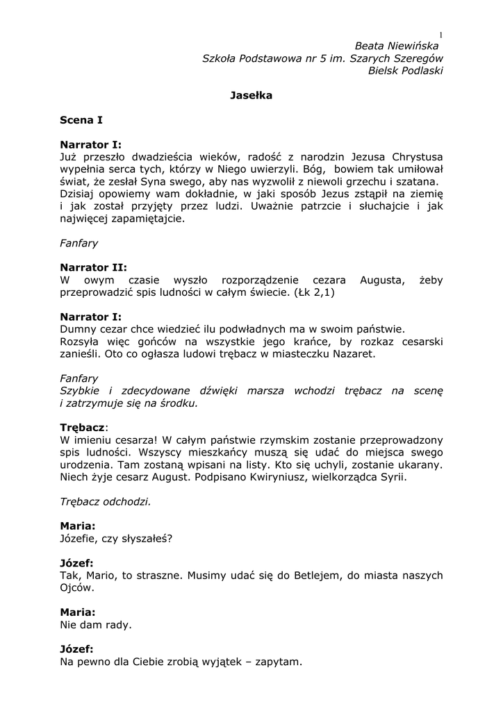 1 Beata Niewińska Szkoła Podstawowa nr 5 im. Szarych Szeregów Bielsk Podlaski Jasełka Scena I Narrator I: Już przeszło dwadzieścia wieków, radość z narodzin Jezusa Chrystusa wypełnia serca tych, którzy w Niego uwierzyli. Bóg, bowiem tak umiłował świat, że zesłał Syna swego, aby nas wyzwolił z niewoli grzechu i szatana. Dzisiaj opowiemy wam dokładnie, w jaki sposób Jezus zstąpił na ziemię i jak został przyjęty przez ludzi. Uważnie patrzcie i słuchajcie i jak najwięcej zapamiętajcie. Fanfary Narrator II: W owym czasie wyszło rozporządzenie cezara przeprowadzić spis ludności w całym świecie. (Łk 2,1) Augusta, żeby Narrator I: Dumny cezar chce wiedzieć ilu podwładnych ma w swoim państwie. Rozsyła więc gońców na wszystkie jego krańce, by rozkaz cesarski zanieśli. Oto co ogłasza ludowi trębacz w miasteczku Nazaret. Fanfary Szybkie i zdecydowane dźwięki marsza wchodzi trębacz na scenę i zatrzymuje się na środku. Trębacz: W imieniu cesarza! W całym państwie rzymskim zostanie przeprowadzony spis ludności. Wszyscy mieszkańcy muszą się udać do miejsca swego urodzenia. Tam zostaną wpisani na listy. Kto się uchyli, zostanie ukarany. Niech żyje cesarz August. Podpisano Kwiryniusz, wielkorządca Syrii. Trębacz odchodzi. Maria: Józefie, czy słyszałeś? Józef: Tak, Mario, to straszne. Musimy udać się do Betlejem, do miasta naszych Ojców. Maria: Nie dam rady. Józef: Na pewno dla Ciebie zrobią wyjątek – zapytam. 2 Józef idzie do żołnierza. Józef: Hej, żołnierzu, słyszałem rozkaz. Moja żona i ja powinniśmy się udać do Betlejem. Ale to bardzo daleko. Żołnierz: No i co? Każdy musi pójść do swego rodzinnego miasta. Józef: Ale moja żona oczekuje narodzin dziecka. Nie może teraz iść tak daleko. Żołnierz: Każdy może mieć jakąś wymówkę. Rozkaz to rozkaz! Jak się nazywacie? Józef: Ja jestem Józef. Moja żona nazywa się Maryja. Żołnierz: Dlaczego musicie iść właśnie do Betlejem? Józef: Pochodzimy z domu Dawida. Żołnierz: Niewiele z tego po was widać? Józef: Wygląd zewnętrzny się nie liczy. Bóg patrzy w serce. Żołnierz: To mnie nie obchodzi. Rozkaz jest rozkazem. Józef i Maryja odchodzą. Scena II Narrator II: Podążali więc wszyscy, aby się dać zapisać, każdy do swojego miasta. Udał się też Józef z Galilei, z miasta Nazaret, do Judei, do miasta Dawidowego zwanego Betlejem, ponieważ pochodził z rodu i domu Dawida, żeby się dać zapisać z poślubioną sobie Maryją, która była brzemienna (Łk 2, 2-5). Maryja z Józefem wchodzą na scenę. Józef: Pewno Ci zimno, drżysz cała, muszę coś znaleźć dla Ciebie, abyś choć trochę się przespała... 3 Maria: Mój Józefie, bardzo jestem słaba, sił już nie mam. Iść nie mogę. Józef: Może tu się zatrzymamy. Już Betlejem, domki z brzegu... Pójdę poszukać noclegu. Zostań, Mario, zaraz wrócę! Słychać kroki, później kołatanie do drzwi i gniewny głos kobiecy. Głos za drzwiami: Kto tam po nocy się włóczy? Hałasuje, ze snu budzi! Józef: Otwórzcie nam, dobrzy ludzie! Dajcie nocleg... nawet w sieni. Jesteśmy bardzo strudzeni. Z Nazaretu daleka droga. Przyjmijcie nas w imię Boga! Głos: Tu nie zajazd, nie gospoda. Izba ciasna... Nie pukajcie na próżno. Józef: Ja gdziekolwiek... Tylko moja żona... Bóg mi oddał ją w opiekę. Ulitujcie się dobrzy ludzie. Głos (ostry i zdecydowany): Powiedziałam „nie” i nie zmienię zdania. Józef powraca. Maria: Cóż, Józefie, odmówili? Józef: Ludziom zabrakło miłości, serca ich jak zimne głazy. Maria: Nie trzeba się na nich złościć! Biedni są... Józef (idzie dalej szukać noclegu, po chwili): Tu zapukam i poproszę, głośno tam, pewnie zabawa. Słychać pukanie do drzwi. Głos za drzwiami: Czego chcecie?... Jaka sprawa? Co za wałęsanie? Józef: Przybyliśmy na spis do Betlejem i szukamy noclegu. Głos: Ach, człowieku. Idźże z Bogiem! W moim domu dziś wesele. Gości wiele, ludzi wiele. Córka wyszła za celnika. Świetna para! Drzwi zamykam. 4 Nie przeszkadzajcie w weselu. Do widzenia. Słychać głośne trzaśnięcie drzwiami, później kroki i po chwili nieśmiałe pukanie do innych drzwi. Józef: W imię Pana zastępów! Otwórzcie drzwi. Człowiek: Co za śmiałość! Jeszcze czego? Józef: Może nocleg tu dostanę?... Człowiek: Jeśli chcecie noclegu, musicie mi zapłacić. A jeśli nie macie pieniędzy, to zmykajcie co prędzej. Człowiek znika. Józef podchodzi do Maryi, która zwrócona w inną stronę nie słyszała rozmowy. Maria: Odmówili?... Nie przyjęli?... Józef: W samolubstwie się zamknęli, ziemia im niebo przesłania. O pieniądzach tylko marzą, o zysku i dobrobycie. Serca ich twarde jak kamień. Maria: Ale Bóg ich nie omija... Kolęda Józef i Maryja wchodzą do stajenki. Przed stajenka stają Aniołowie. Scena III Anioł I: Oto za chwilę ogarną was czasy, tej nocy świętej, tej nocy pamiętnej. Anioł II: Oto za chwilę ujrzą wasze oczy to, co się działo owej dziwnej nocy. Anioł III: Bóg zszedł na ziemię i przyjął Dziecka postać, by dusze ludzkie łaską swą przemieniać. Anioł IV: Bóg zszedł na ziemię, by pośród ludzi na zawsze pozostać. 5 Kolęda Aniołowie odsłaniają stajenkę. Maryja: Zaśnij maleńki, Jezu… Nadejdzie kiedyś godzina, Kiedy Żłóbek się w ołtarz zamieni. Śpij, moja słodka Dziecino, Nim krzyż zgotuje ci ziemia. Kolęda w wykonaniu Maryi Scena IV Narrator II: W tej samej okolicy przebywali pasterze i trzymali straż nocną nad swoją trzodą (Łk 2, 8). Narrator I: Tymczasem noc ciemna okryła Betlejem. Pogasły światła wokoło. Na polu za Betlejem posnęły białe baranki i pastuszkowie też zaraz ułożą się do snu. Nikt nie wie, że tam, w oddali, spełnił się cud nad cudami. Że na ziemię zeszło Boże Dziecię i czeka na hołd ludzkich serc. W mroku wysuwają się Pasterze, kładą się na ziemię, podkładają szaty, kożuchy, by nie było za twardo. 