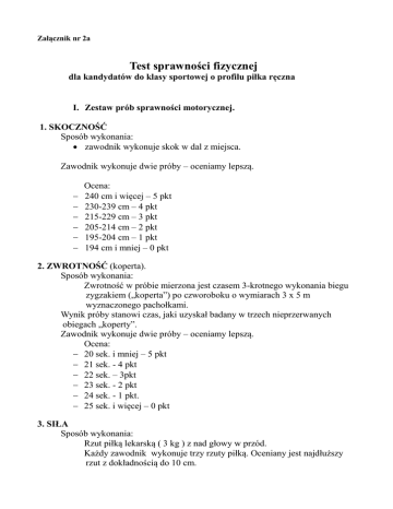 Załącznik nr 2a Test sprawności fizycznej dla kandydatów do klasy sportowej o profilu piłka ręczna I. Zestaw prób sprawności motorycznej. 1. SKOCZNOŚĆ Sposób wykonania: zawodnik wykonuje skok w dal z miejsca. Zawodnik wykonuje dwie próby – oceniamy lepszą. Ocena: 240 cm i więcej – 5 pkt 230-239 cm – 4 pkt 215-229 cm – 3 pkt 205-214 cm – 2 pkt 195-204 cm – 1 pkt 194 cm i mniej – 0 pkt 2. ZWROTNOŚĆ (koperta). Sposób wykonania: Zwrotność w próbie mierzona jest czasem 3-krotnego wykonania biegu zygzakiem („koperta”) po czworoboku o wymiarach 3 x 5 m wyznaczonego pachołkami. Wynik próby stanowi czas, jaki uzyskał badany w trzech nieprzerwanych obiegach „koperty”. Zawodnik wykonuje dwie próby – oceniamy lepszą. Ocena: 20 sek. i mniej – 5 pkt 21 sek. - 4 pkt 22 sek. – 3pkt 23 sek. - 2 pkt 24 sek. - 1 pkt. 25 sek. i więcej – 0 pkt 3. SIŁA Sposób wykonania: Rzut piłką lekarską ( 3 kg ) z nad głowy w przód. Każdy zawodnik wykonuje trzy rzuty piłką. Oceniany jest najdłuższy rzut z dokładnością do 10 cm. Ocena: 10m i więcej – 5 pkt 9m – 4 pkt 8m – 3 pkt 7m – 2 pkt 6m - 1 pkt poniżej 6m – 0 pkt 4. SZYBKOŚĆ Sposób wykonania: Wyznaczamy pachołkami odcinek 10m. Na sygnał wykonujemy bieg ze startu wysokiego, pokonując 10 razy odcinek 10 metrów wyznaczony pachołkami. Za każdym razem po przebiegnięciu 10 metrów obiegamy pachołek. Wynik próby stanowi czas jaki uzyskał zawodnik po przebiegnięciu 10 odcinków 10 metrowych. Ocena: - 27,50 sek. - 5 pkt - 28,50 sek. - 4 pkt - 29,50 sek. - 3 pkt - 30,50 sek. - 2 pkt - 31.50 sek. - 1 pkt - powyżej 31.50 – 0 pkt II. Próba sprawności specjalnej. 1. Podania i chwyty piłki. Sposób wykonania: ćwiczący w parach wykonują różne wersje podań i chwytów piłki. Ocenie podlega sposób poruszania się po boisku oraz technika wykonywania podań i chwytów.. Ilość punktów do uzyskania : od 0 do 5. WYMAGANE DO ZALICZNIA 13 PKT Opracował: mgr inż. Marek Zatylny