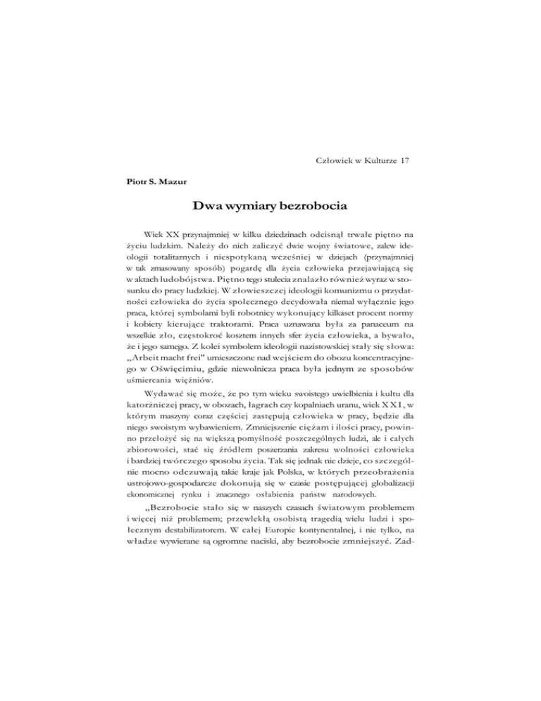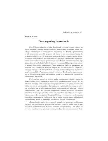 Człowiek w Kulturze 17 Piotr S. Mazur Dwa wymiary bezrobocia Wiek XX przynajmniej w kilku dziedzinach odcisnął trwałe piętno na życiu ludzkim. Należy do nich zaliczyć dwie wojny światowe, zalew ide ologii totalitarnych i niespotykaną wcześniej w dziejach (przynajmniej w tak zmasowany sposób) pogardę dla życia człowieka przejawiającą się w aktach ludobójstwa. Piętno tego stulecia znalazło również wyraz w sto sunku do pracy ludzkiej. W złowieszczej ideologii komunizmu o przydat ności człowieka do życia społecznego decydowała niemal wyłącznie jego praca, której symbolami byli robotnicy wykonujący kilkaset procent normy i kobiety kierujące traktorami. Praca uznawana była za panaceum na wszelkie zło, częstokroć kosztem innych sfer życia człowieka, a bywało, że i jego samego. Z kolei symbolem ideologii nazistowskiej stały się słowa: „Arbeit macht frei" umieszczone nad wejściem do obozu koncentracyjne go w Oświęcimiu, gdzie niewolnicza praca była jednym ze sposobów uśmiercania więźniów. Wydawać się może, że po tym wieku swoistego uwielbienia i kultu dla katorżniczej pracy, w obozach, łagrach czy kopalniach uranu, wiek X X I , w którym maszyny coraz częściej zastępują człowieka w pracy, będzie dla niego swoistym wybawieniem. Zmniejszenie ciężam i ilości pracy, powin no przełożyć się na większą pomyślność poszczególnych ludzi, ale i całych zbiorowości, stać się źródłem poszerzania zakresu wolności człowieka i bardziej twórczego sposobu życia. Tak się jednak nie dzieje, co szczegól nie mocno odczuwają takie kraje jak Polska, w których przeobrażenia ustrojowo-gospodarcze dokonują się w czasie postępującej globalizacji ekonomicznej rynku i znacznego osłabienia państw narodowych. „Bezrobocie stało się w naszych czasach światowym problemem i więcej niż problemem; przewlekłą osobistą tragedią wielu ludzi i spo łecznym destabilizatorem. W całej Europie kontynentalnej, i nie tylko, na władze wywierane są ogromne naciski, aby bezrobocie zmniejszyć. Zad- 86 Piotr S. Mazur nemu rządowi nie udaje się to, mimo stosowania kosztownych i efeme rycznych środków, np. w postaci robót publicznych, które mogą powo dować wręcz wzrost bezrobocia. [...] dzisiejsze bezrobocie na świecie jest nieuchronną konsekwencją obecnej fazy cyklu światowego popytu i tech nologii. Jesteśmy akurat w fazie powszechnej »nadwyzki wszystkiego«. [...] W tej fazie występuje nadmiar zarówno surowców, jak i wyrobów goto wych, a zatem i bezrobocie" . Zjawisko bezrobocia wśród ludzi, którzy aktywnie poszukują pracy, traktowane jest jako jeden z największych problemów naszych czasów. Praca przestała być środkiem, stała się w przypadku wielu ludzi celem ich życia i swoistą formą zniewolenia nowego tysiąclecia. Dzieje się tak dlate go, że narasta proces jej odhumanizowania i oderwania od dobra człowie ka . Żeby jednak zrozumieć problem bezrobocia, trzeba odnieść się wła śnie do pracy i jej roli w życiu człowieka. 1 2 1. Praca - dobro ekonomiczne czy osobowe? Pracę można różnie definiować. Dla Jacka Woronieckiego jest nią „każdy wysiłek człowieka, czy to jego mięśni, czy umysłu, mający na celu przetworzenie otaczającego nas świata i nadawanie mu nowej wartości; pożytecznej dla niego samego i innych" . Zasadniczo można wskazać kilka momentów charakterystycznych pracy ludzkiej. Jest ona działaniem świa domym, związanym z wysiłkiem fizycznym lub umysłowym, wymagają cym pewnej organizacji, a nakierowana jest na wytworzenie koniecznych dla rozwoju i życia człowieka dóbr. Czasy współczesne są areną ścierania się dwóch wielkich koncepcji ludzkiej pracy. Pierwsza z nich pracę przyporządkowuje wyłącznie pra3 E . Luttwak, Turbokapitaliząt. Zwycięzcy i przegrani światowej gospodarki, tłum. E . Kania, Wro cław 2000, s. 125. Zagadnienia społeczne, w tym dotyczące dehumanizacji pracy i bezrobocia, wielokrotnie poruszał papież Jan Paweł II, m.in. w encyklikach: Labore/» exercens, Sollicitudo rei socialis oraz Centesimus annus. J. Woroniecki, Katolicka etyka wychowawcza, t. II/2, Lublin 1986, s. 88. T. Ślipko określa na tomiast pracę jako „rozumne i planowo wykonywane działanie, polegające na zużywaniu fizyczno-psychicznej energii osoby ludzkiej i zmierzające do zaspokojenia potrzeb w zakre sie warunków niezbędnych do życia i rozwoju człowieka przez wytwarzanie sposobnych po temu dóbr różnych od doznawanej przy tym przyjemności", tenże: Zarys etyki szczegóło we/, 1.1, Kraków 2005, s. 401. 1 2 3 Dwa wymiary bezrobocia 87 wom ekonomii, traktując ją jako jeden z elementów wytwarzania dóbr konsumpcyjnych. Praca człowieka traktowana jest tu jedynie w katego riach produkcji. Na czoło wysuwa się technika z szerokimi możliwościami jej zastosowania w produkcji do tego stopnia, że bez wyspecjalizowanych narzędzi sam człowiek, nawet przy ogromnym wysiłku, nie jest w stanie zastąpić maszyn, np. przy produkcji komputerów. Działanie człowieka zo staje tu zredukowane do jednej z form aktywności wyznaczonej przez technologiczne wymogi jakiegoś rodzaju produkcji. Mówiąc prościej, technika w coraz mniejszym stopniu staje się narzędziem pracy człowieka, wręcz odwrotnie, człowiek coraz częściej staje się dodatkiem do pracy ma szyn i jej narzędziem, a jego rola sprowadza się do niezbędnej ich obsługi i serwisowania. W ten sposób wytwarzanie dóbr, na skutek rozwoju prze mysłowego, oderwane zostaje od swojego podłoża (człowieka) i przyporządkowane jedynie do wytworzenia produktu. W rezultacie z racji technicznych zmienia się nie tylko zapotrzebowanie na ilość pracy czło wieka, ale również na jej rodzaj. Wraz z tym zmianie ulega również miejsce człowieka. Z głównego organizatora i podmiotu pracy człowiek stał się dziś jednym z jej elementów. Pojawił się więc problem wcześniej właści wie 