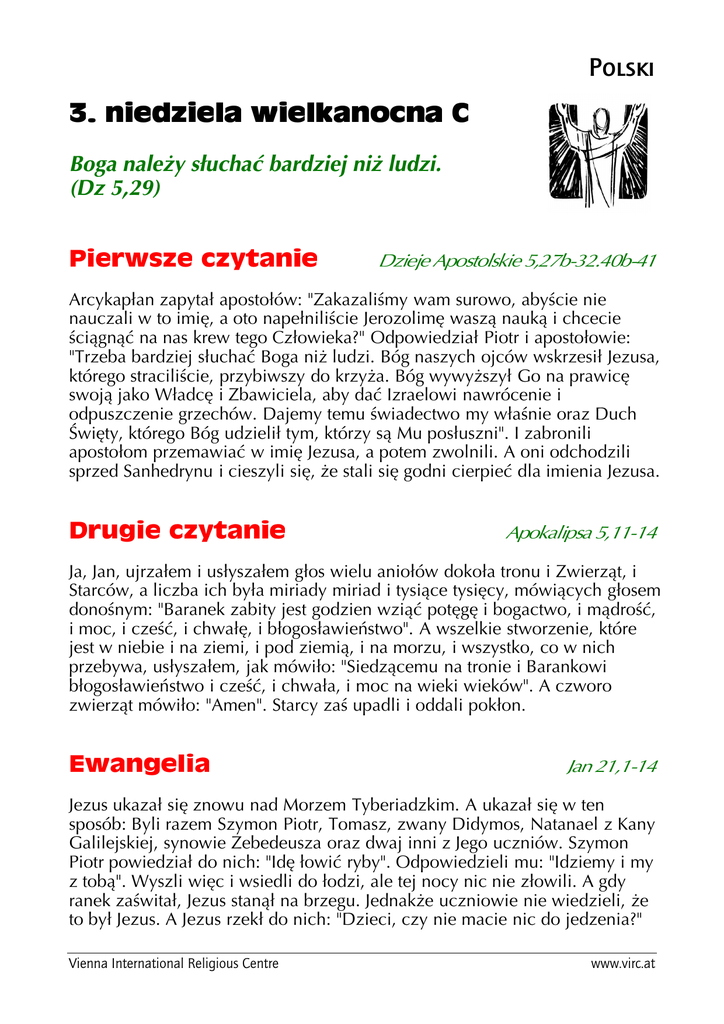 Polski Boga należy słuchać bardziej niż ludzi. (Dz 5,29) Arcykapłan zapytał apostołów: "Zakazaliśmy wam surowo, abyście nie nauczali w to imię, a oto napełniliście Jerozolimę waszą nauką i chcecie ściągnąć na nas krew tego Człowieka?" Odpowiedział Piotr i apostołowie: "Trzeba bardziej słuchać Boga niż ludzi. Bóg naszych ojców wskrzesił Jezusa, którego straciliście, przybiwszy do krzyża. Bóg wywyższył Go na prawicę swoją jako Władcę i Zbawiciela, aby dać Izraelowi nawrócenie i odpuszczenie grzechów. Dajemy temu świadectwo my właśnie oraz Duch Święty, którego Bóg udzielił tym, którzy są Mu posłuszni". I zabronili apostołom przemawiać w imię Jezusa, a potem zwolnili. A oni odchodzili sprzed Sanhedrynu i cieszyli się, że stali się godni cierpieć dla imienia Jezusa. Ja, Jan, ujrzałem i usłyszałem głos wielu aniołów dokoła tronu i Zwierząt, i Starców, a liczba ich była miriady miriad i tysiące tysięcy, mówiących głosem donośnym: "Baranek zabity jest godzien wziąć potęgę i bogactwo, i mądrość, i moc, i cześć, i chwałę, i błogosławieństwo". A wszelkie stworzenie, które jest w niebie i na ziemi, i pod ziemią, i na morzu, i wszystko, co w nich przebywa, usłyszałem, jak mówiło: "Siedzącemu na tronie i Barankowi błogosławieństwo i cześć, i chwała, i moc na wieki wieków". A czworo zwierząt mówiło: "Amen". Starcy zaś upadli i oddali pokłon. Jezus ukazał się znowu nad Morzem Tyberiadzkim. A ukazał się w ten sposób: Byli razem Szymon Piotr, Tomasz, zwany Didymos, Natanael z Kany Galilejskiej, synowie Zebedeusza oraz dwaj inni z Jego uczniów. Szymon Piotr powiedział do nich: "Idę łowić ryby". Odpowiedzieli mu: "Idziemy i my z tobą". Wyszli więc i wsiedli do łodzi, ale tej nocy nic nie złowili. A gdy ranek zaświtał, Jezus stanął na brzegu. Jednakże uczniowie nie wiedzieli, że to był Jezus. A Jezus rzekł do nich: "Dzieci, czy nie macie nic do jedzenia?" Vienna International Religious Centre www.virc.at Odpowiedzieli Mu: "Nie". On rzekł do nich: "Zarzućcie sieć po prawej stronie łodzi, a znajdziecie". Zarzucili więc i z powodu mnóstwa ryb nie mogli jej wyciągnąć. Powiedział więc do Piotra ów uczeń, którego Jezus miłował: "To jest Pan!" Szymon Piotr usłyszawszy, że to jest Pan, przywdział na siebie wierzchnią szatę, był bowiem prawie nagi, i rzucił się w morze. Reszta uczniów dobiła łodzią, ciągnąc za sobą sieć z rybami. Od brzegu bowiem nie było daleko, tylko około dwustu łokci. A kiedy zeszli na ląd, ujrzeli żarzące się na ziemi węgle, a na nich ułożoną rybę oraz chleb. Rzekł do nich Jezus: "Przynieście jeszcze ryb, któreście teraz ułowili". Poszedł Szymon Piotr i wyciągnął na brzeg sieć pełną wielkich ryb w liczbie stu pięćdziesięciu trzech. A pomimo tak wielkiej ilości sieć się nie rozerwała. Rzekł do nich Jezus: "Chodźcie, posilcie się!" Żaden z uczniów nie odważył się zadać Mu pytania: "Kto Ty jesteś?", bo wiedzieli, że to jest Pan. A Jezus przyszedł, wziął chleb i podał im, podobnie i rybę. To już trzeci raz, jak Jezus ukazał się uczniom od chwili, gdy zmartwychwstał. "Idę łowić ryby." – rzekł Piotr, a pozostali uczniowie poszli z nim. Cóż bowiem można innego robić. Wielkanoc minęła. Codzienność znów wzięła ich (i nas) w swoje ręce. Oni idą łowić; my udajemy się do biura, szkoły, do pieca w kuchni. Każdy łowi znów w morzu swojej codzienności ... podobnie jak uczniowie! Tej jednak nocy nic nie złowili. Puste ręce, doświadczenie bezskuteczności. Bezcelowe trudzenie się! Niepotrzebna troska! Któż tego nie zna? Taka jest codzienność. Wtedy i dzisiaj. A potem pytanie: czy macie coś do jedzenia? – To jest pytanie skierowane do nas, o to, czy mamy coś, z czego możemy żyć – prawdziwie móc żyć. Oni odpowiedzieli: "Nie!" Nie mamy niczego: puste, biedne ręce, głodne żołądki, pragnące serca. Sami z siebie nie mamy niczego. Nic, co zaspokoiłoby nasz głód. Nic, co rozjaśniłoby naszą ciemność. Nic, co wypełniłoby naszą pustkę. On zaś rzekł: zarzućcie sieci! Co oznacza: podejmijcie trud jeszcze raz! Jeszcze raz zanurzcie się w bezskuteczności, wejdźcie w niepowodzenie. Wejdźcie na Moje słowo. A wówczas dokona się cud pełni. Z bezskuteczności wyprowadzone będzie doświadczenie pełni i spełnienia. Pocieszająca Ewangelia. Jakżeż często trudno jest wierzyć w codzienności. Doświadczenie bezskuteczności pomniejsza nas, popycha nas w rezygnację i pogrąża w lęku. Czujemy, że gubimy się w małostkowym sporze i poklasku, przegrywamy nasz czas, zamiast postawić sobie w takiej sytuacji pytanie o przetrwanie. A właśnie tam stoi Jezus i zaprasza. On mówi: nie chodzi o was, o wasze pomysły i koncepty! Chodzi o to, czy wprowadzacie Zmartwychwstałego w wasze życie. Nie musicie więc niczego robić. Ja wam to podaruję – za darmo. Nie ma obrazu wielkanocnego, który przedstawiałby Zmartwychwstałego bez ran. Może jest to znak misterium, w którym Wielkanoc rozświeca wszystkich zranionych? Cierpienia i rany nie są uprzątnięte z drogi (nie ignoruje się bezskuteczności w naszym życiu), lecz dzięki wielkanocnej tajemnicy zaczynają promieniować, otrzymują nowy wymiar. Chrystus zaprasza nas do siebie, aby w naszym życiu ciągle dokonywała się Wielkanoc. Obdarowuje nas swoją obecnością, która daje siłę i moc. "Bierzcie i jedzcie!" (Wilhelm Benning) Vienna International Religious Centre [email protected] Boga należy słuchać bardziej niż ludzi. (Dz 5,29) Arcykapłan zapytał apostołów: "Zakazaliśmy wam surowo, abyście nie nauczali w to imię, a oto napełniliście Jerozolimę waszą nauką i chcecie ściągnąć na nas krew tego Człowieka?" Odpowiedział Piotr i apostołowie: "Trzeba bardziej słuchać Boga niż ludzi. Bóg naszych ojców wskrzesił Jezusa, którego straciliście, przybiwszy do krzyż