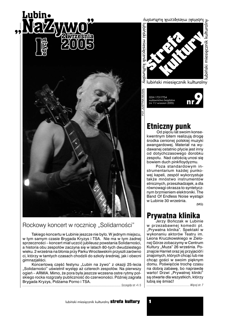 FOT. JUSTYNA MUSIAŁ ISSN 17317754 wydawnictwo bezpłatne (nr 11/ wrzesień 2005) 9 nr Etniczny punk Od pięciu lat swoim konsekwentnym bitem realizują drogę środka cenionej polskiej muzyki awangardowej. Materiał na wydawanej ostatnio płycie jest inny od dotychczasowego dorobku zespołu. Nad całością unosi się bowiem duch pinkfloydyzmu. Poza standardow ym instrumentarium każdej punkowej kapeli, zespół wykorzystuje także mnóstwo instrumentów etnicznych, przeszkadzajek, a dla równowagi okrasza to syntetycznym brzmieniem elektroniki. The Band Of Endless Noise wystąpi w Lubinie 30 września. (MG) Prywatna klinika Rockowy koncert w rocznicę „Solidarności” Takiego koncertu w Lubinie jeszcze nie było. W jednym miejscu, w tym samym czasie Brygada Kryzys i TSA. Nie ma w tym żadnej sprzeczności – koncert miał uczcić jubileusz powstania Solidarności, a historia obu zespołów zaczyna się w latach 80-tych dwudziestego wieku. 2 września na błonia przy Parku Wrocławskim przyszli zarówno ci, którzy w tamtych czasach chodzili do szkoły średniej, jak i obecni gimnazjaliści. Koncertową część festynu „Lubin na żywo” z okazji 25-lecia „Solidarności” uświetnił występ aż czterech zespołów. Na pierwszy ogień – ARMIA. Mimo, że pora była jeszcze wczesna ostre rytmy polskiego rocka rozgrzały publiczność do czerwoności. Później zagrała Brygada Kryzys, Pidżama Porno i TSA. ............................................................................................................................................. Szczegóły str. 4 i 5 lubiński miesięcznik kulturalny strefa kultury Jerzy Bończak w Lubinie w przezabawnej komedii pt. „Prywatna klinika”. Spektakl w wykonaniu aktorów Teatru im. Leona Kruczkowskiego w Zielonej Górze zobaczymy w Centrum Kultury „Muza” 26 września. Poznajcie Harriet oraz jej przyjaciół i znajomych, których chcąc lub nie chcąc gości w swoim pięknym domu. Poświęćcie trochę czasu na dobrą zabawę, bo naprawdę warto! Drzwi „Prywatnej kliniki” są otwarte dla wszystkich, którzy lubią się śmiać! .............................................................. Więcej str. 7 1 polecamy Kinowe hity poleca Irek Wojtków Repertuar kina „Muza” – kalendarium 21 września – 29 września Polowanie na druhny 21 IX ŚRODA Są wspólnikami nie tylko w życiu zawodowym. Łączy ich także nietypowe hobby. John Beckwith i Jeremy Grey… wkręcają się na wesela, bez względu na ich etniczny charakter. Na poczekaniu wymyślają inteligentną historyjkę dla wścibskich gości i stają się duszą towarzyst wa ka żdego przyjęcia weselnego. Komedia romantyczna produkcji USA z 2005 r. 16.00, 17.30 > MAGICZNA KARUZELA > W.BR /b/o/12 i 14, DS 17.00, 21.30 > DOM WOSKOWYCH CIAŁ > USA /15/12,SK 19.00, 21.15 > IMPERIUM WILKÓW > FRA /15/12 i 14,DS 19.15 > SMAK ŻYCIA 2 > FRA /15/12,SK Reżyseria: David Dobkin W rolach głównych: Owen Wilson, Vince Vaughn, Christopher Walken, Rachel McAdams, Isla Fisher > 22 IX CZWARTEK 16.00, 17.30 > MAGICZNA KARUZELA > W.BR /b/o/12 i 14, DS 17.00, 21.30 > DOM WOSKOWYCH CIAŁ > USA /15/12,SK 19.00, 21.15 > IMPERIUM WILKÓW > FRA /15/12 i 14,DS 19.15 > SMAK ŻYCIA 2 > FRA /15/12,SK > 23 IX PIĄTEK 16.00 > MAGICZNA KARUZELA > W.BR /b/o/12 i 14, SK 16.15, 18.30, 20.45 > POLOWANIE NA DRUHNY - premiera > USA /15/12 i 14,DS 17.30 > GRA WSTĘPNA > JAP /15/12,SK 19.30 > CZAS SURFERÓW > POL /15/12,SK 21.15 > EDUKATORZY > NIEM /15/12,SK > 24 IX SOBOTA Kontrolerzy Historia o dziwnym młodzieńcu Bulcsu, jego sympatycznych kolegach, konkurencji wśród kanarów, pogoni wzdłuż torów. Jednocześnie historia miłosna F i l m p r o d u kc j i w ę g i e r s k i e j z 2003 r. Reżyseria: Antal Nimród W rolach głównych: Sandor Csanyi, Zoltan Mucsi, Csaba Pindroch, Sandor Badar Oliver Twist Anglia, około 1830 r. Oliver Twist przebywa w zakładzie dla sierot prowadzonym przez bezwzględnego pana Bumble’a. Sprzedany właścicielowi zakładu pogrzebowego, po bójce z jego zawistnym pomocnikiem ucieka do Londynu. Tam wpada w środowisko nieletnich złodziei kieszonkowych. Jego pierwsza złodziejska wyprawa kończy się fatalnie... Dramat produkcji br y t yjskiej z 2005 r. na podstawie powieści Karola Dickensa. Reżyseria: Roman Polański W rolach głównych: Barney Clark, Ben Kingsley 16.00 > MAGICZNA KARUZELA > W.BR /b/o/12 i 14, SK 16.15, 18.30, 20.45 > POLOWANIE NA DRUHNY > USA /15/12 i 14,DS 17.30 > GRA WSTĘPNA > JAP /15/12,SK 19.30 > CZAS SURFERÓW > POL /15/12,SK 23.00 > EDUKATORZY > NIEM /15/12,DS > 25 IX NIEDZIELA 16.00 > MAGICZNA KARUZELA > W.BR /b/o/12 i 14, SK 16.15, 18.30, 20.45 > POLOWANIE NA DRUHNY > USA /15/12 i 14,DS 17.30 > GRA WSTĘPNA > JAP /15/12,SK 19.30 > CZAS SURFERÓW > POL /15/12,SK 21.15 > EDUKATORZY > NIEM /15/12,SK > 26 IX PONIEDZIAŁEK 16.00 > MAGICZNA KARUZELA > W.BR /b/o/12,-, SK 17.30 > GRA WSTĘPNA > JAP /15/10,SK 19.30 > CZAS SURFERÓW > POL /15/10,SK 21.00 > POLOWANIE NA DRUHNY > USA /15/12,-,DS 21.15 > EDUKATORZY > NIEM /15/10,SK 27 IX WTOREK 16.00 > MAGICZNA KARUZELA > W.BR /b/o/12 i 14, SK 16.15, 20.45 > POLOWANIE NA DRUHNY > USA /15/12 i 14,DS 17.30 > GRA WSTĘPNA > JAP /15/12,SK 19.00 > DKF- KONTROLERZY > WĘG /15/8 i 5K,DS 19.30 > CZAS SURFERÓW > POL /15/12,SK 21.15 > EDUKATORZY > NIEM /15/12,SK 28 IX ŚRODA 16.00 > MAGICZNA KARUZELA > W.BR /b/o/12 i 14, SK 16.15, 18.30, 20.45 > POLOWANIE NA DRUHNY > USA /15/12 i 14,DS 17.30 > GRA WSTĘPNA > JAP /15/12,SK 19.30 > CZAS SURFERÓW > POL /15/12,SK 21.15 > EDUKATORZY > NIEM /15/12,SK > 29 IX CZWARTEK 16.00 > MAGICZNA KARUZELA > W.BR /b/o/12 i 14, SK 16.15, 18.30, 20.45 > POLOWANIE NA DRUHNY > USA /15/12 i 14,DS 17.30 > GRA WSTĘPNA > JAP /15/12,SK 19.30 > CZAS SURFERÓW > POL /15/12,SK 21.15 > EDUKATORZY > NIEM /15/12,SK lubiński miesięcznik kulturalny strefa kultury 2 wokół festiwalu Koncert z Klubu „Pod Muzami” transmitowany będzie w VIVIE, kanale muzycznym w polskiej wersji języ